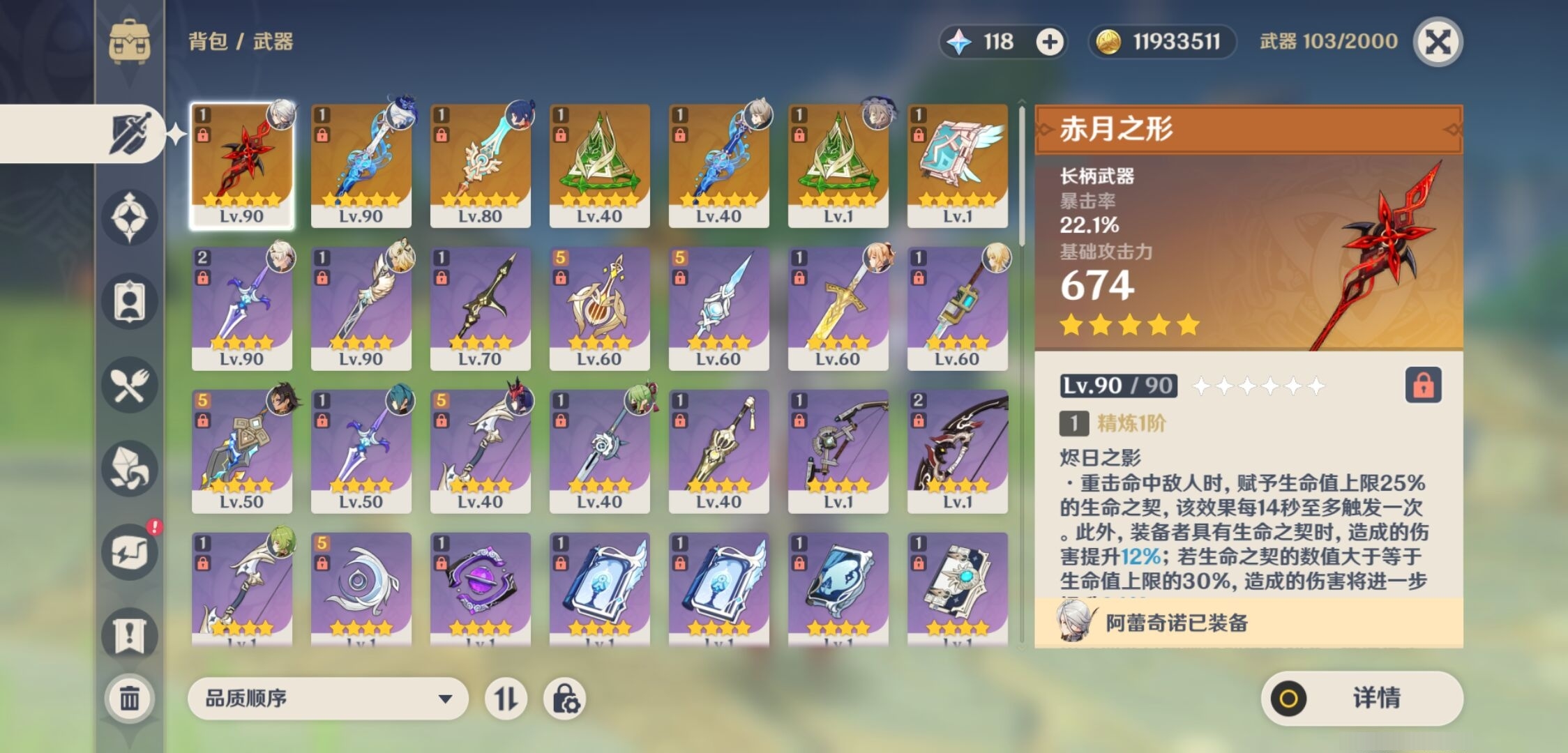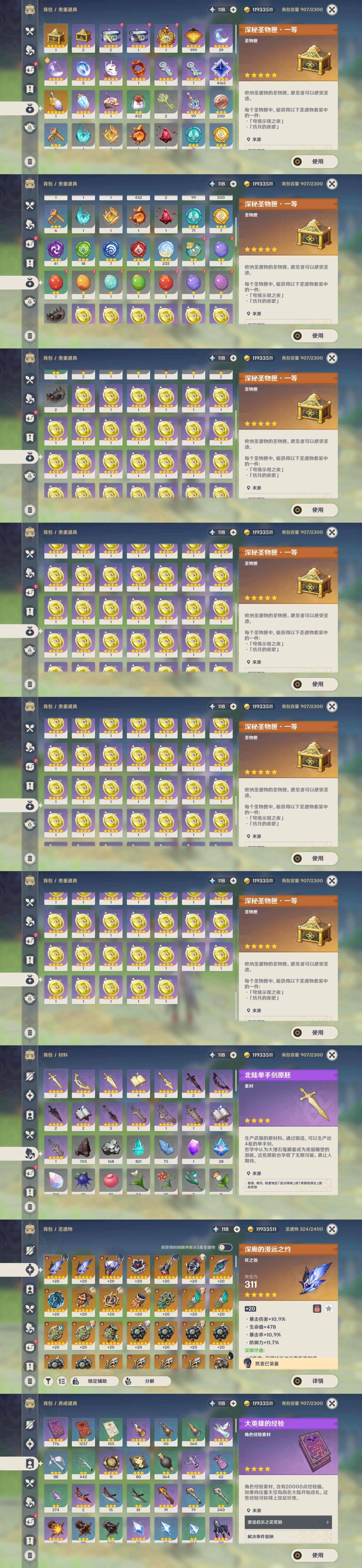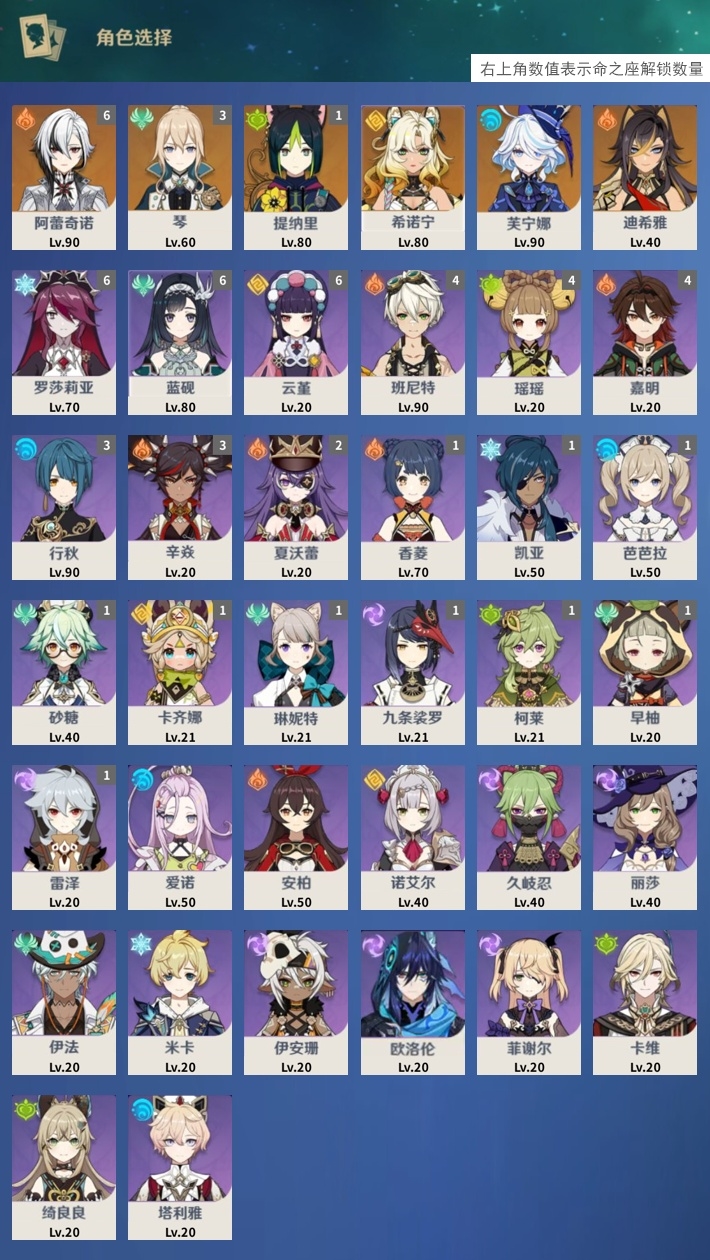 [15240150]23黄 风系:3命琴 火系:6命阿蕾奇诺/0命迪希雅 水系:0命芙宁娜 冰系: 岩系:0命希诺宁 雷系: 草系:1命提纳里 [四星角色等级及命座] 风系: 6命蓝砚/1命砂糖/1命琳妮特/0命伊法/1命早柚 火系: 4命班尼特/1命香菱/0命安柏/4命嘉明/2命夏沃蕾/3命辛焱 水系:3命行秋/0命爱诺/1命芭芭拉/0命塔利雅 冰系:6命罗莎莉亚/1命凯亚/0命米卡 岩系:0命诺艾尔/6命云堇 雷系:0命久岐忍/0命丽莎/1命九条裟罗/0命伊安珊/0命欧洛伦/0命菲谢尔/1命雷泽 草系:1命柯莱/0命卡维/4命瑶瑶/0命绮良良 [角色经验书] 紫色776/蓝色1237/绿色105 [小物品] 脆弱树脂39/异梦溶媒1/嬗变之尘452 [特殊材料] 东风之爪4/东风的吐息7/北风之尾1/北风之环8/北风的魂匣9/吞天之鲸·只角1/魔王之刃·残片1 武炼之魂·孤影4/龙王之冕1/血玉之枝1/鎏金之鳞1/智识之冕21