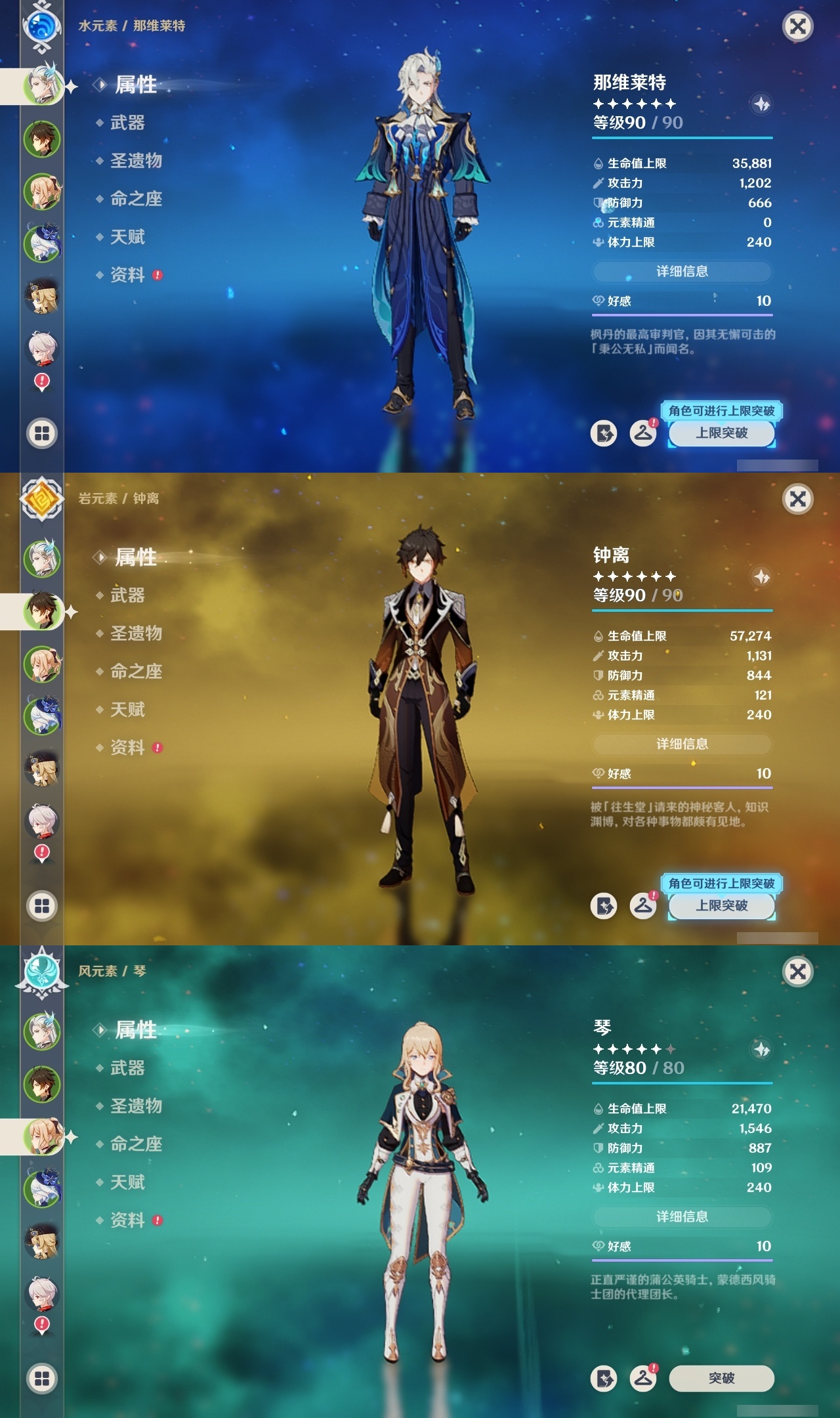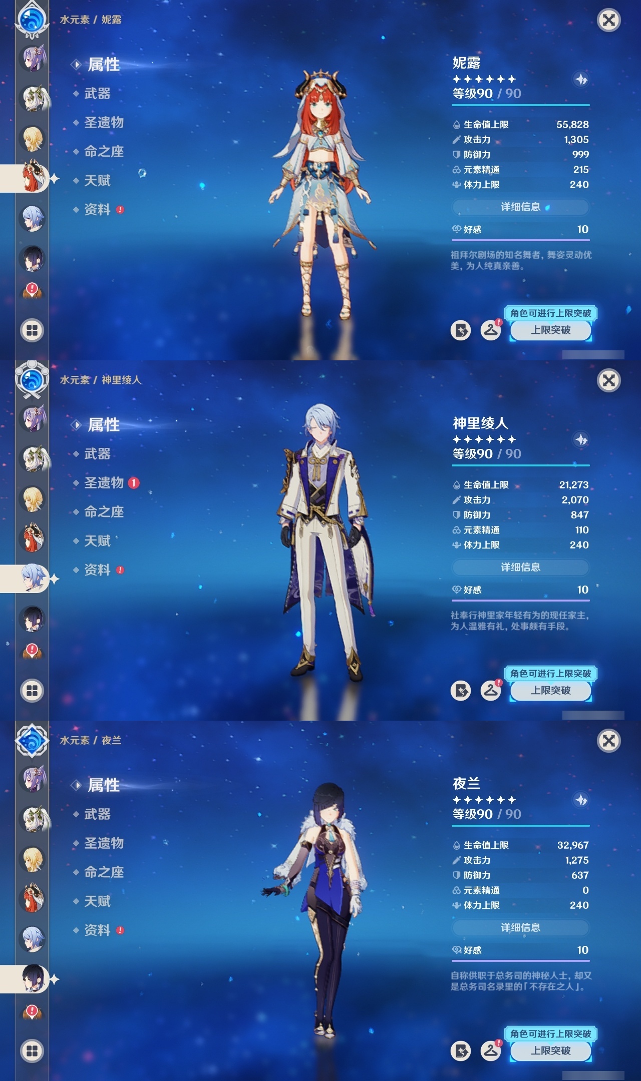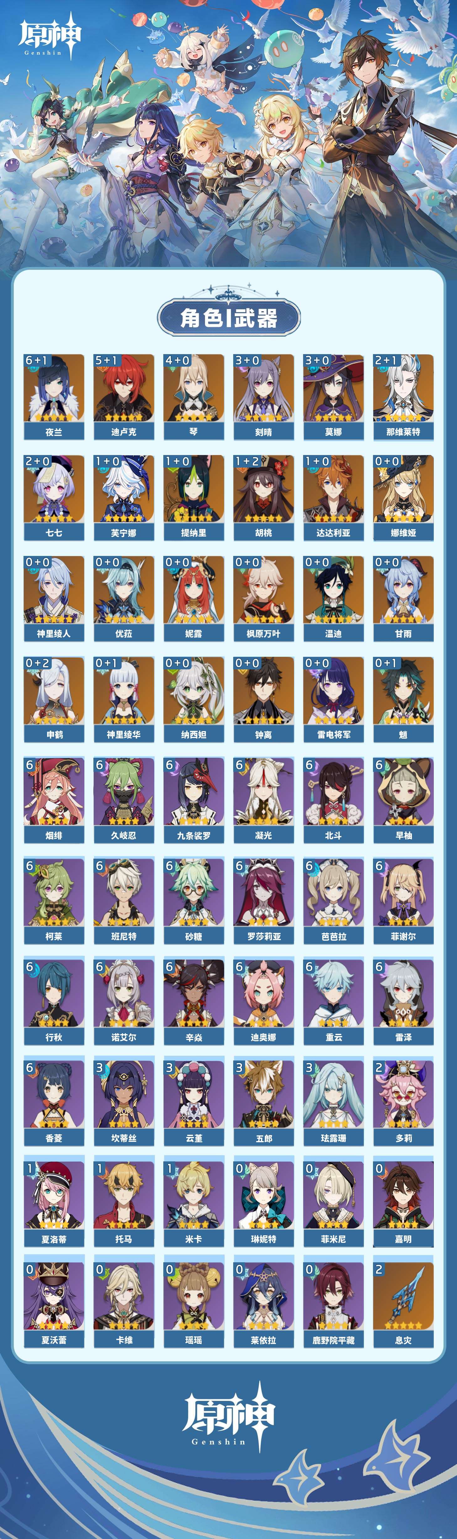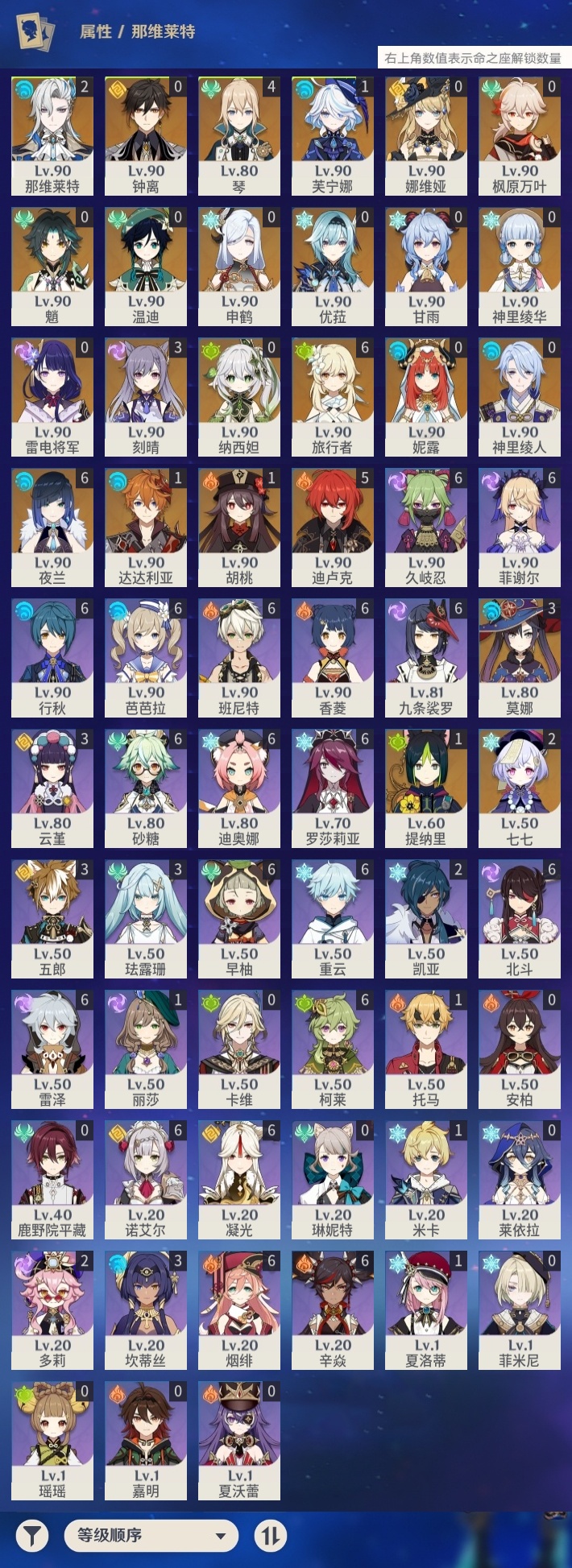 【原神】【lyys10145】冒险等级:60,五星数量:33,五星角色:夜兰 6命迪卢克 5命琴 4命刻晴 3命莫娜 3命那维莱特 2命七七 2命芙宁娜 1命达达利亚 1命胡桃 1命提纳里 1命神里绫华温迪优菈钟离申鹤神里绫人娜维娅妮露纳西妲枫原万叶甘雨魈雷电将军__五星武器:护摩之杖 2精息灾 2精万世流涌大典风鹰剑和璞鸢狼的末路天空之翼雾切之回光若水__四星角色:班尼特 6命行秋 6命九条裟罗 6命香菱 6命久岐忍 6命凝光 6命迪奥娜 6命砂糖 6命柯莱 6命芭芭拉 6命早柚 6命烟绯 6命重云 6命辛焱 6命诺艾尔 6命罗莎莉亚 6命雷泽 6命菲谢尔 6命北斗 6命珐露珊 3命坎蒂丝 3命云堇 3命五郎 3命多莉 2命米卡 1命托马 1命夏洛蒂 1命鹿野院平藏瑶瑶莱依拉卡维菲米尼琳妮特夏沃蕾嘉明