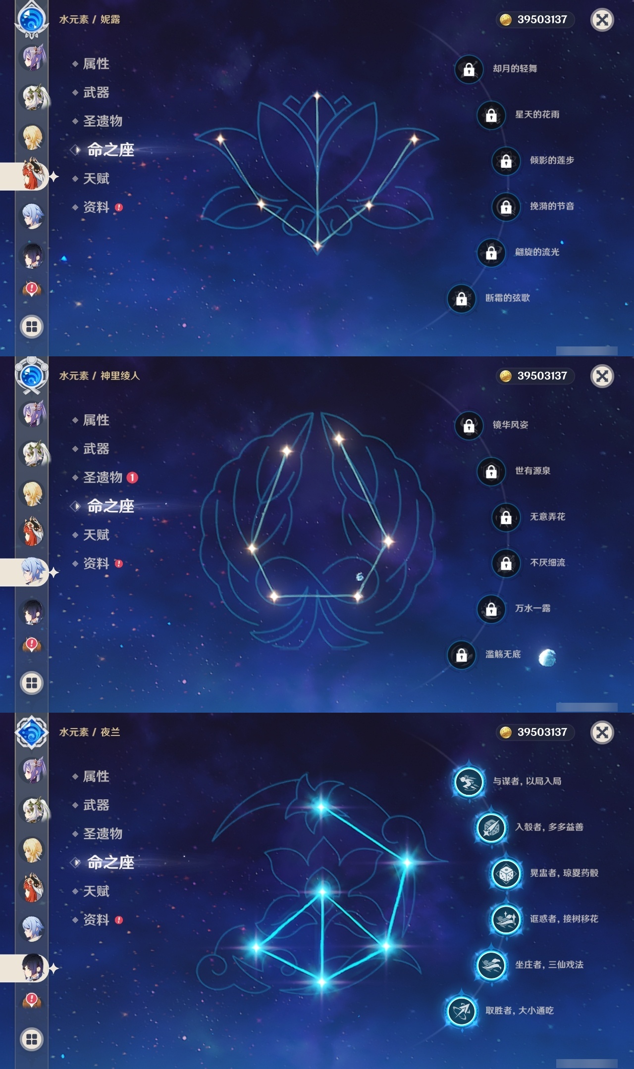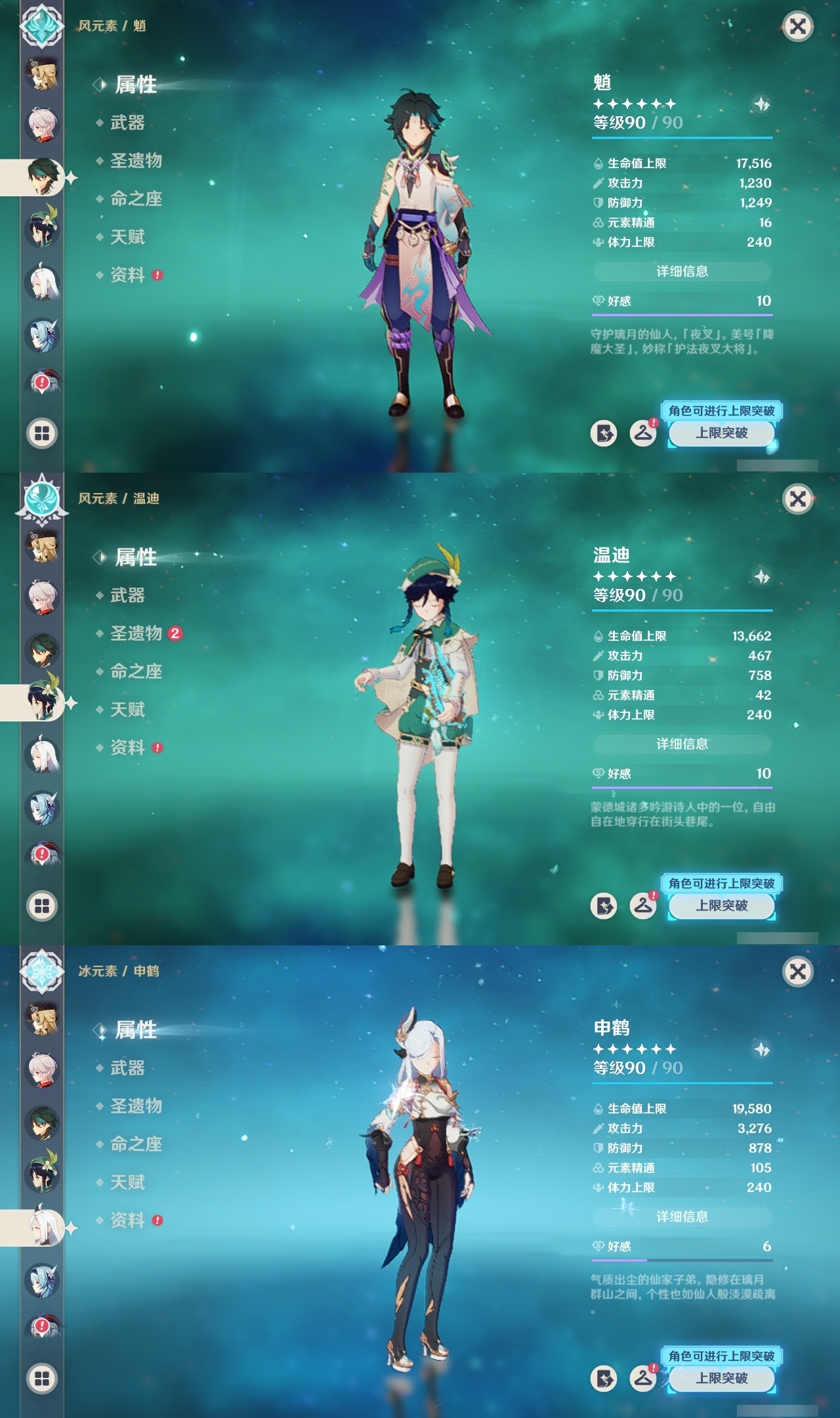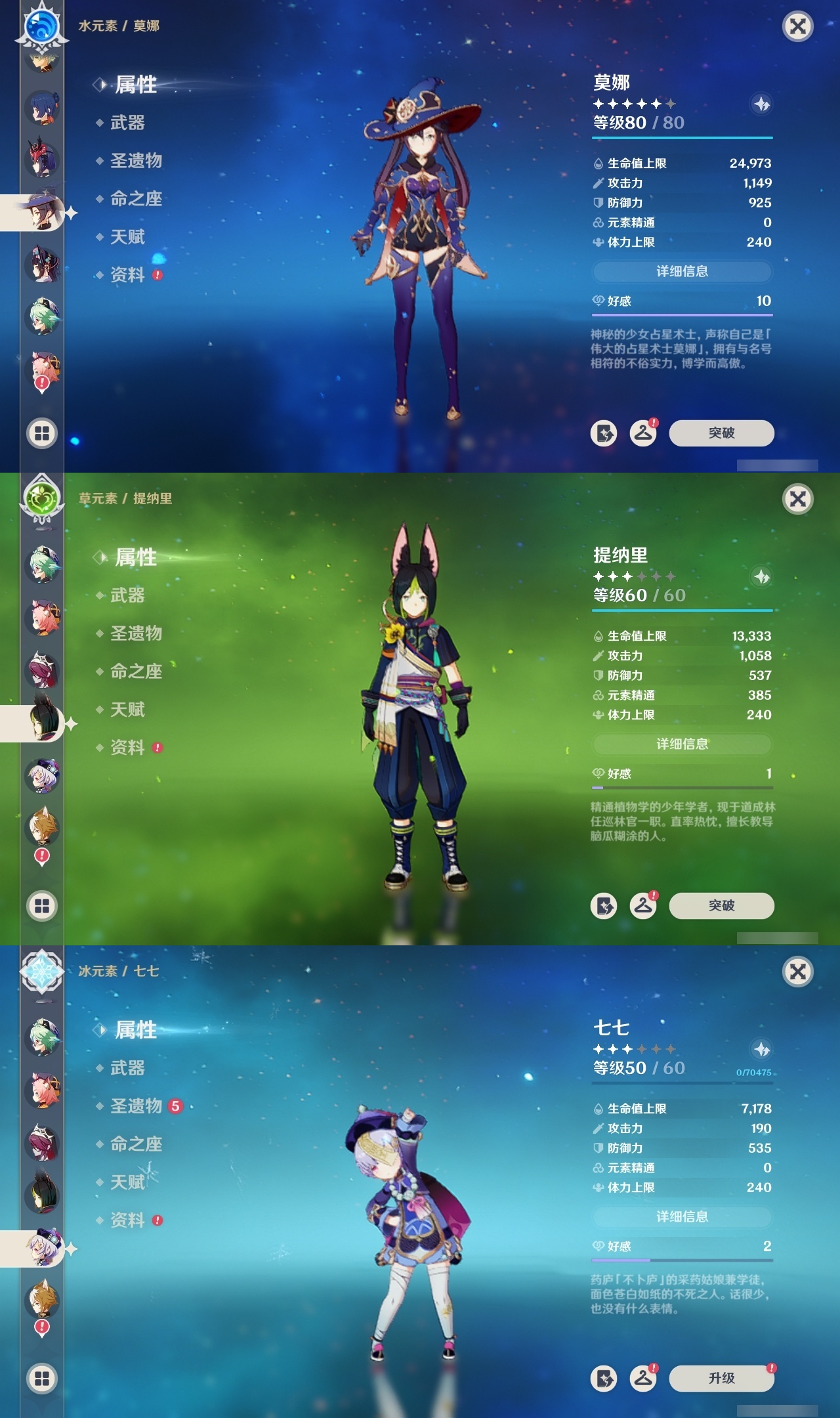 【原神】【lyys10145】冒险等级:60,五星数量:33,五星角色:夜兰 6命迪卢克 5命琴 4命刻晴 3命莫娜 3命那维莱特 2命七七 2命芙宁娜 1命达达利亚 1命胡桃 1命提纳里 1命神里绫华温迪优菈钟离申鹤神里绫人娜维娅妮露纳西妲枫原万叶甘雨魈雷电将军__五星武器:护摩之杖 2精息灾 2精万世流涌大典风鹰剑和璞鸢狼的末路天空之翼雾切之回光若水__四星角色:班尼特 6命行秋 6命九条裟罗 6命香菱 6命久岐忍 6命凝光 6命迪奥娜 6命砂糖 6命柯莱 6命芭芭拉 6命早柚 6命烟绯 6命重云 6命辛焱 6命诺艾尔 6命罗莎莉亚 6命雷泽 6命菲谢尔 6命北斗 6命珐露珊 3命坎蒂丝 3命云堇 3命五郎 3命多莉 2命米卡 1命托马 1命夏洛蒂 1命鹿野院平藏瑶瑶莱依拉卡维菲米尼琳妮特夏沃蕾嘉明