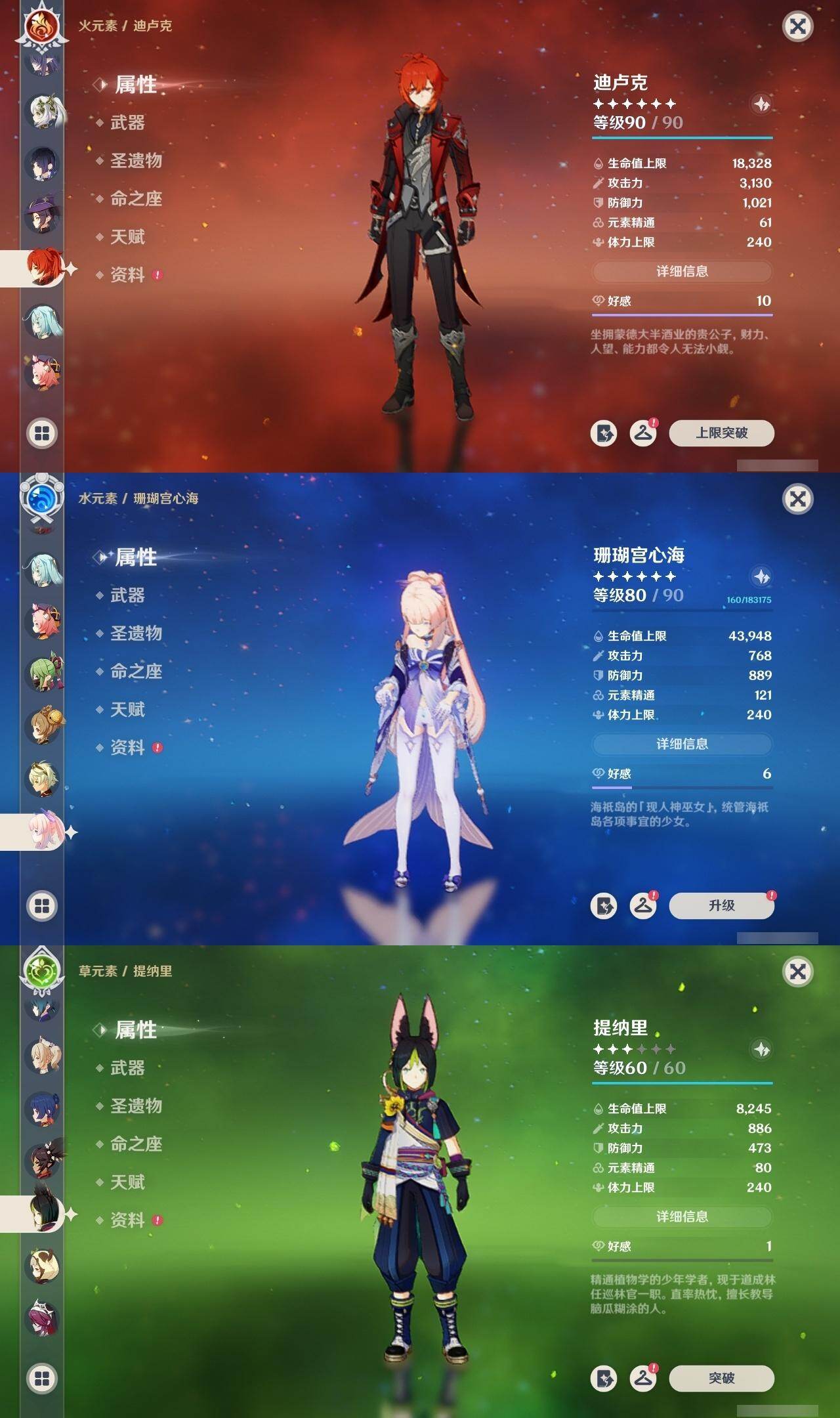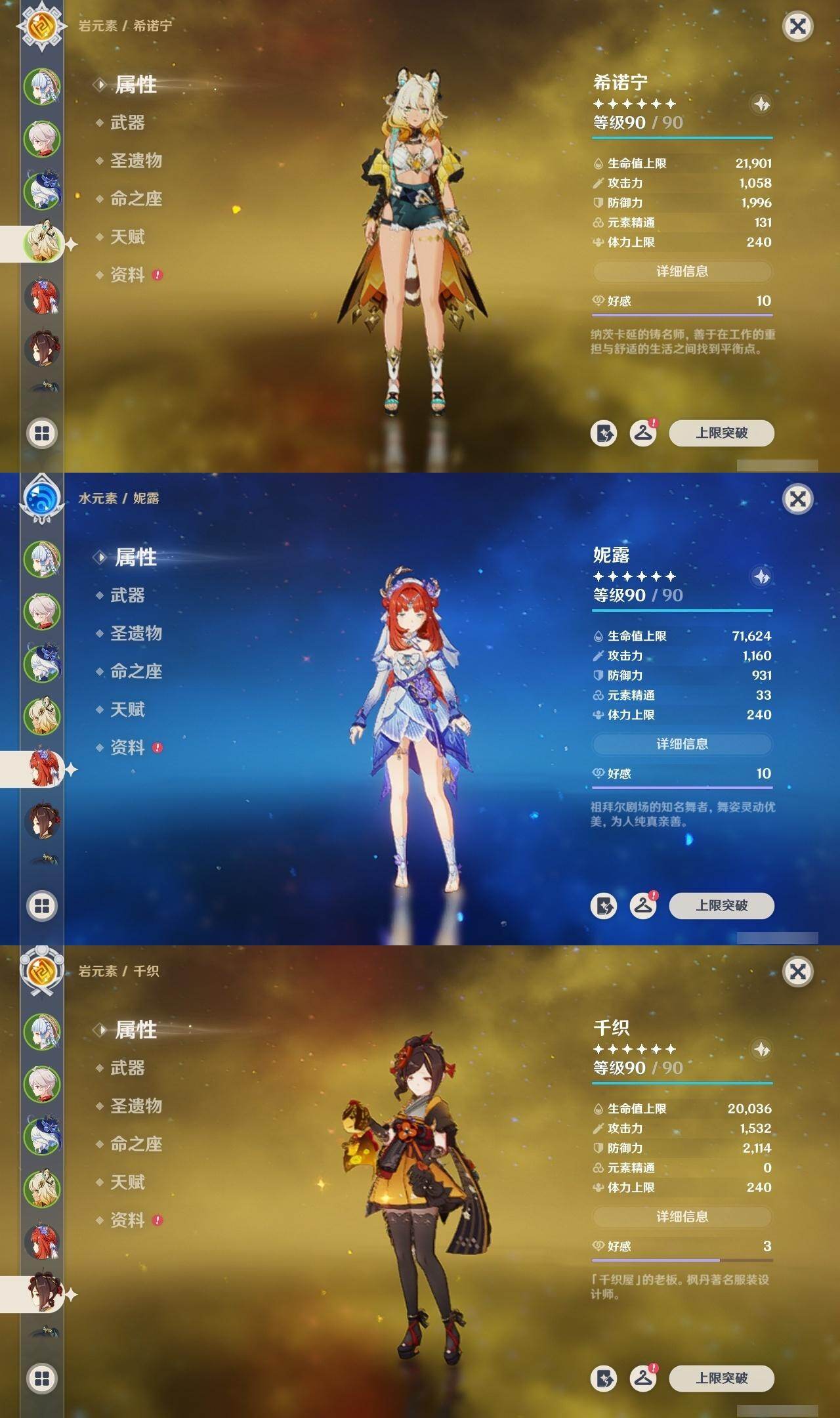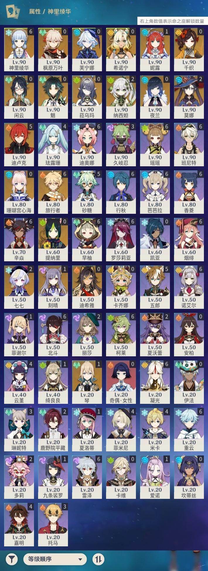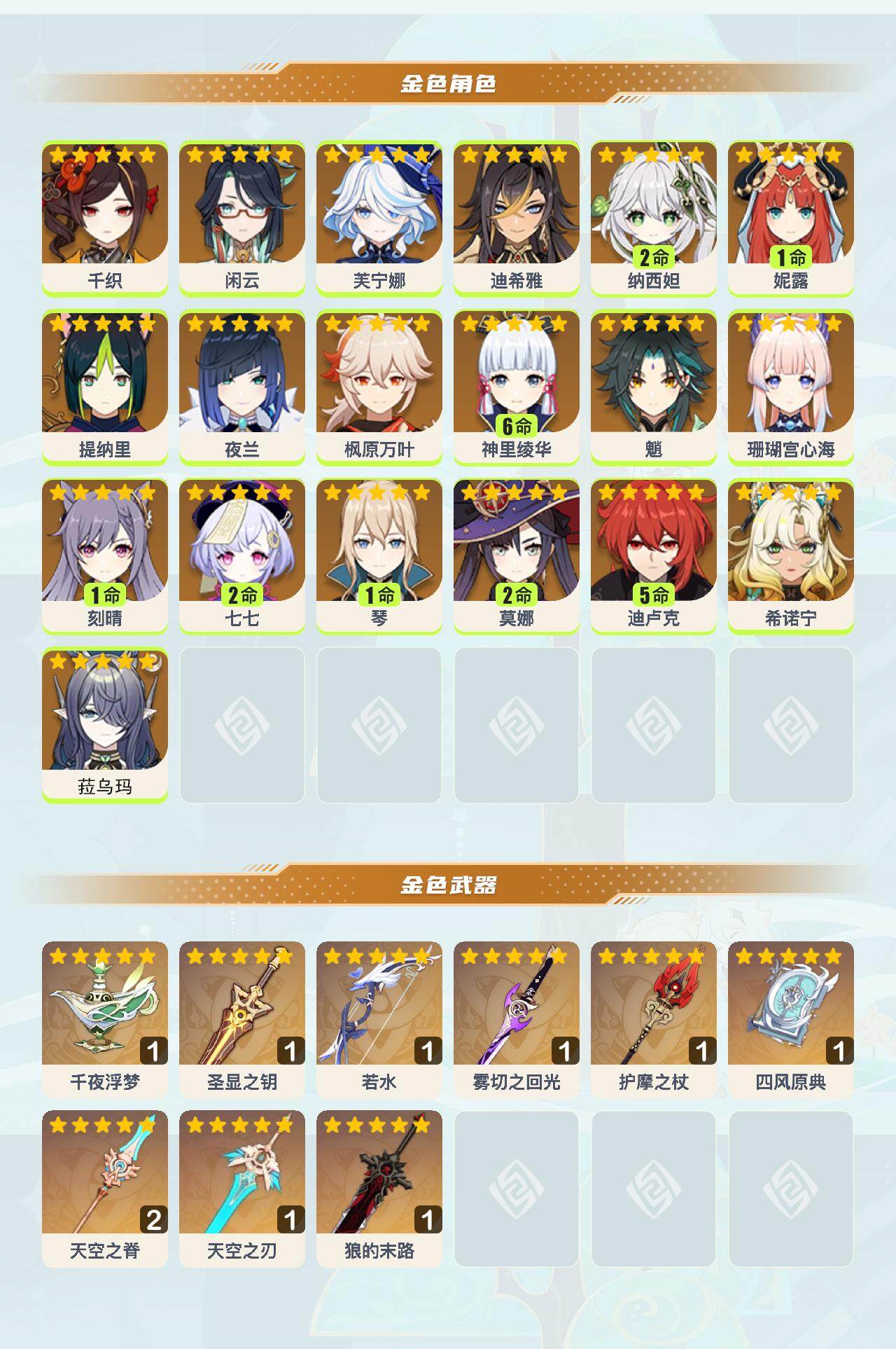 59级/49黄/男主/19个五星角色/9个五星武器 0命千织0命闲云0命芙宁娜0命迪希雅2命纳西妲1命妮露0命提纳里0命夜兰0命枫原万叶满命神里绫华0命魈0命珊瑚宫心海1命刻晴2命七七1命琴2命莫娜5命迪卢克0命希诺宁0命菈乌玛精1千夜浮梦精1圣显之钥精1若水精1雾切之回光精1护摩之杖精1四风原典精2天空之脊精1天空之刃精1狼的末路