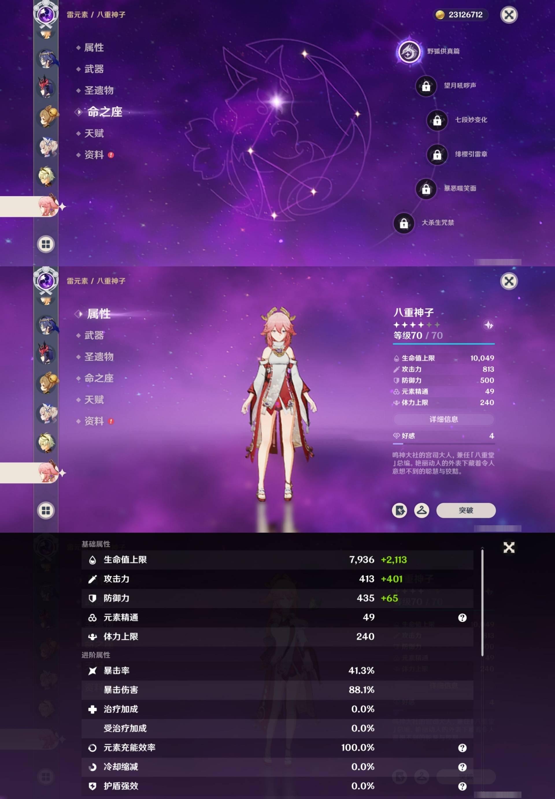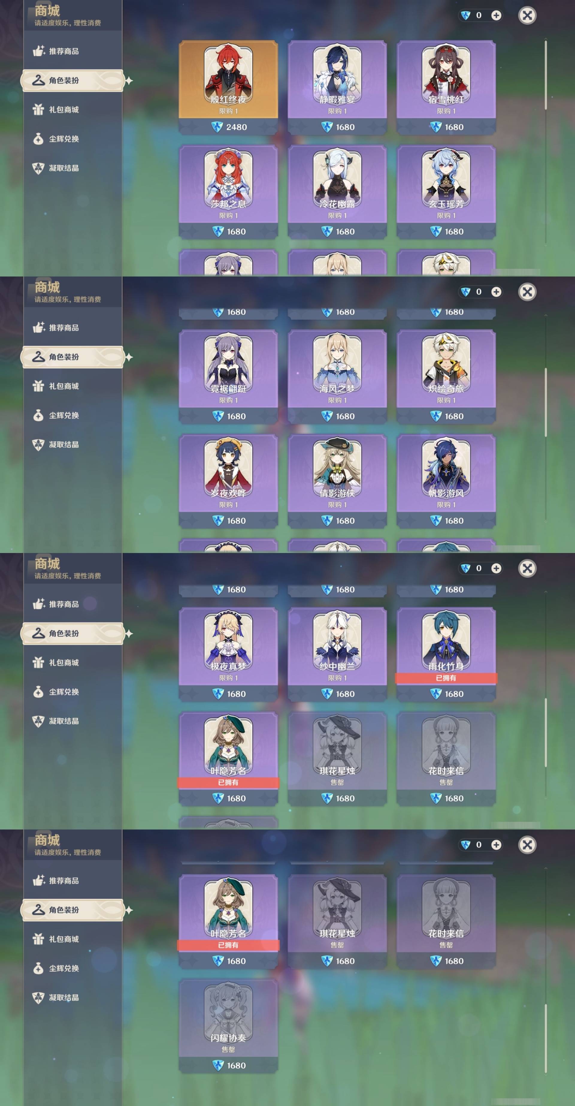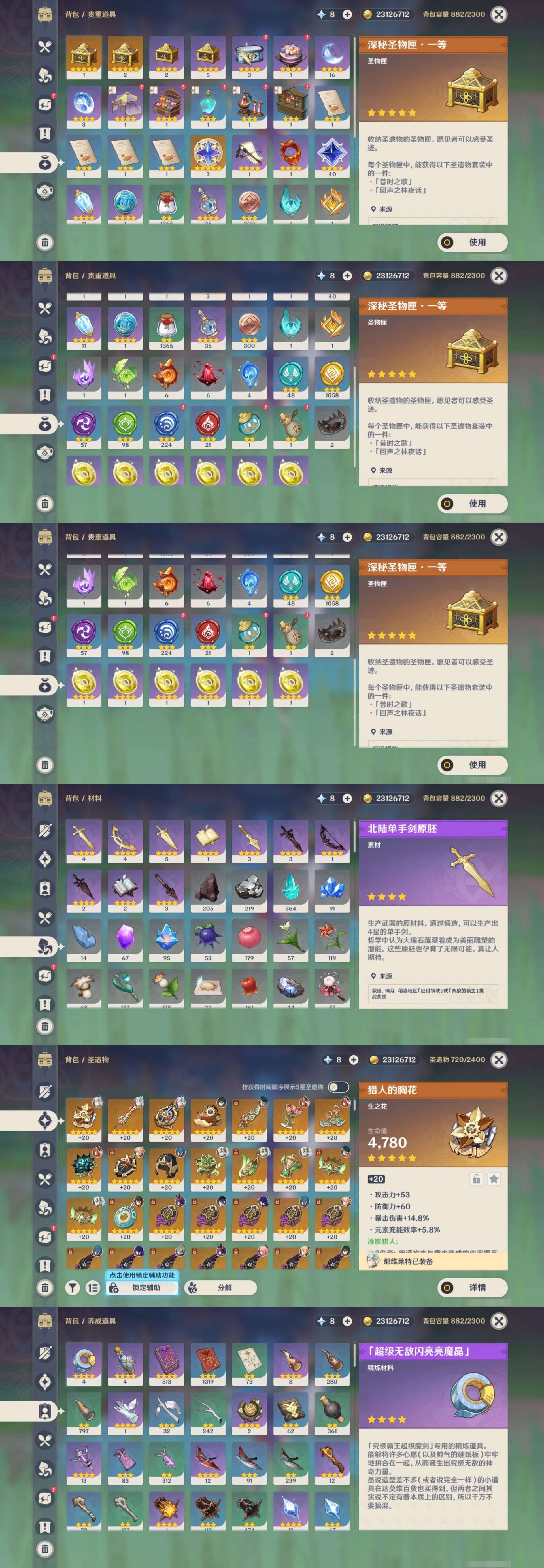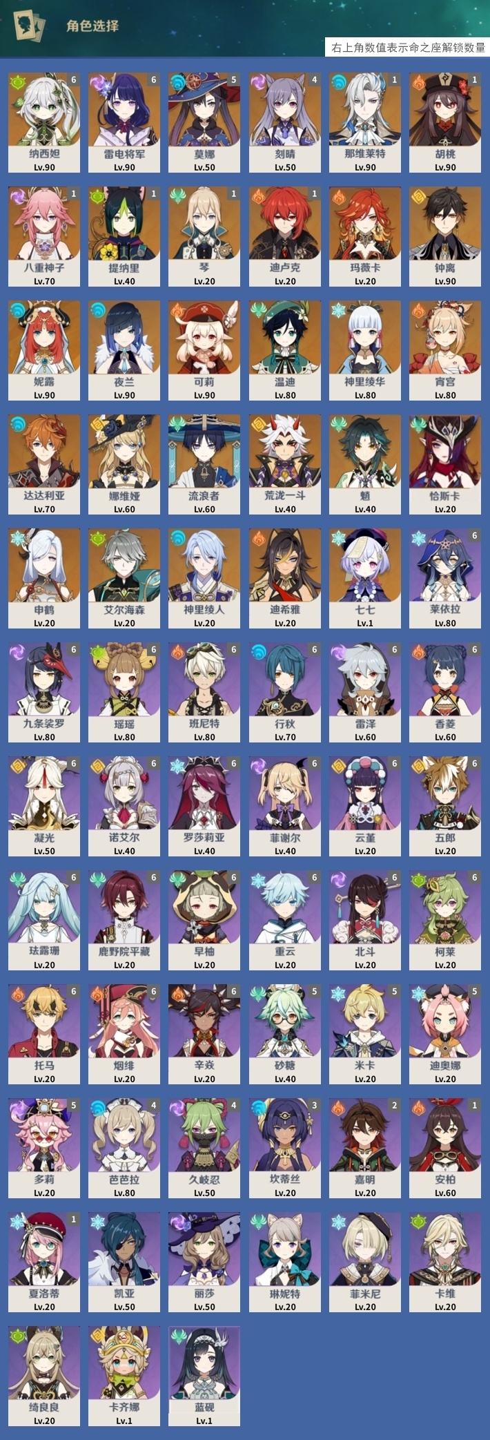 [15345143]78黄 风元素:0命温迪 0命流浪者 0命魈 0命恰斯卡 火元素:0命玛薇卡 1命胡桃 0命可莉 0命宵宫 水元素:1命那维莱特 0命妮露 0命夜兰 0命达达利亚 0命神里绫人 雷元素:6命雷电将军 1命八重神子 冰元素:0命神里绫华 0命申鹤 岩元素:0命钟离 0命娜维娅 0命荒泷一斗 草元素:6命纳西妲 0命艾尔海森 【常驻五星角色及命座】 风元素:1命琴 火元素:0命迪希雅 1命迪卢克 水元素:5命莫娜 雷元素:4命刻晴 冰元素:0命七七 草元素:1命提纳里 单手剑:精1圣显之钥 精2波乱月白经津 精1磐岩结绿 精1风鹰剑 双手剑:精1狼的末路 长柄武器:精1护摩之杖 精3薙草之稻光 法器:精1万世流涌大典 精1千夜浮梦 精1四风原典 精2图莱杜拉的回忆 精1天空之卷 精1神乐之真意 弓:精1冬极白星 精1天空之翼 精1若水 精1阿莫斯之弓 精1飞雷之弦振 【角色皮肤】 五星角色:可莉-琪花星烛 神里绫华-花时来信 四星角色:芭芭拉-闪耀协奏 行秋-雨化竹身 丽莎-叶隐芳名