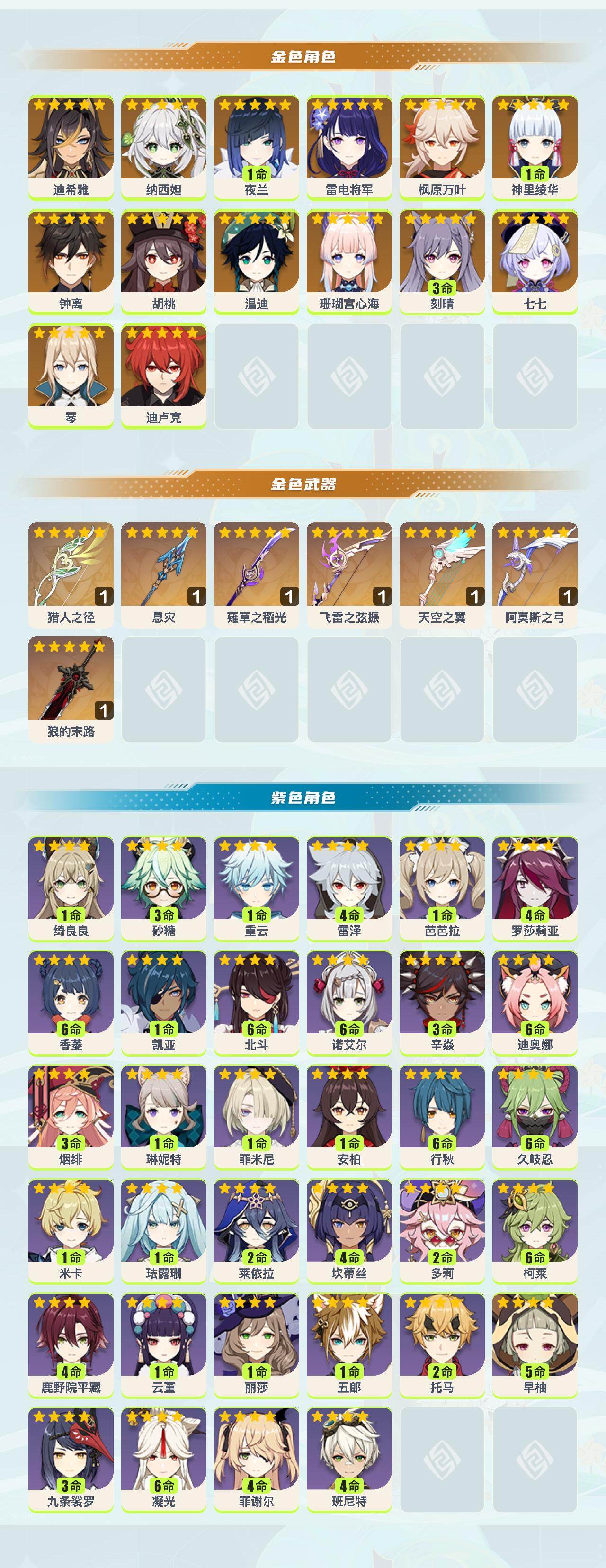 【ysyt442】58级/女主/15个五星角色/0命迪希雅/0命纳西妲/1命夜兰/0命珊瑚宫心海/0命雷电将军/1命神里绫华/0命枫原万叶/0命胡桃/0命钟离/0命温迪/0命琴/3命刻晴/0命迪卢克/0命七七/精1猎人之径/精1息灾/精1薙草之稻光/精1飞雷之弦振/精1狼的末路/精1阿莫斯之弓/精1天空之翼/0命菲米尼/0命琳妮特/1命绮良良/1命米卡/1命珐露珊/2命莱依拉/4命坎蒂丝/2命多莉/满命柯莱/4命鹿野院平藏/满命久岐忍/1命云堇/1命五郎/2命托马/3命九条裟罗/5命早柚/3命烟绯/4命罗莎莉亚/3命辛焱/满命迪奥娜/3命砂糖/4命雷泽/4命菲谢尔/1命丽莎/满命北斗/满命香菱/0命安柏/4命班尼特/满命行秋/0命芭芭拉/满命凝光/满命诺艾尔/0命凯亚/1命重云