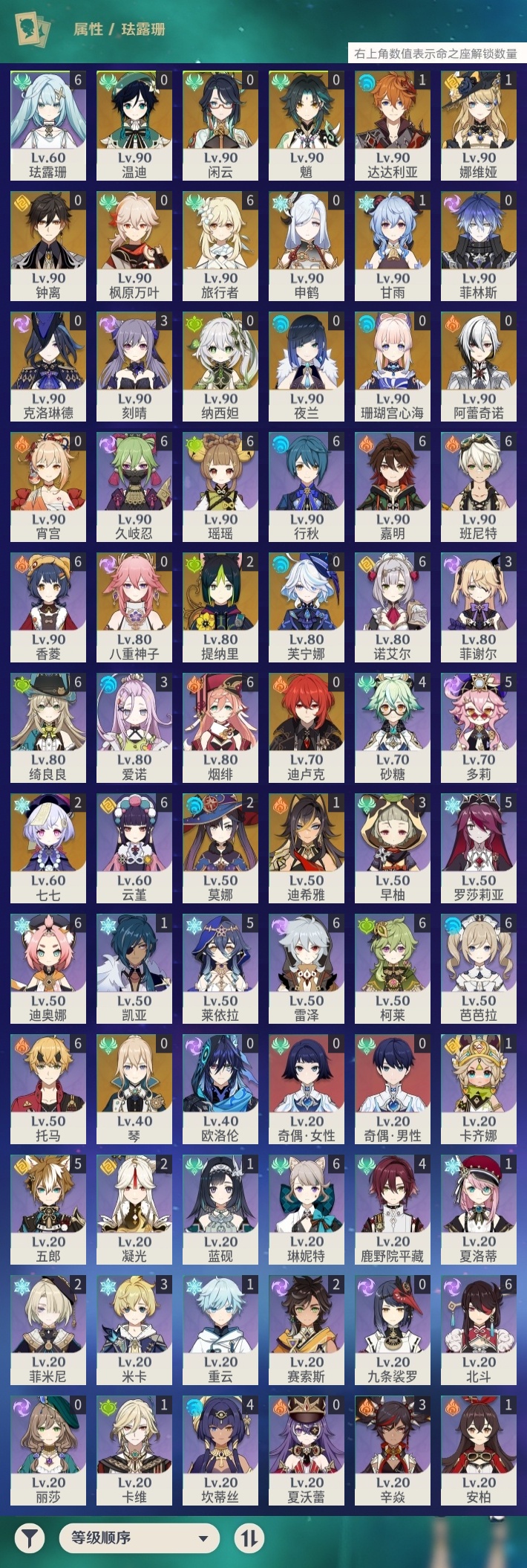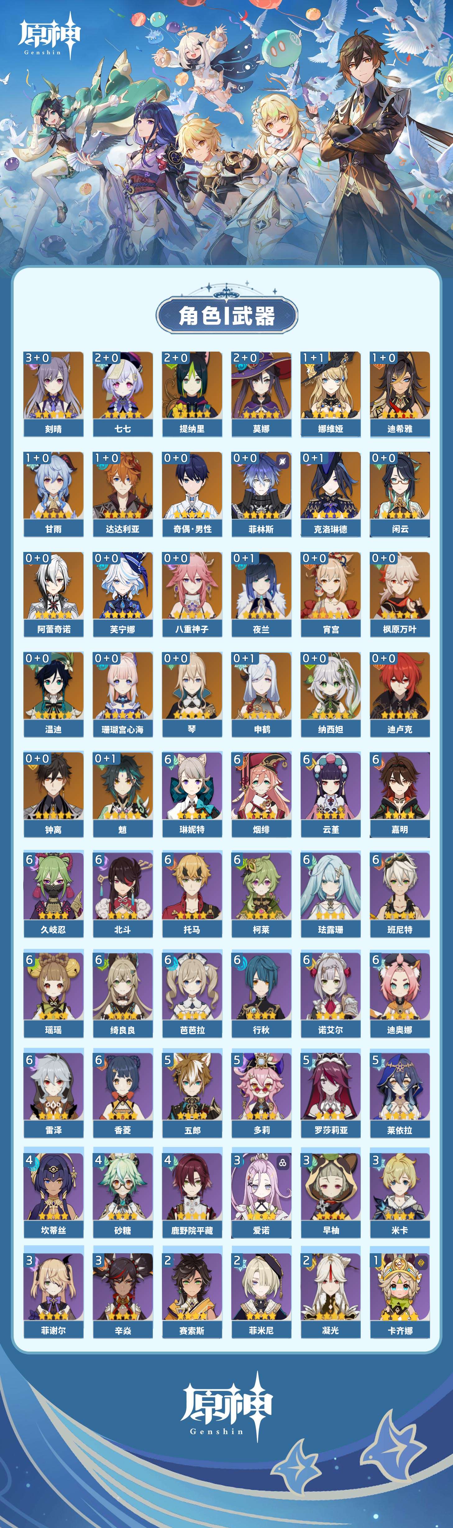 【原神】【lyys10256】冒险等级:60,五星数量:42,五星角色:刻晴 3命莫娜 2命七七 2命提纳里 2命迪希雅 1命娜维娅 1命达达利亚 1命甘雨 1命琴珊瑚宫心海温迪宵宫钟离申鹤八重神子夜兰芙宁娜闲云阿蕾奇诺纳西妲菲林斯迪卢克枫原万叶魈克洛琳德__五星武器:风鹰剑 3精四风原典 2精雾切之回光 2精柔灯挽歌最初的大魔术裁断裁叶萃光和璞鸢天空之傲天空之卷天空之刃息灾若水赤沙之杖赦罪__四星角色:班尼特 6命行秋 6命香菱 6命久岐忍 6命珐露珊 6命迪奥娜 6命绮良良 6命瑶瑶 6命柯莱 6命芭芭拉 6命云堇 6命托马 6命烟绯 6命诺艾尔 6命雷泽 6命北斗 6命琳妮特 6命嘉明 6命莱依拉 5命多莉 5命五郎 5命罗莎莉亚 5命鹿野院平藏 4命砂糖 4命坎蒂丝 4命米卡 3命早柚 3命辛焱 3命菲谢尔 3命爱诺 3命凝光 2命菲米尼 2命赛索斯 2命卡齐娜 1命卡维 1命蓝砚 1命重云 1命夏洛蒂 1命奇偶·女性奇偶·男性九条裟罗欧洛伦夏沃蕾