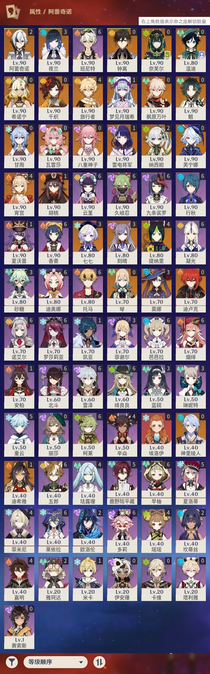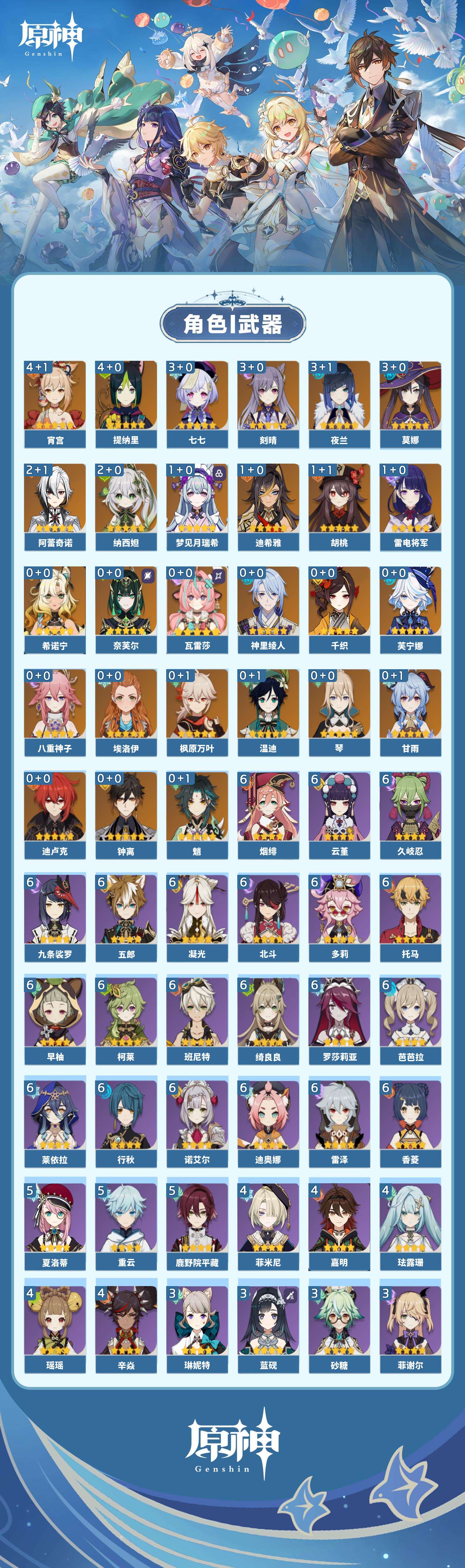 【原神】【lyys10324】冒险等级:60,五星数量:42,五星角色:宵宫 4命提纳里 4命刻晴 3命莫娜 3命七七 3命夜兰 3命阿蕾奇诺 2命纳西妲 2命迪希雅 1命梦见月瑞希 1命胡桃 1命雷电将军 1命琴希诺宁温迪钟离瓦雷莎八重神子神里绫人芙宁娜千织奈芙尔迪卢克枫原万叶甘雨魈__五星武器:碧落之珑最初的大魔术赤月之形阿莫斯之弓苍古自由之誓飞雷之弦振风鹰剑和璞鸢护摩之杖四风原典天空之傲天空之翼终末嗟叹之诗斫峰之刃若水__四星角色:班尼特 6命行秋 6命九条裟罗 6命香菱 6命久岐忍 6命凝光 6命迪奥娜 6命绮良良 6命莱依拉 6命多莉 6命柯莱 6命芭芭拉 6命云堇 6命早柚 6命托马 6命五郎 6命烟绯 6命诺艾尔 6命罗莎莉亚 6命雷泽 6命北斗 6命鹿野院平藏 5命重云 5命夏洛蒂 5命珐露珊 4命瑶瑶 4命辛焱 4命菲米尼 4命嘉明 4命砂糖 3命蓝砚 3命菲谢尔 3命琳妮特 3命坎蒂丝 2命欧洛伦 2命米卡 1命夏沃蕾 1命埃洛伊卡维伊安珊塔利雅赛索斯