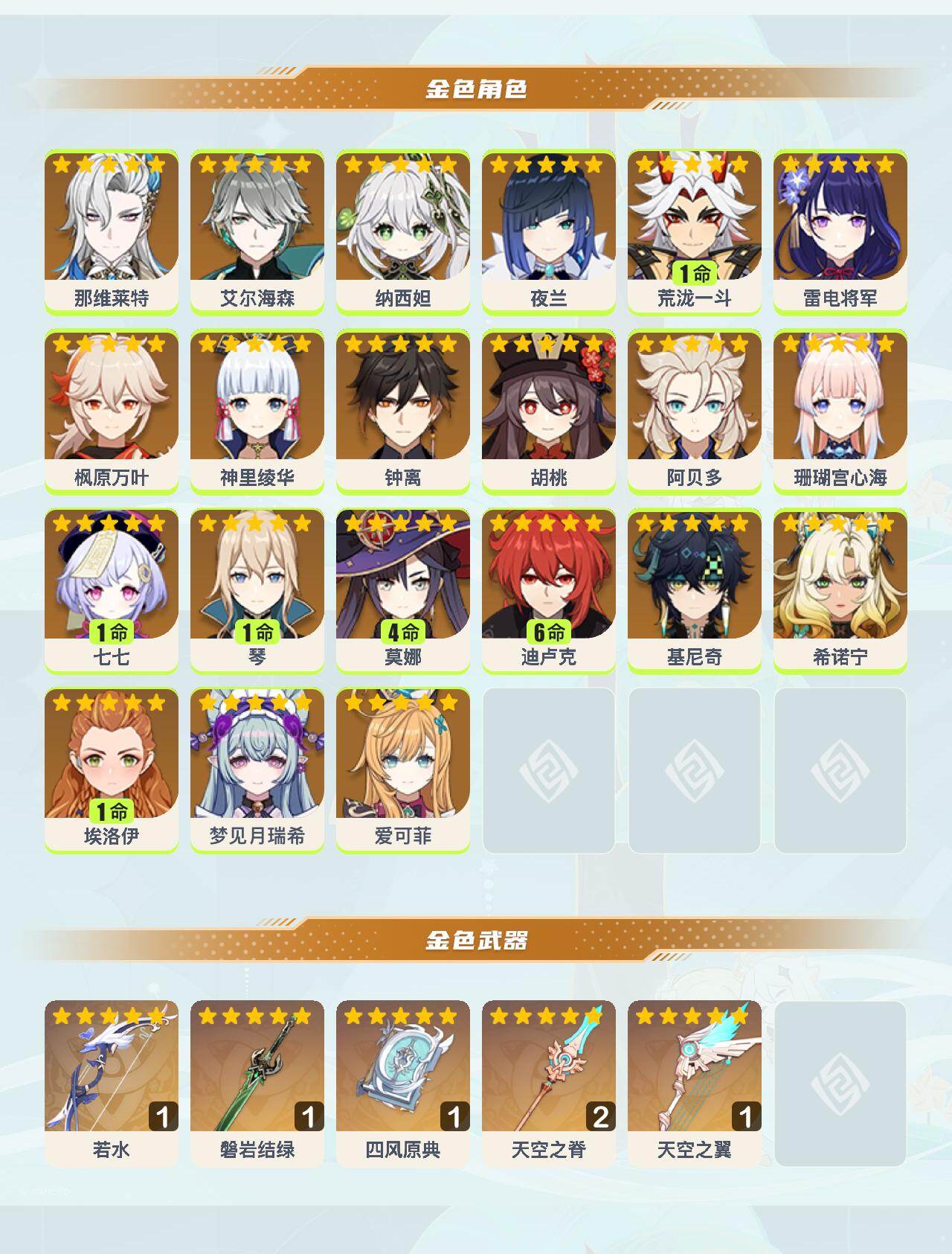 【ysz3101】59级/44黄/女主/21个五星角色/8个五星武器/0命钟离/0命阿贝多/1命荒泷一斗/0命神里绫华/0命雷电将军/0命艾尔海森/0命夜兰/0命珊瑚宫心海/0命胡桃/0命枫原万叶/0命纳西妲/满命迪卢克/0命希诺宁/0命爱可菲/4命莫娜/1命琴/0命基尼奇/1命七七/0命那维莱特/0命梦见月瑞希/0命埃洛伊/精1若水/精1天空之翼/精1四风原典/精2天空之脊/精1磐岩结绿
