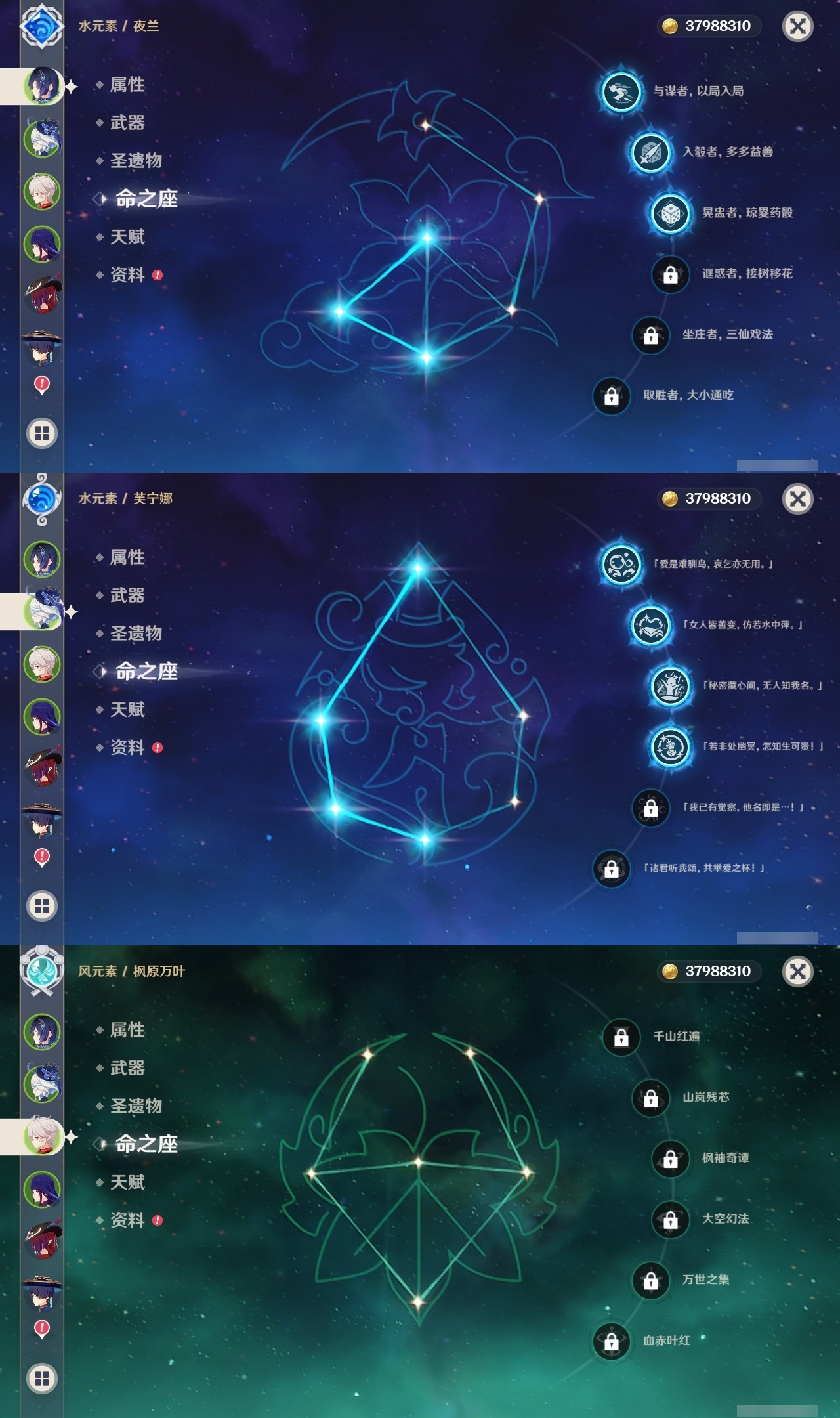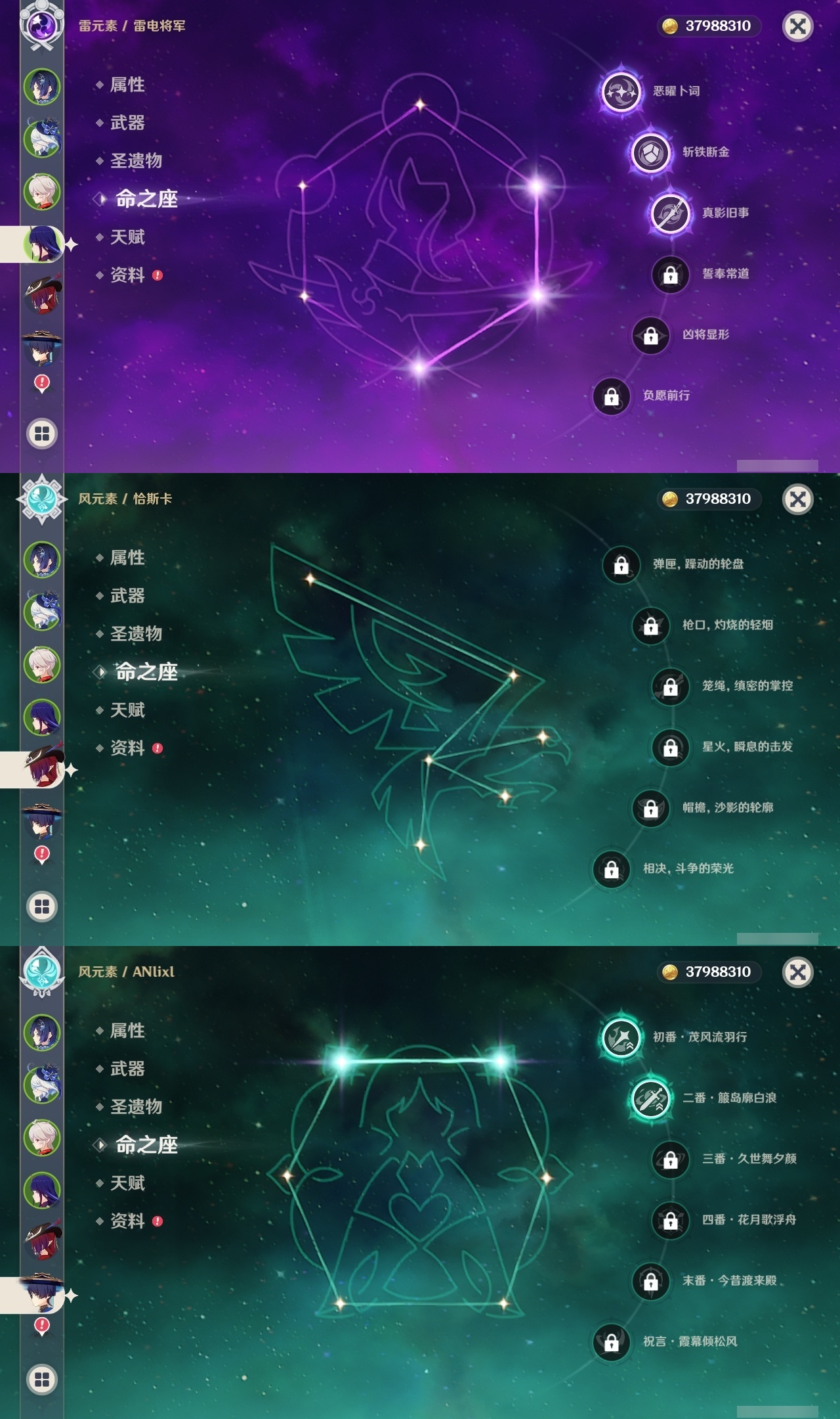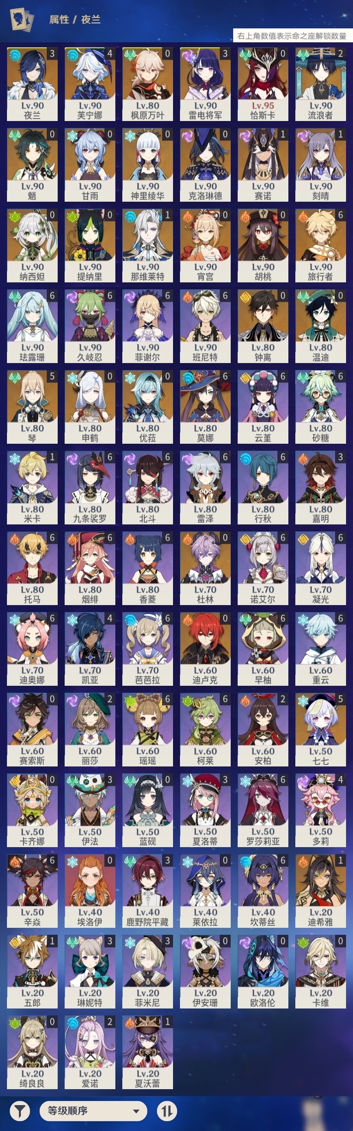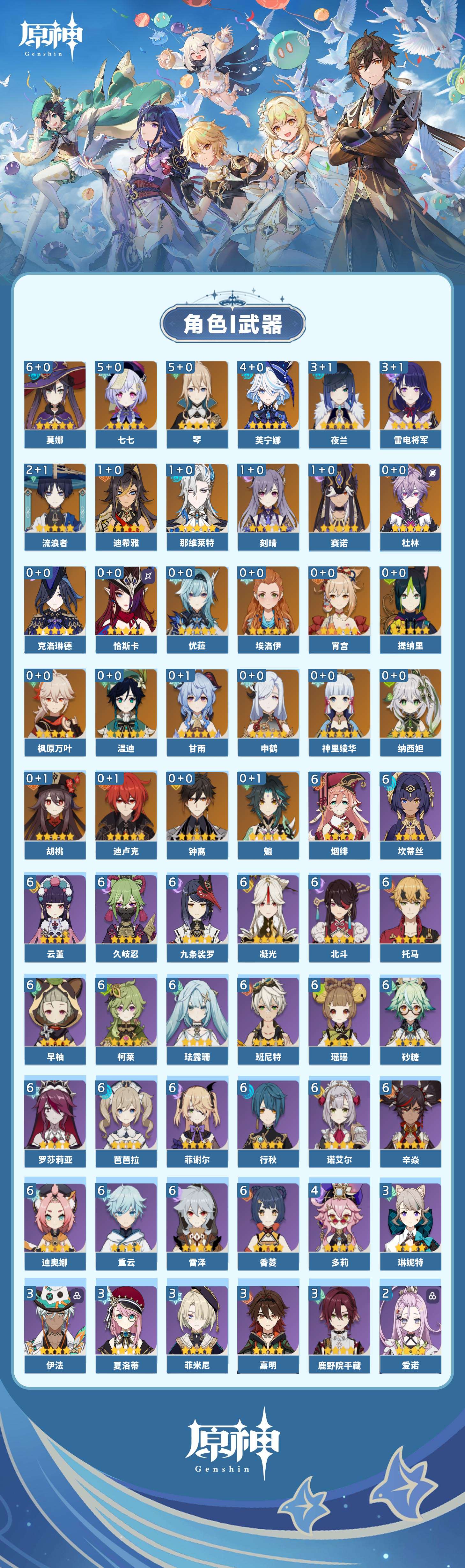 【原神】【lyys10437】冒险等级:60,五星数量:40,五星角色:莫娜 6命七七 5命琴 5命芙宁娜 4命雷电将军 3命夜兰 3命流浪者 2命迪希雅 1命那维莱特 1命刻晴 1命赛诺 1命神里绫华温迪恰斯卡宵宫优菈钟离申鹤提纳里纳西妲杜林迪卢克枫原万叶甘雨魈胡桃克洛琳德__五星武器:天空之脊 4精赤月之形图莱杜拉的回忆阿莫斯之弓和璞鸢护摩之杖狼的末路天空之傲天空之刃无工之剑薙草之稻光若水__四星角色:班尼特 6命行秋 6命九条裟罗 6命香菱 6命久岐忍 6命珐露珊 6命凝光 6命迪奥娜 6命砂糖 6命瑶瑶 6命坎蒂丝 6命柯莱 6命芭芭拉 6命云堇 6命早柚 6命托马 6命烟绯 6命重云 6命辛焱 6命诺艾尔 6命罗莎莉亚 6命雷泽 6命菲谢尔 6命北斗 6命多莉 4命鹿野院平藏 3命菲米尼 3命琳妮特 3命夏洛蒂 3命嘉明 3命伊法 3命爱诺 2命米卡 1命五郎 1命夏沃蕾 1命埃洛伊卡齐娜绮良良莱依拉卡维欧洛伦蓝砚伊安珊赛索斯