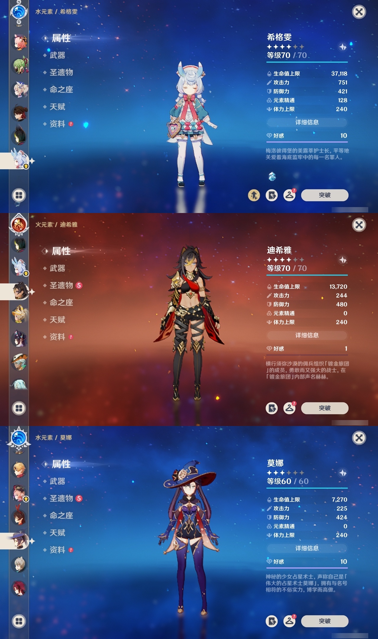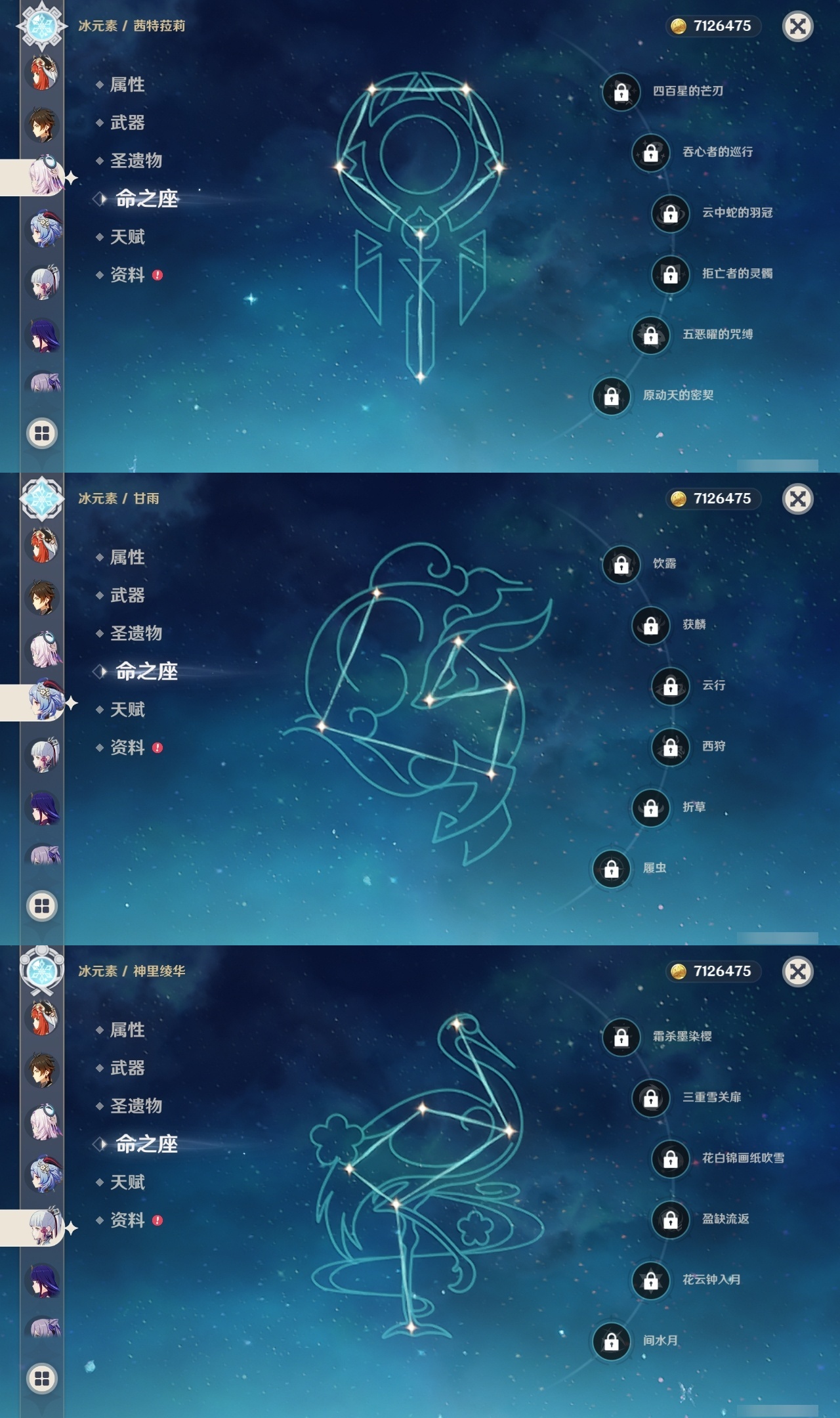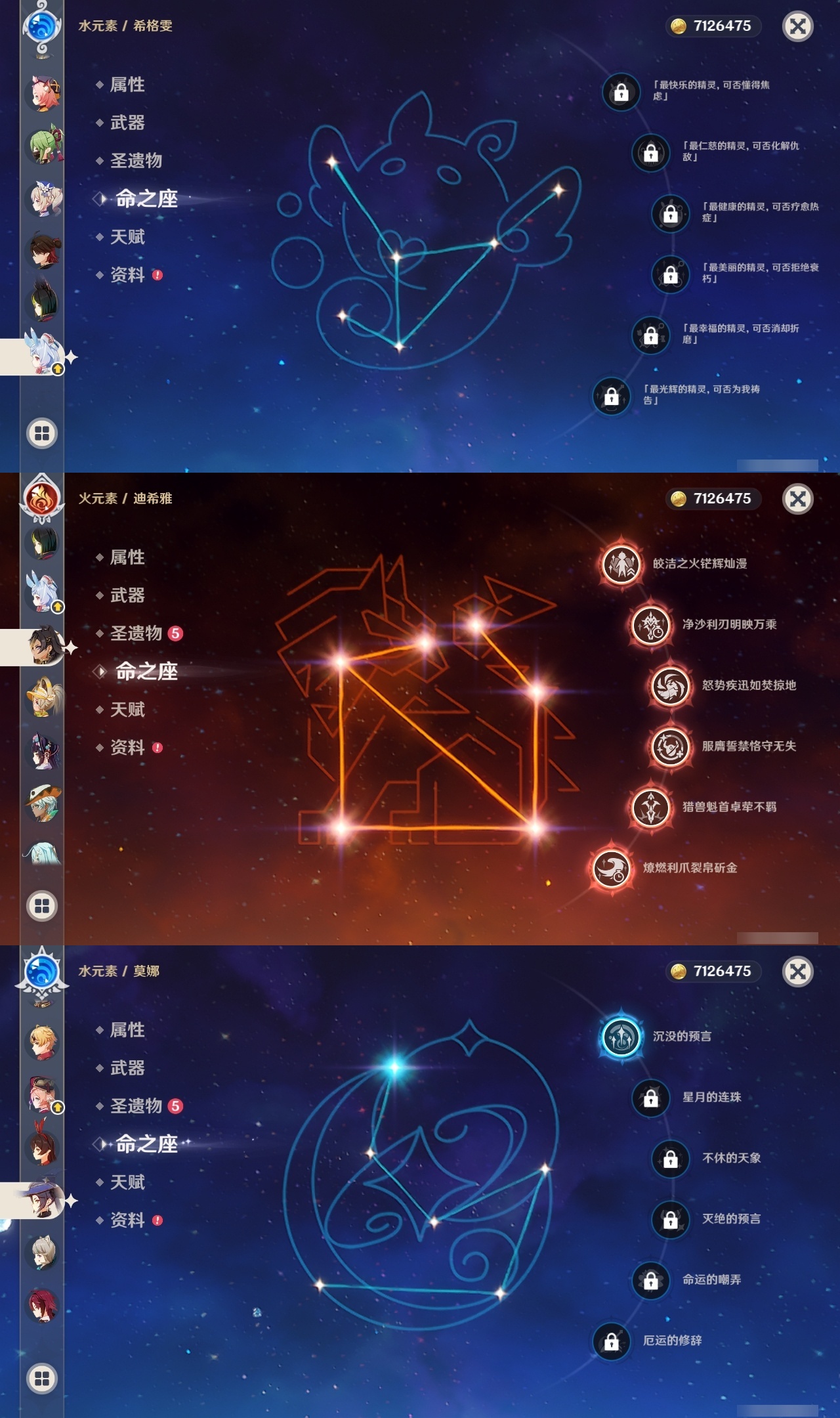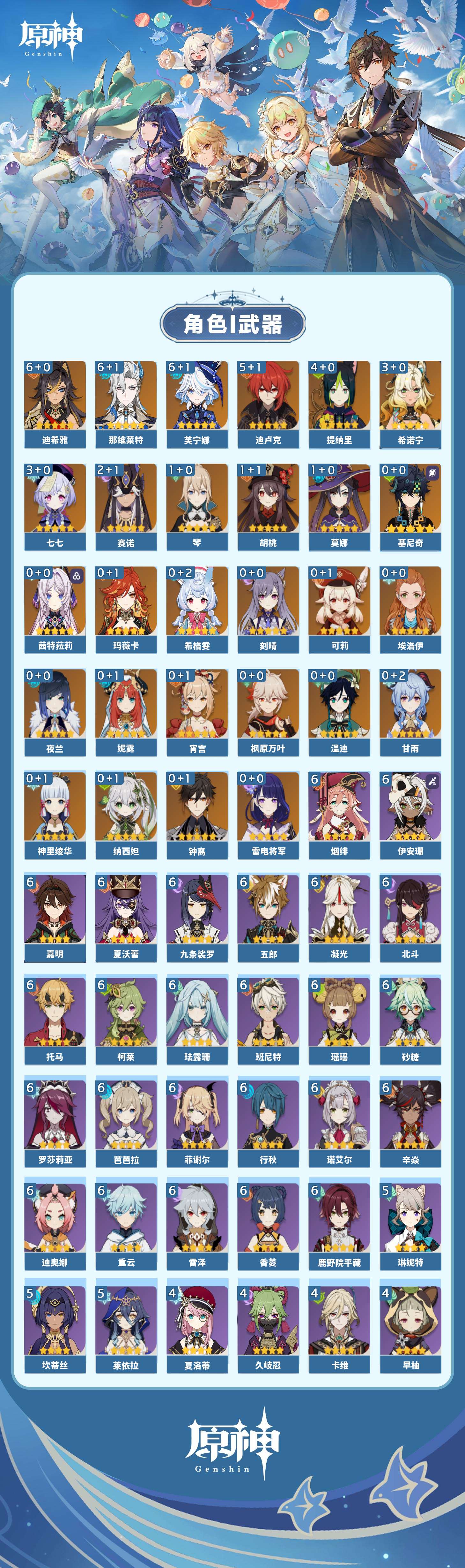 【原神】满命,冒险等级:60,五星数量:51,五星角色:迪希雅 6命那维莱特 6命芙宁娜 6命迪卢克 5命提纳里 4命希诺宁 3命七七 3命赛诺 2命胡桃 1命莫娜 1命琴 1命基尼奇神里绫华温迪玛薇卡茜特菈莉宵宫钟离夜兰妮露纳西妲枫原万叶甘雨希格雯可莉刻晴雷电将军__五星武器:阿莫斯之弓 2精白雨心弦 2精柔灯挽歌碧落之珑焚曜千阳寝正月初晴万世流涌大典静水流涌之辉飞雷之弦振护摩之杖狼的末路磐岩结绿四风原典天空之傲天空之脊天空之卷天空之刃天空之翼雾切之回光贯虹之槊赤沙之杖圣显之钥千夜浮梦__四星角色:班尼特 6命行秋 6命九条裟罗 6命香菱 6命鹿野院平藏 6命珐露珊 6命凝光 6命迪奥娜 6命砂糖 6命瑶瑶 6命柯莱 6命芭芭拉 6命托马 6命五郎 6命烟绯 6命重云 6命辛焱 6命诺艾尔 6命罗莎莉亚 6命雷泽 6命菲谢尔 6命北斗 6命夏沃蕾 6命嘉明 6命伊安珊 6命莱依拉 5命坎蒂丝 5命琳妮特 5命久岐忍 4命卡维 4命早柚 4命夏洛蒂 4命欧洛伦 2命云堇 2命卡齐娜 1命绮良良 1命米卡 1命蓝砚 1命爱诺 1命埃洛伊多莉菲米尼伊法赛索斯