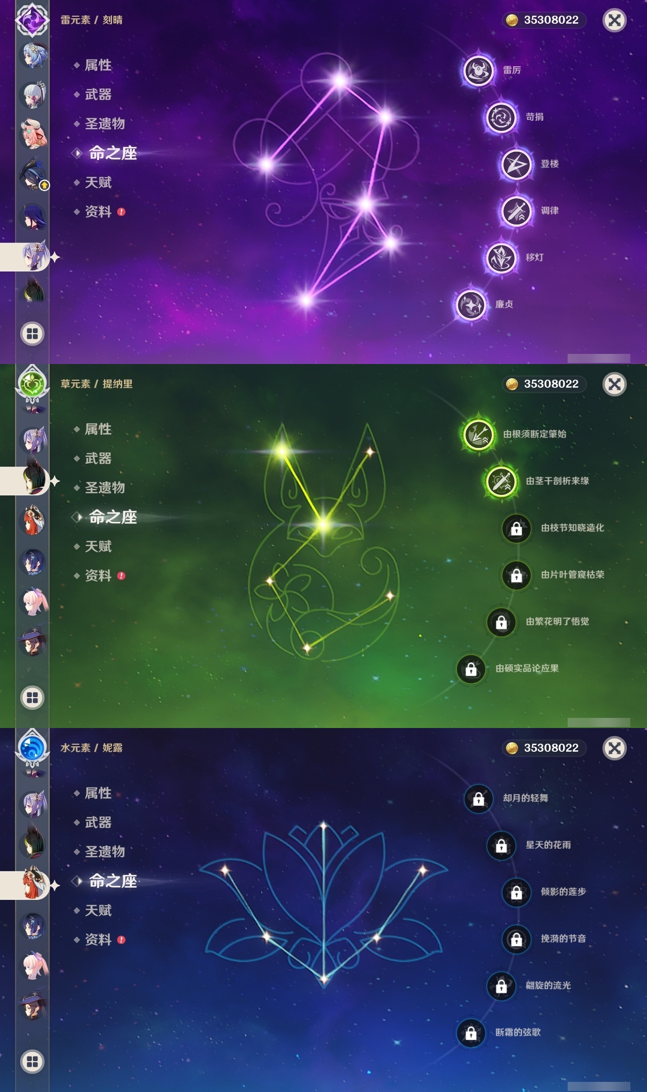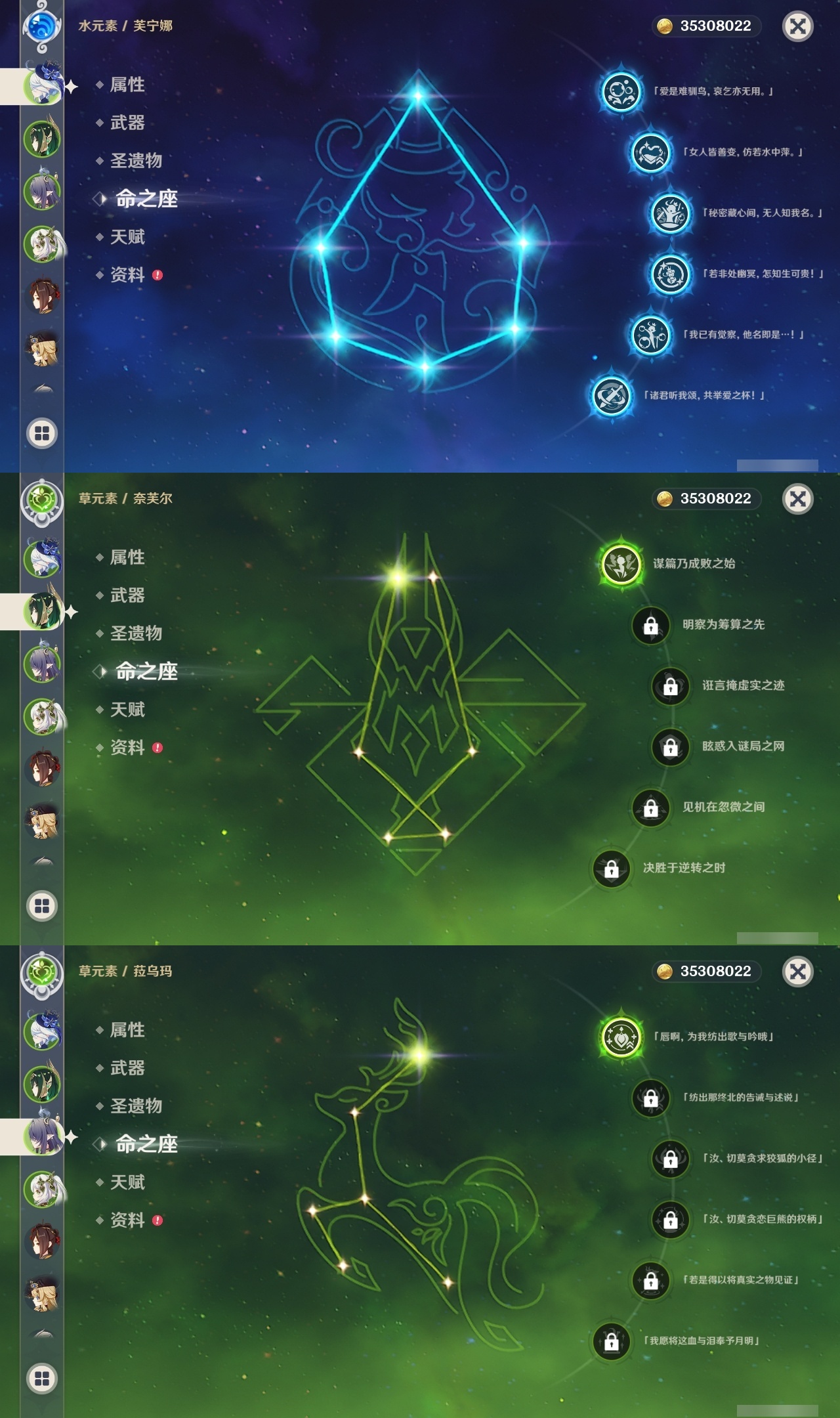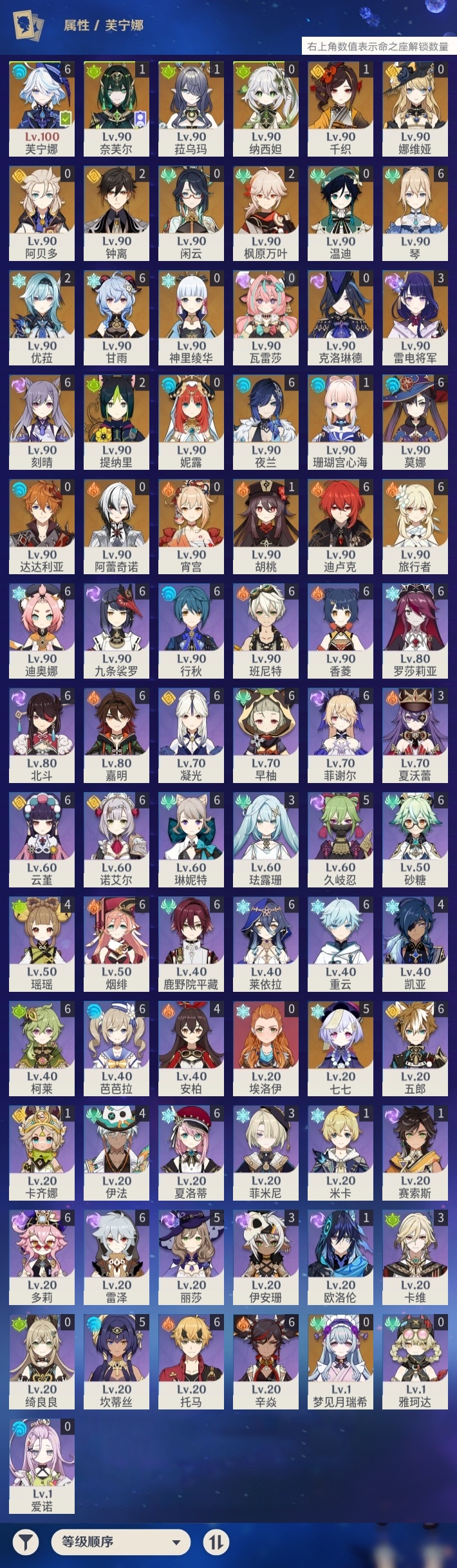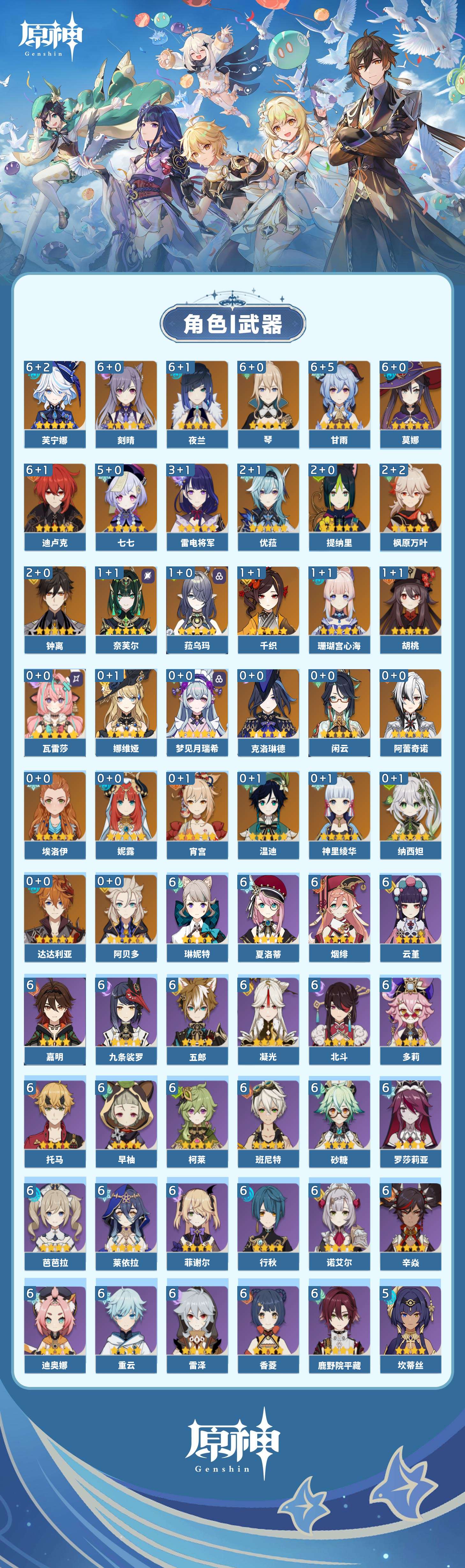 【原神】满命,冒险等级:60,五星数量:59,五星角色:芙宁娜 6命迪卢克 6命甘雨 6命刻晴 6命莫娜 6命琴 6命夜兰 6命七七 5命雷电将军 3命枫原万叶 2命优菈 2命钟离 2命提纳里 2命千织 1命菈乌玛 1命奈芙尔 1命胡桃 1命珊瑚宫心海 1命神里绫华温迪宵宫达达利亚梦见月瑞希瓦雷莎阿贝多娜维娅闲云阿蕾奇诺妮露纳西妲克洛琳德__五星武器:阿莫斯之弓 5精风鹰剑 5精天空之傲 4精天空之脊 4精天空之刃 3精静水流涌之辉 2精苍古自由之誓 2精无工之剑 2精碧落之珑裁断有乐御簾切真语秘匣不灭月华飞雷之弦振和璞鸢护摩之杖狼的末路磐岩结绿松籁响起之时天空之卷天空之翼雾切之回光薙草之稻光终末嗟叹之诗若水千夜浮梦白雨心弦__四星角色:班尼特 6命行秋 6命九条裟罗 6命香菱 6命鹿野院平藏 6命凝光 6命迪奥娜 6命砂糖 6命莱依拉 6命多莉 6命柯莱 6命芭芭拉 6命云堇 6命早柚 6命托马 6命五郎 6命烟绯 6命重云 6命辛焱 6命诺艾尔 6命罗莎莉亚 6命雷泽 6命菲谢尔 6命北斗 6命琳妮特 6命夏洛蒂 6命嘉明 6命久岐忍 5命坎蒂丝 5命瑶瑶 4命伊法 4命珐露珊 3命卡维 3命菲米尼 3命夏沃蕾 3命伊安珊 3命卡齐娜 1命米卡 1命欧洛伦 1命赛索斯 1命埃洛伊绮良良爱诺
