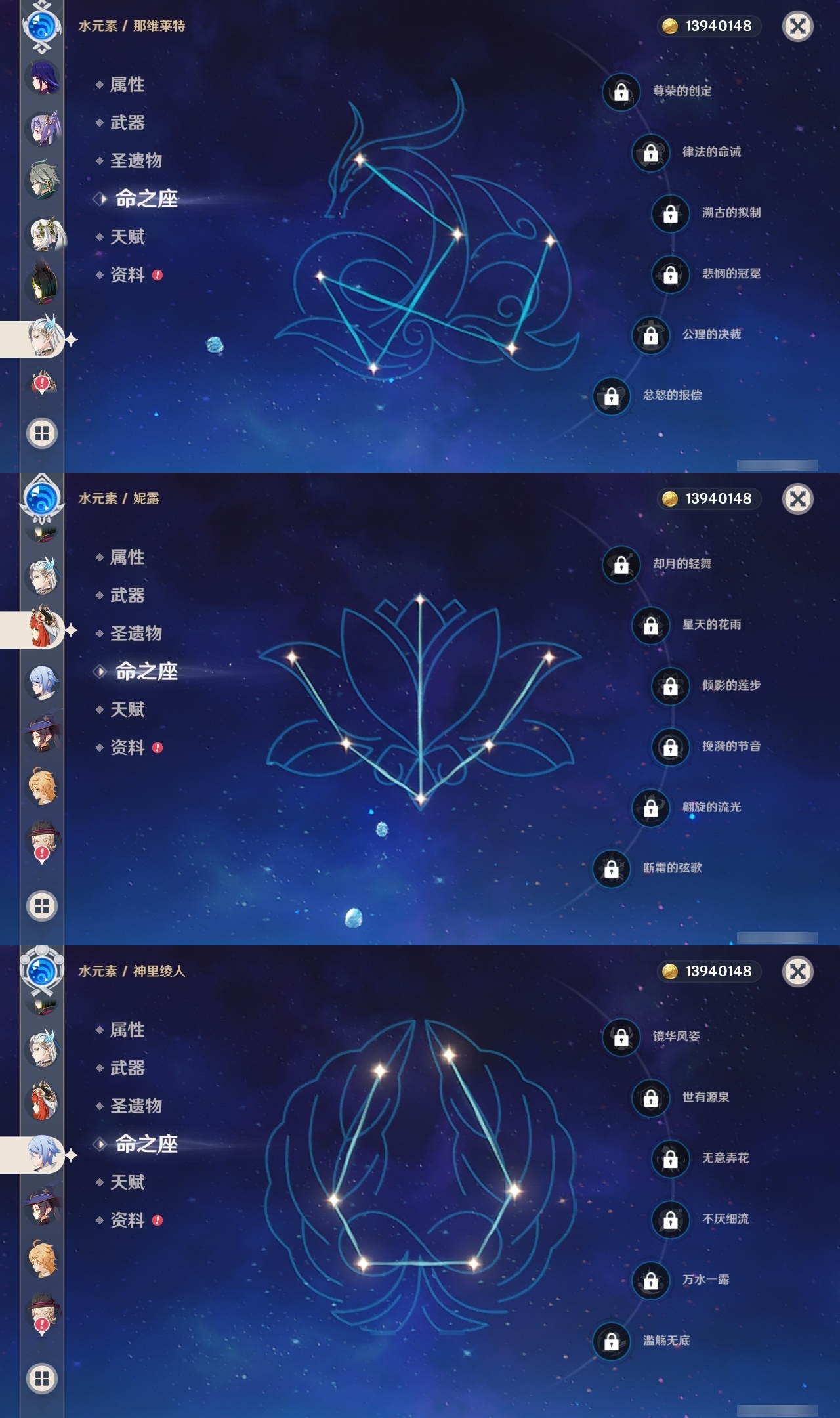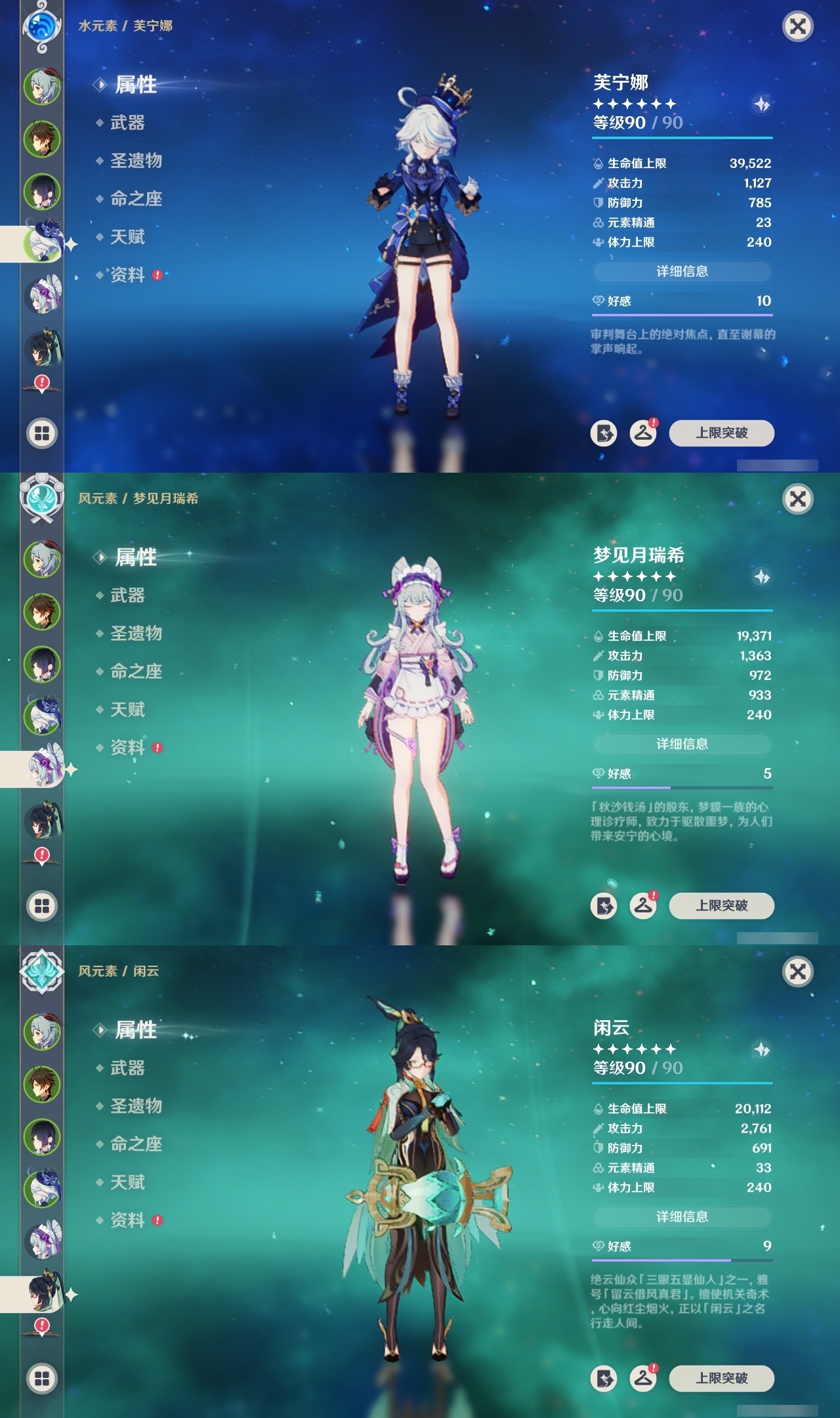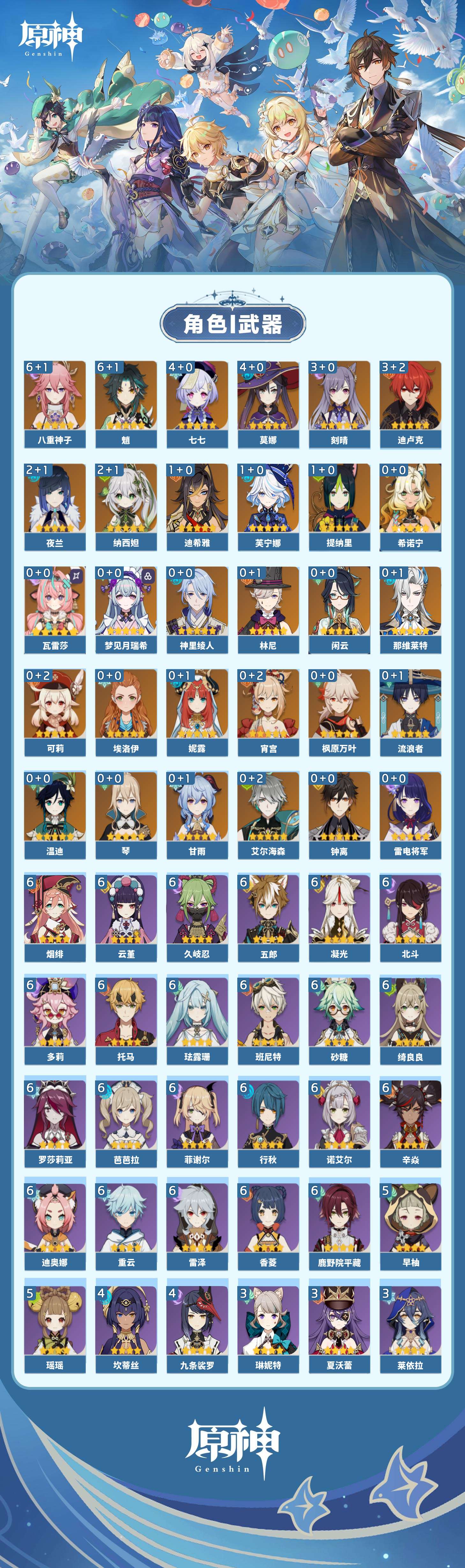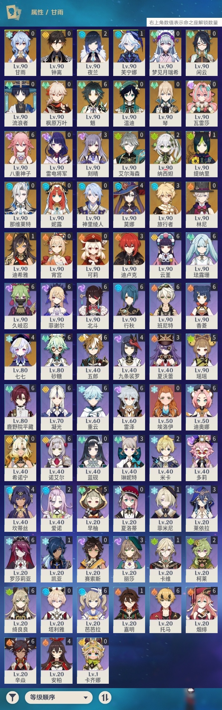 【原神】【lyys10575】冒险等级:60,五星数量:52,五星角色:魈 6命八重神子 6命莫娜 4命七七 4命迪卢克 3命刻晴 3命夜兰 2命纳西妲 2命迪希雅 1命芙宁娜 1命提纳里 1命琴希诺宁温迪宵宫钟离梦见月瑞希瓦雷莎神里绫人林尼那维莱特闲云妮露艾尔海森流浪者枫原万叶甘雨可莉雷电将军__五星武器:飞雷之弦振 2精护摩之杖 2精狼的末路 2精四风原典 2精天空之刃 2精裁叶萃光 2精最初的大魔术万世流涌大典金流监督有乐御簾切图莱杜拉的回忆阿莫斯之弓不灭月华和璞鸢磐岩结绿天空之傲天空之翼斫峰之刃神乐之真意若水圣显之钥千夜浮梦__四星角色:班尼特 6命行秋 6命香菱 6命久岐忍 6命鹿野院平藏 6命珐露珊 6命凝光 6命迪奥娜 6命砂糖 6命绮良良 6命多莉 6命芭芭拉 6命云堇 6命托马 6命五郎 6命烟绯 6命重云 6命辛焱 6命诺艾尔 6命罗莎莉亚 6命雷泽 6命菲谢尔 6命北斗 6命瑶瑶 5命早柚 5命九条裟罗 4命坎蒂丝 4命莱依拉 3命琳妮特 3命夏沃蕾 3命米卡 2命柯莱 2命爱诺 2命卡维 1命菲米尼 1命嘉明 1命埃洛伊卡齐娜蓝砚夏洛蒂塔利雅赛索斯