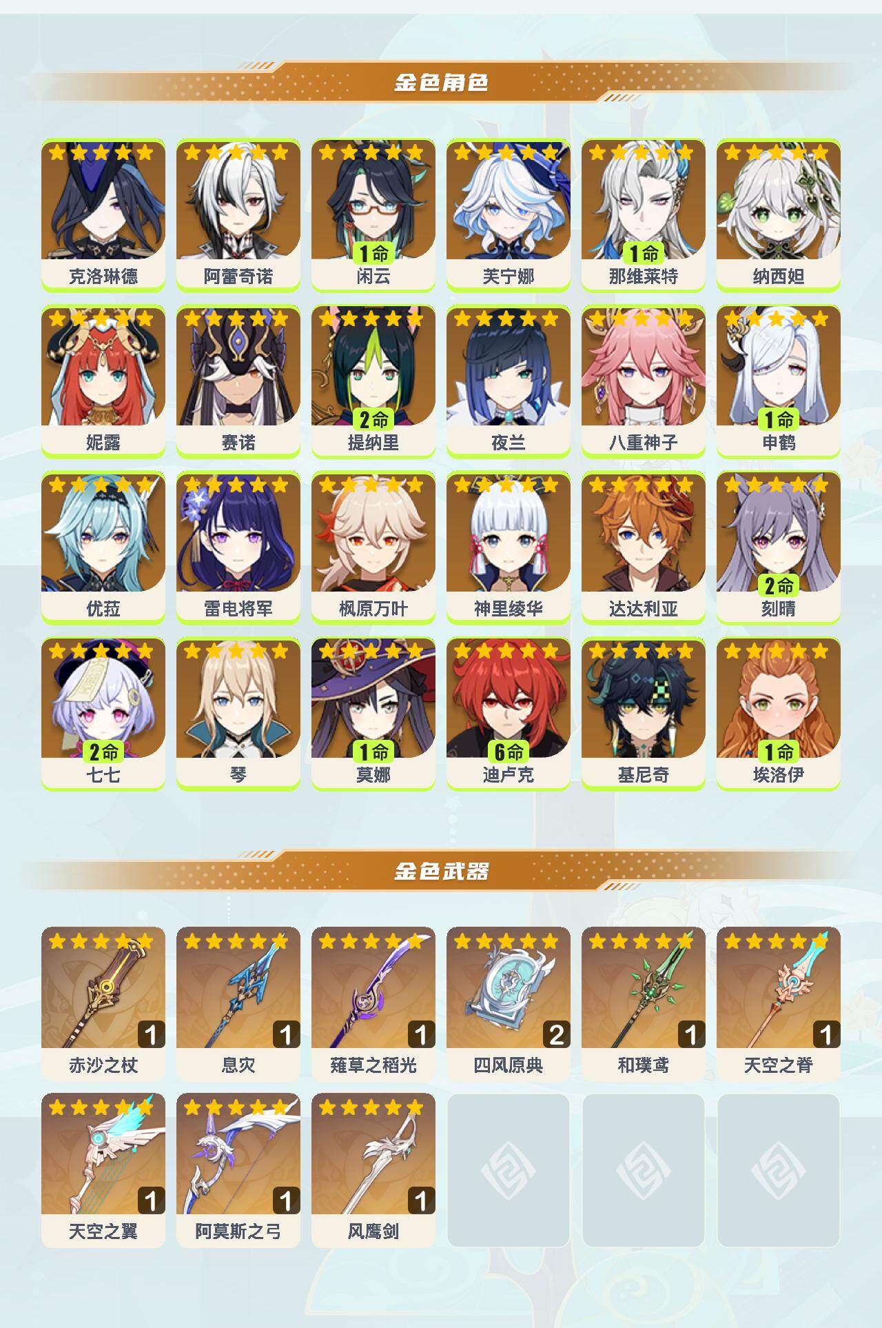【ysn2234】60级/50黄/女主/24个五星角色/9个五星武器/0命枫原万叶/0命雷电将军/0命芙宁娜/1命那维莱特/1命闲云/1命申鹤/0命优菈/0命神里绫华/0命克洛琳德/0命八重神子/0命基尼奇/0命纳西妲/0命夜兰/0命达达利亚/0命阿蕾奇诺/满命迪卢克/0命赛诺/0命妮露/2命刻晴/1命莫娜/2命提纳里/2命七七/0命琴/0命埃洛伊/精1阿莫斯之弓/精1天空之翼/精2四风原典/精1薙草之稻光/精1息灾/精1和璞鸢/精1风鹰剑/精1赤沙之杖/精1天空之脊