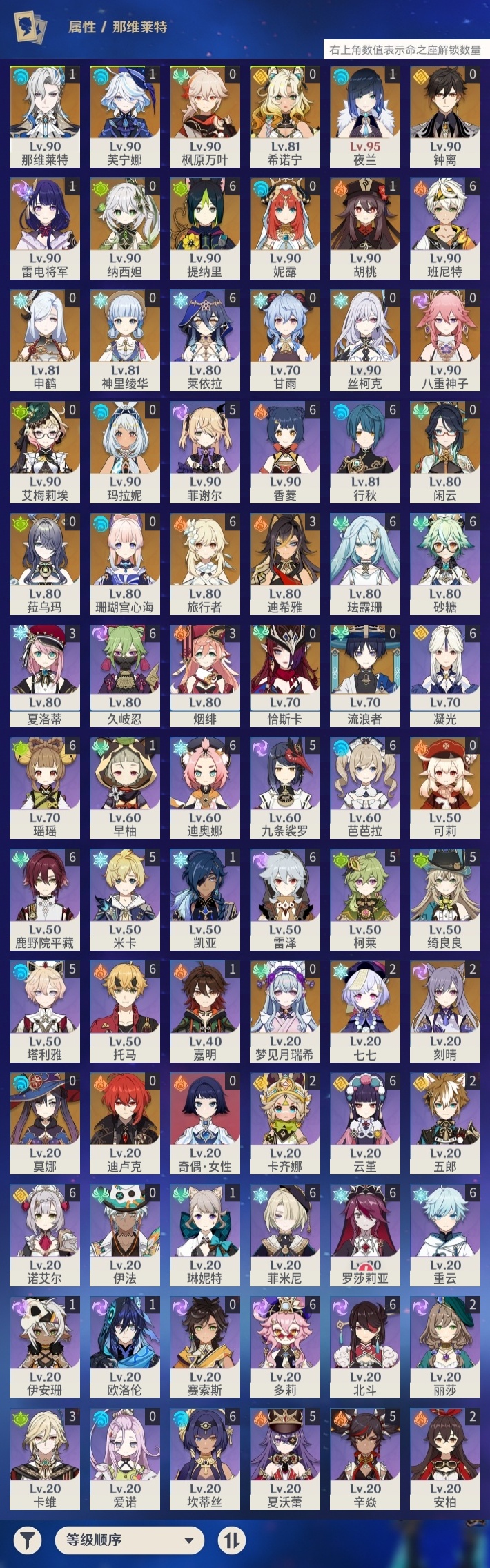 【原神】【lyys10605】冒险等级:60,五星数量:48,五星角色:提纳里 6命迪希雅 3命刻晴 2命七七 2命那维莱特 1命芙宁娜 1命胡桃 1命雷电将军 1命夜兰 1命莫娜艾梅莉埃玛拉妮珊瑚宫心海希诺宁神里绫华恰斯卡钟离梦见月瑞希申鹤八重神子闲云丝柯克妮露纳西妲菈乌玛流浪者迪卢克枫原万叶甘雨可莉__五星武器:护摩之杖 2精冲浪时光碧落之珑最初的大魔术万世流涌大典纺夜天镜苍古自由之誓飞雷之弦振风鹰剑和璞鸢狼的末路四风原典天空之脊雾切之回光若水圣显之钥千夜浮梦__四星角色:班尼特 6命行秋 6命香菱 6命久岐忍 6命鹿野院平藏 6命珐露珊 6命凝光 6命迪奥娜 6命砂糖 6命瑶瑶 6命莱依拉 6命坎蒂丝 6命多莉 6命芭芭拉 6命云堇 6命托马 6命重云 6命诺艾尔 6命罗莎莉亚 6命雷泽 6命北斗 6命菲米尼 6命九条裟罗 5命绮良良 5命米卡 5命柯莱 5命辛焱 5命菲谢尔 5命夏沃蕾 5命塔利雅 5命卡维 3命烟绯 3命夏洛蒂 3命卡齐娜 2命五郎 2命欧洛伦 1命早柚 1命琳妮特 1命嘉明 1命伊安珊 1命奇偶·女性伊法爱诺赛索斯