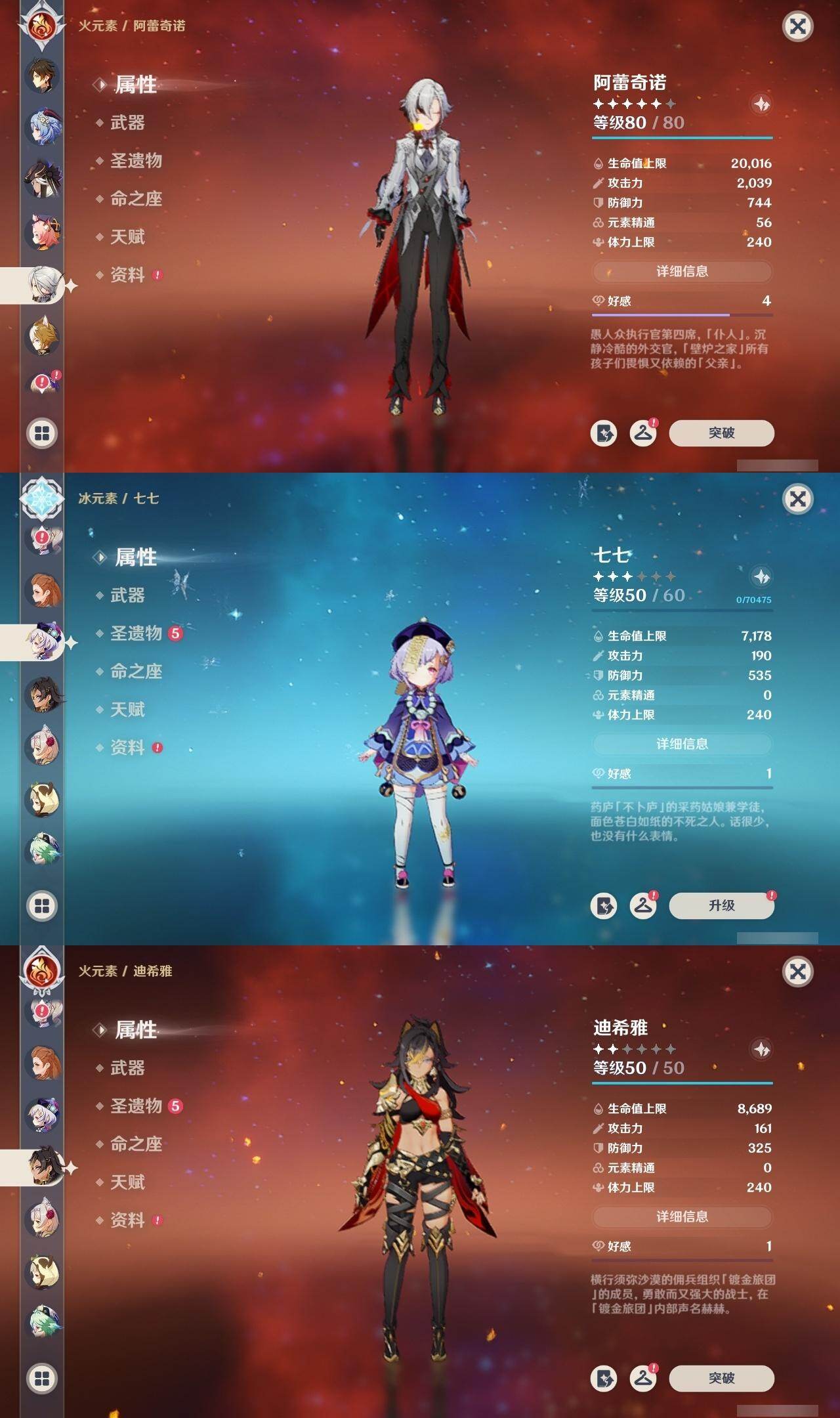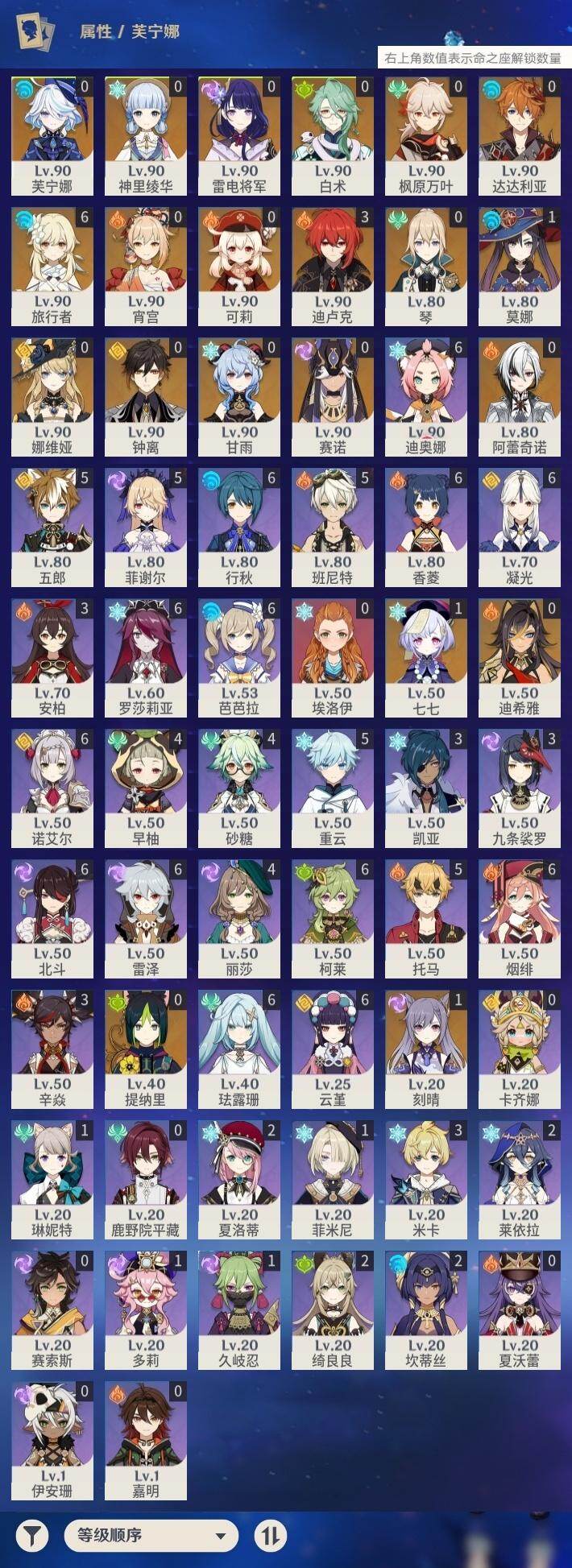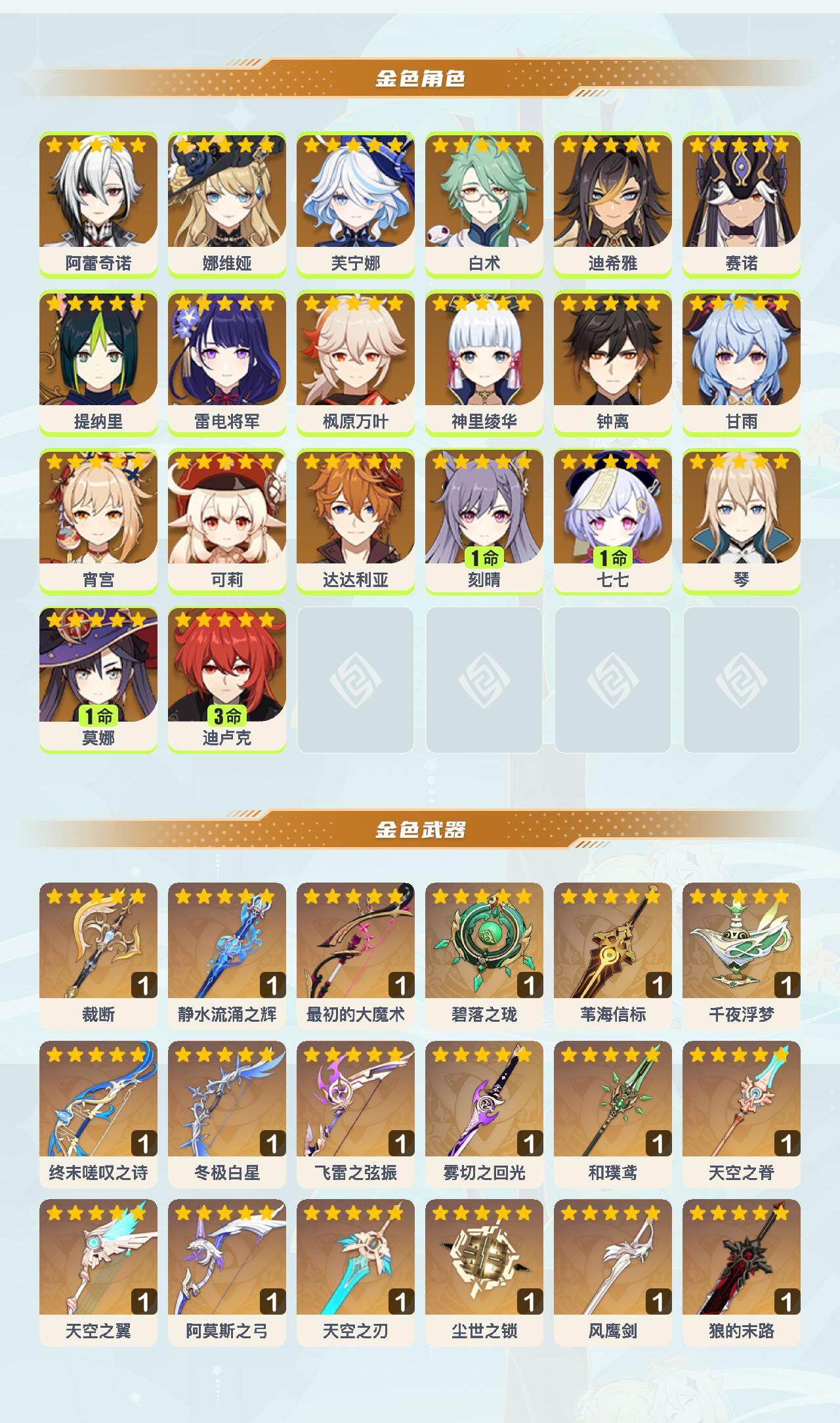 60级/48黄/女主/20个五星角色/22个五星武器 0命阿蕾奇诺0命娜维娅0命芙宁娜0命白术0命迪希雅0命赛诺0命提纳里0命雷电将军0命枫原万叶0命神里绫华0命钟离0命甘雨0命宵宫0命可莉0命达达利亚1命刻晴1命七七0命琴1命莫娜3命迪卢克精1裁断精1静水流涌之辉精1最初的大魔术精1碧落之珑精1苇海信标精1千夜浮梦精1终末嗟叹之诗精1冬极白星精1飞雷之弦振精1雾切之回光精1和璞鸢精1天空之脊精1天空之翼精1阿莫斯之弓精1天空之刃精1尘世之锁精1风鹰剑精1狼的末路