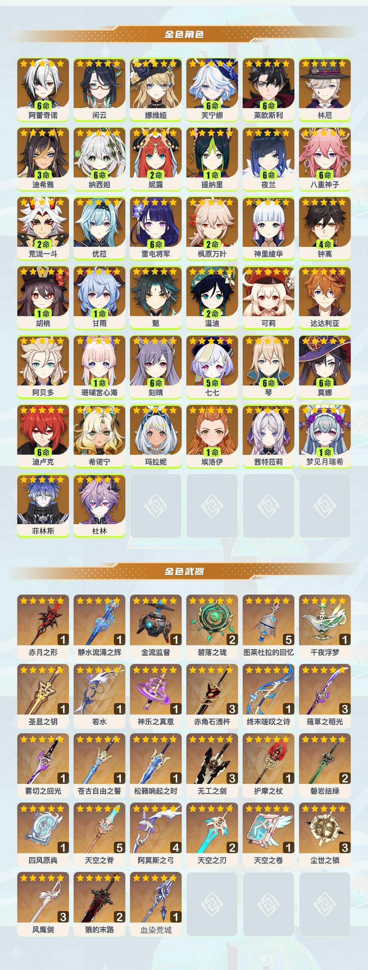 【ysf1541】60级/182黄/女主/38个五星角色/28个五星武器/满命芙宁娜/4命钟离/满命雷电将军/满命夜兰/满命阿蕾奇诺/0命希诺宁/0命娜维娅/2命荒泷一斗/0命阿贝多/0命闲云/2命枫原万叶/0命魈/2命温迪/满命琴/0命茜特菈莉/满命莱欧斯利/0命优菈/1命甘雨/5命七七/0命神里绫华/0命菲林斯/满命八重神子/满命刻晴/满命纳西妲/1命提纳里/0命玛拉妮/2命妮露/1命珊瑚宫心海/满命莫娜/0命达达利亚/0命杜林/0命林尼/1命胡桃/0命可莉/满命迪卢克/1命梦见月瑞希/0命埃洛伊/3命迪希雅/精1若水/精1终末嗟叹之诗/精4阿莫斯之弓/精1金流监督/精5图莱杜拉的回忆/精1千夜浮梦/精1神乐之真意/精3尘世之锁/精1四风原典/精1天空之卷/精1血染荒城/精1赤月之形/精3薙草之稻光/精5天空之脊/精1护摩之杖/精3赤角石溃杵/精1松籁响起之时/精2狼的末路/精1静水流涌之辉/精1圣显之钥/精1雾切之回光/精2磐岩结绿/精1苍古自由之誓/精2天空之刃/精3风鹰剑/精2碧落之珑/精3无工之剑