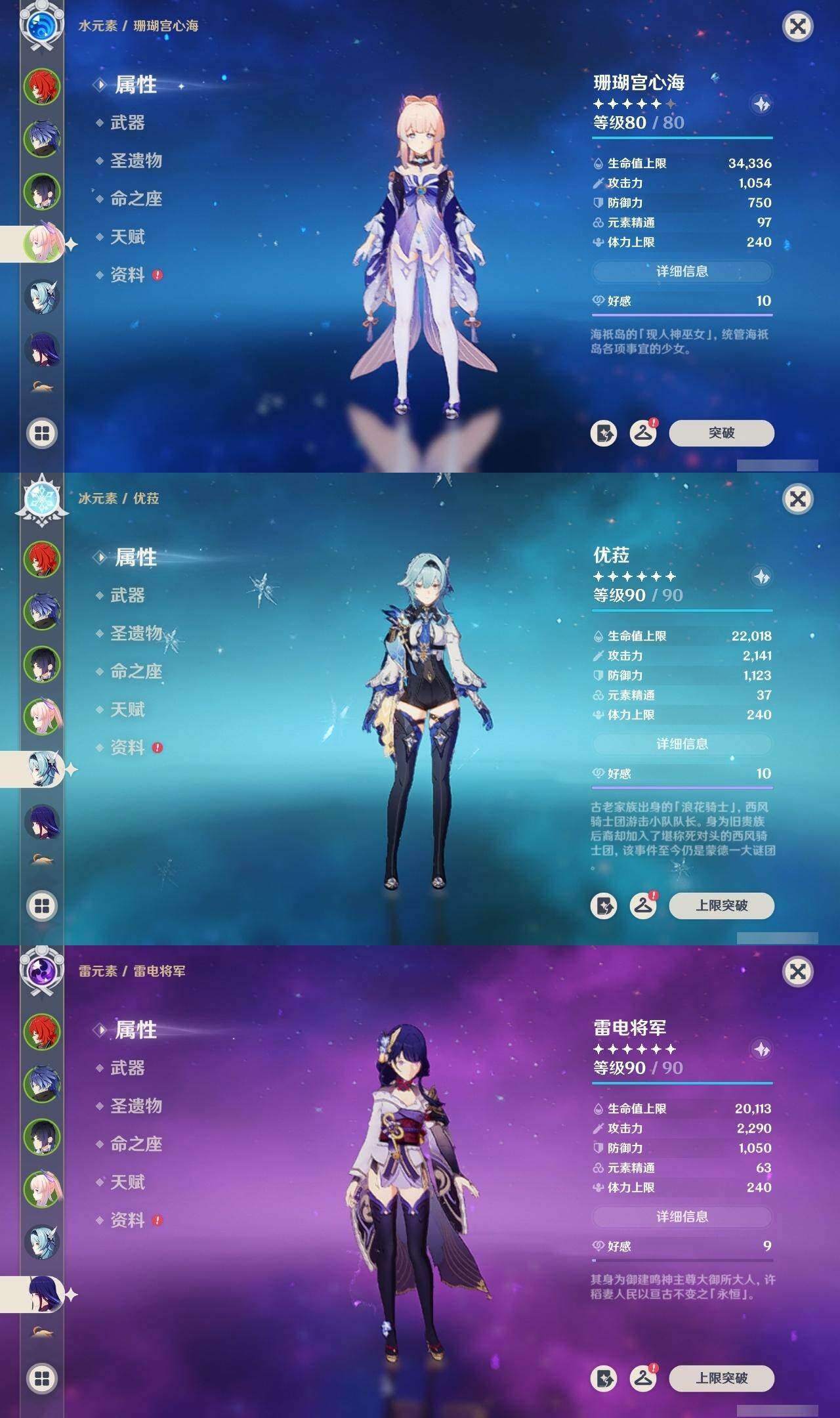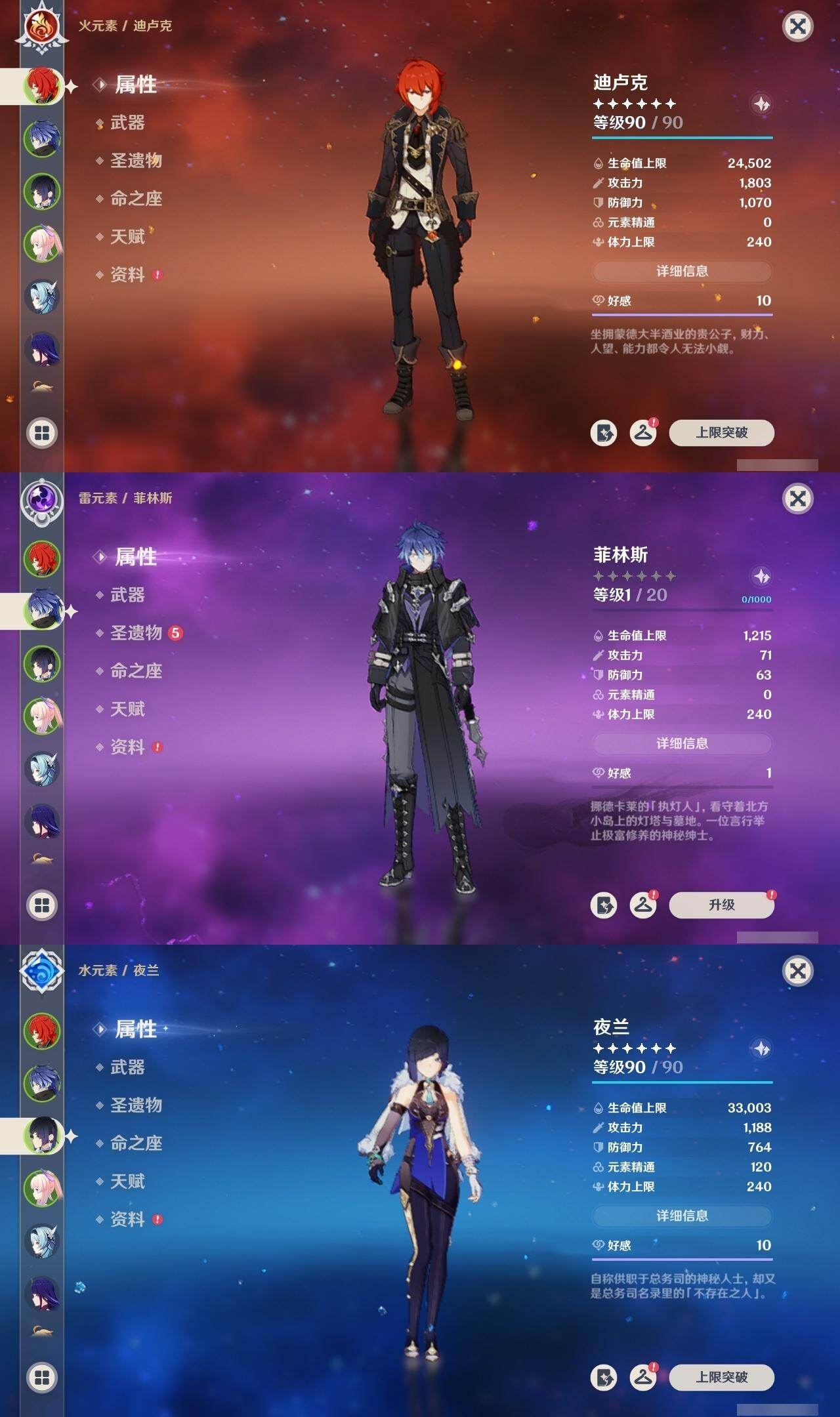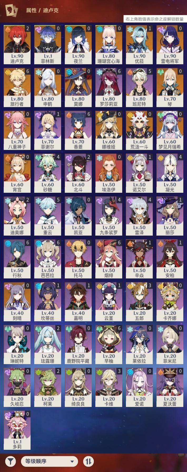 57级/22黄/男主/15个五星角色/4个五星武器 0命娜维娅0命夜兰0命八重神子0命申鹤0命荒泷一斗1命优菈0命雷电将军0命宵宫0命珊瑚宫心海0命刻晴0命琴0命莫娜2命迪卢克0命梦见月瑞希0命菲林斯精1松籁响起之时精1和璞鸢精1风鹰剑精1狼的末路