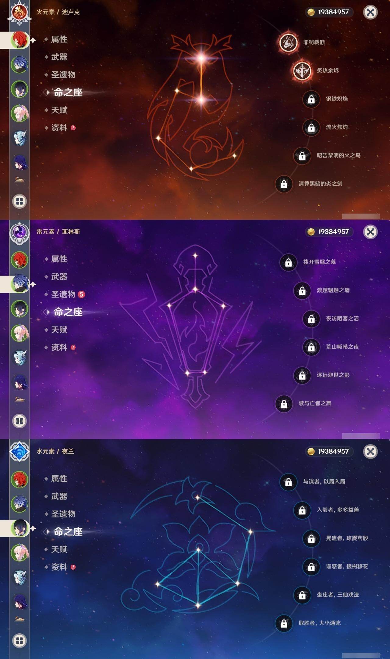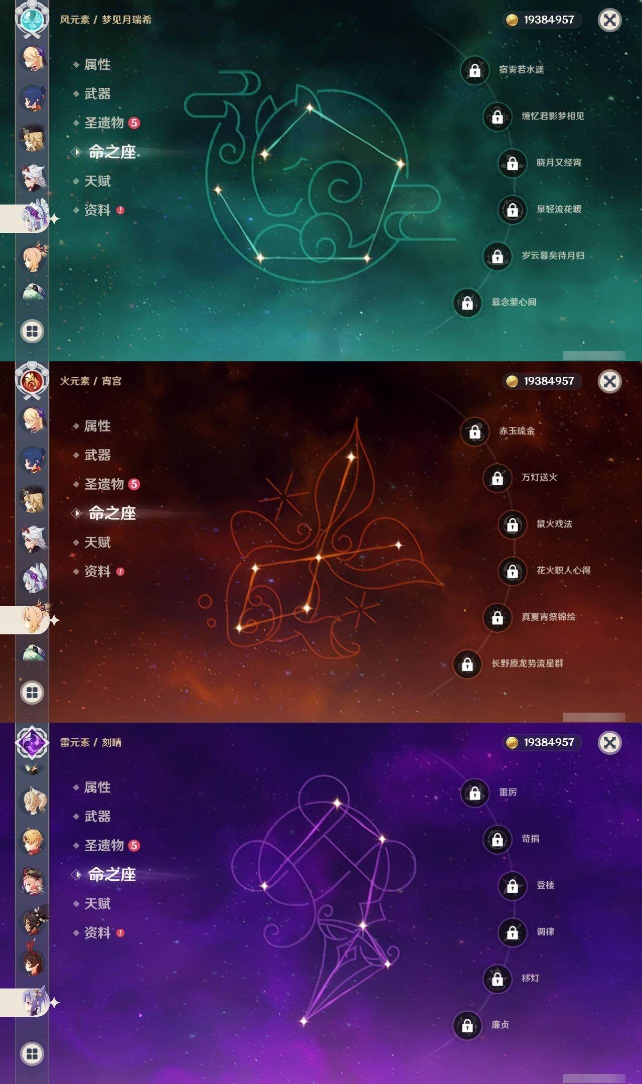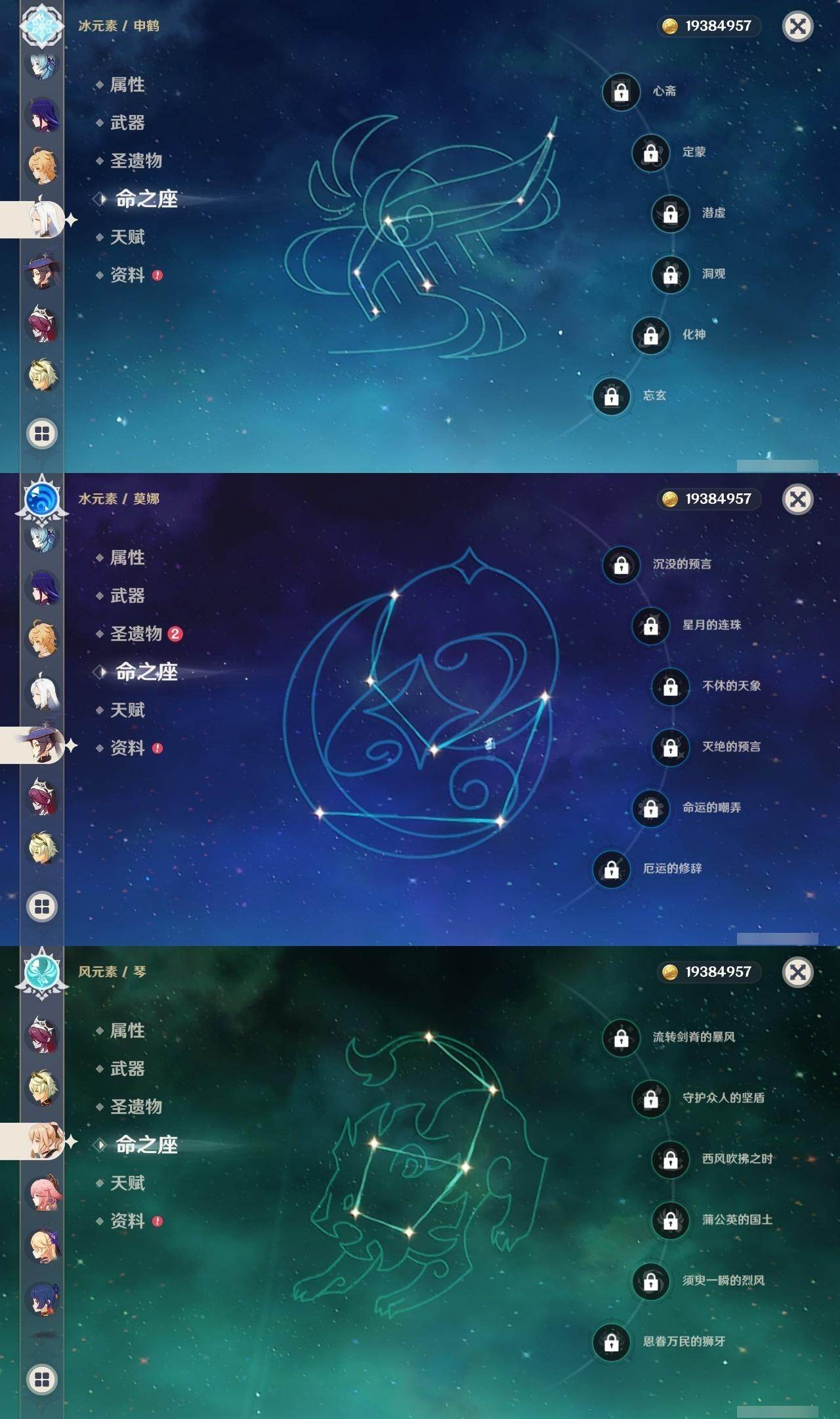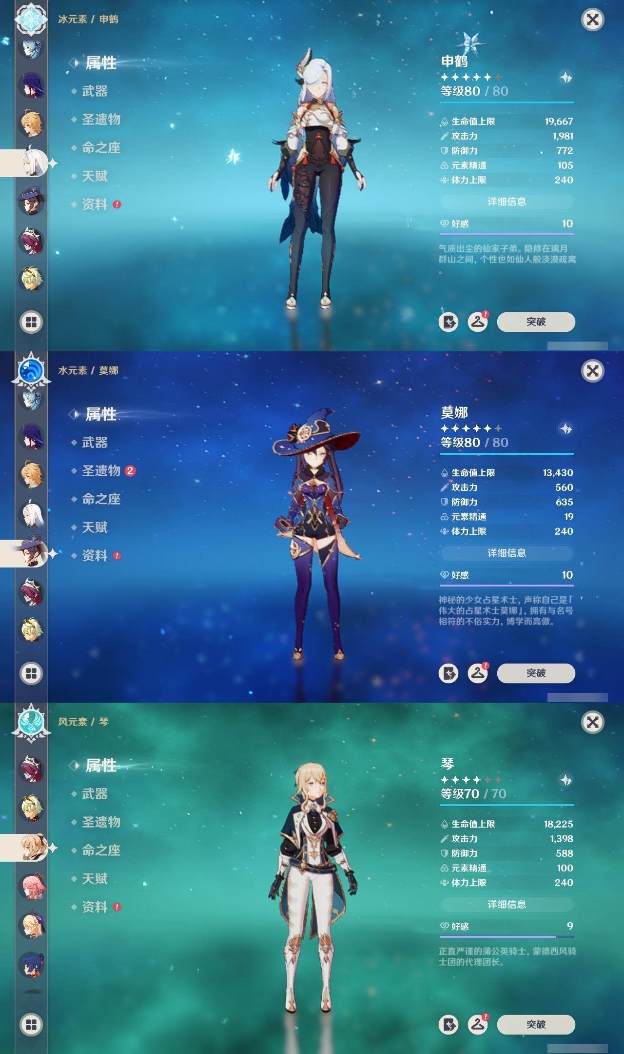 57级/22黄/男主/15个五星角色/4个五星武器 0命娜维娅0命夜兰0命八重神子0命申鹤0命荒泷一斗1命优菈0命雷电将军0命宵宫0命珊瑚宫心海0命刻晴0命琴0命莫娜2命迪卢克0命梦见月瑞希0命菲林斯精1松籁响起之时精1和璞鸢精1风鹰剑精1狼的末路