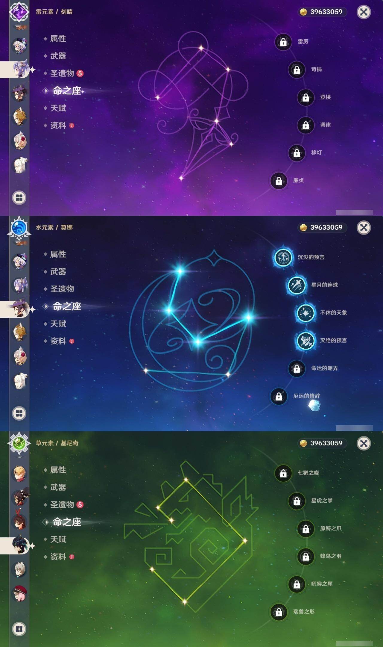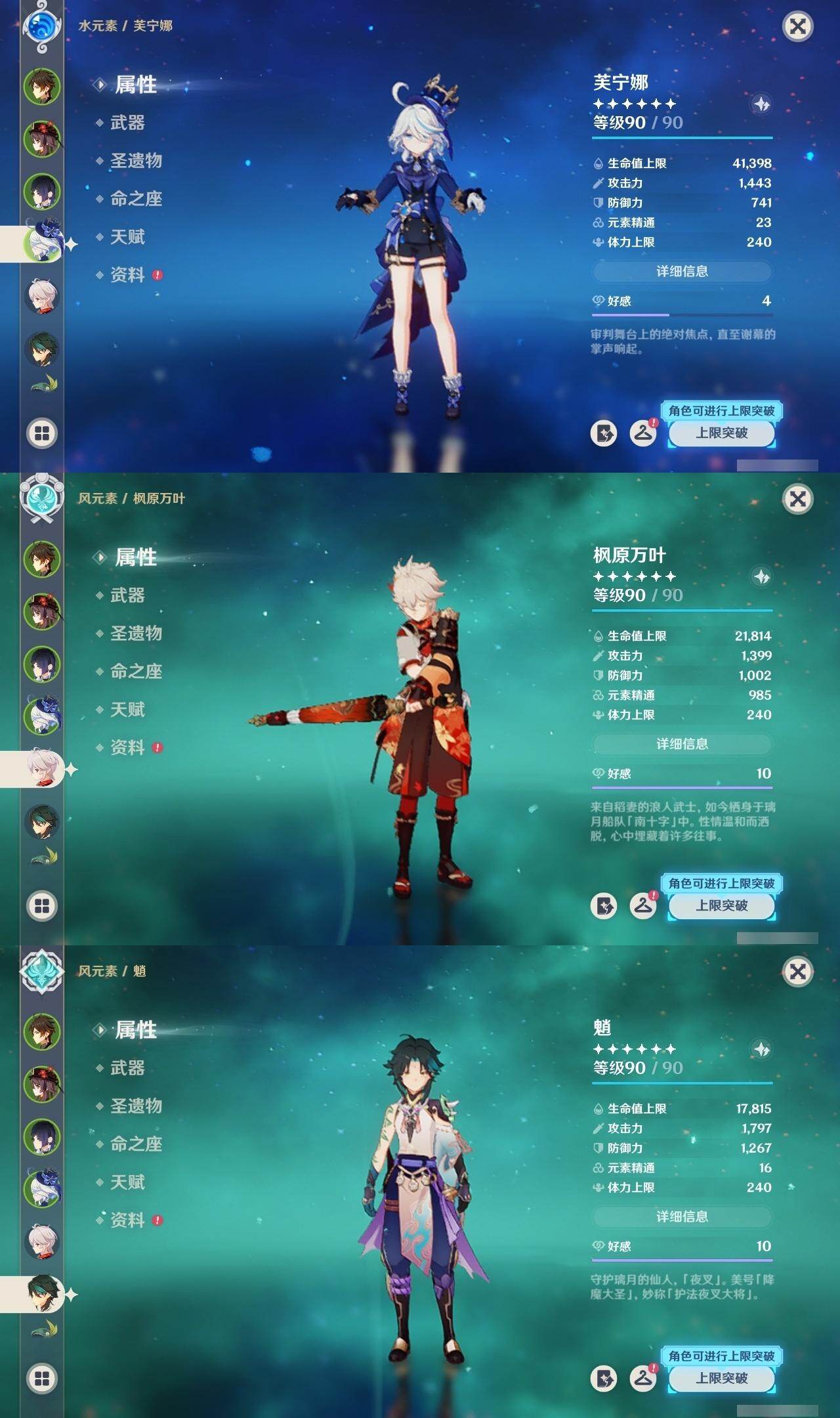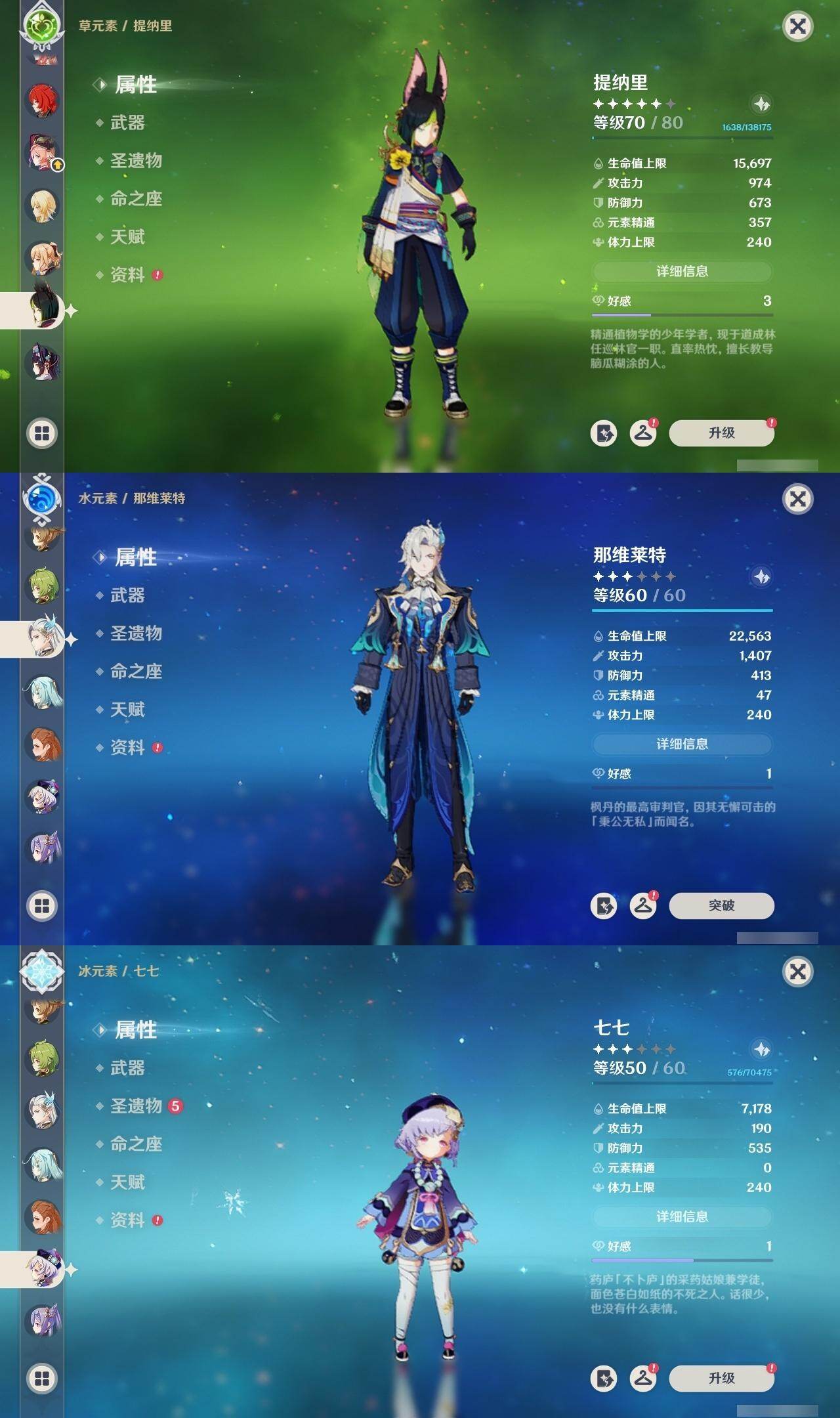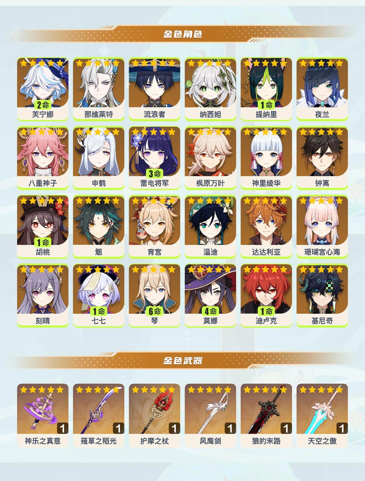 60级/50黄/女主/24个五星角色/7个五星武器 2命芙宁娜0命那维莱特0命流浪者0命纳西妲1命提纳里0命夜兰0命八重神子0命申鹤3命雷电将军0命枫原万叶0命神里绫华0命钟离1命胡桃0命魈0命宵宫0命温迪0命达达利亚0命珊瑚宫心海0命刻晴1命七七满命琴4命莫娜1命迪卢克0命基尼奇精1神乐之真意精1薙草之稻光精1护摩之杖精1风鹰剑精1狼的末路精1天空之傲