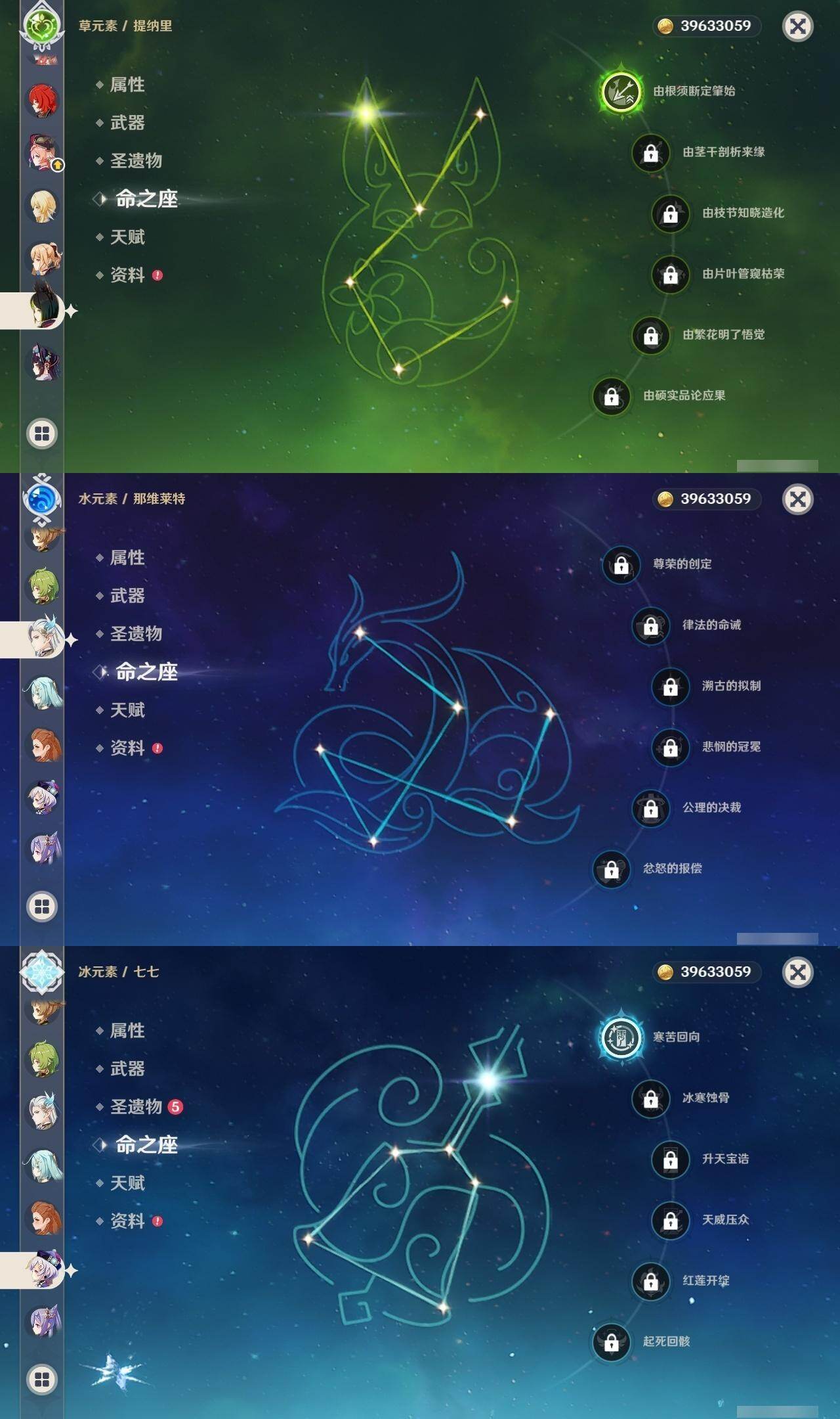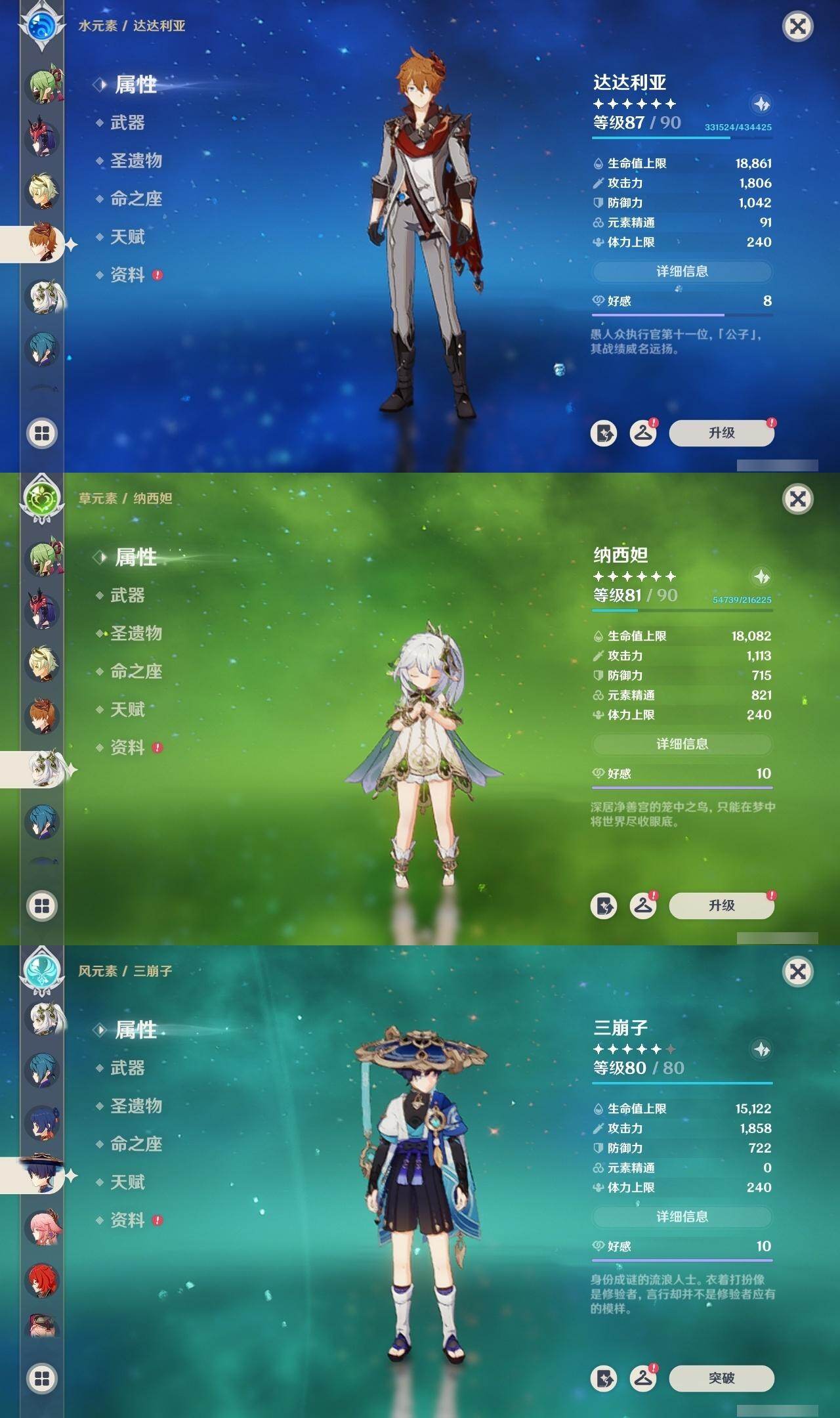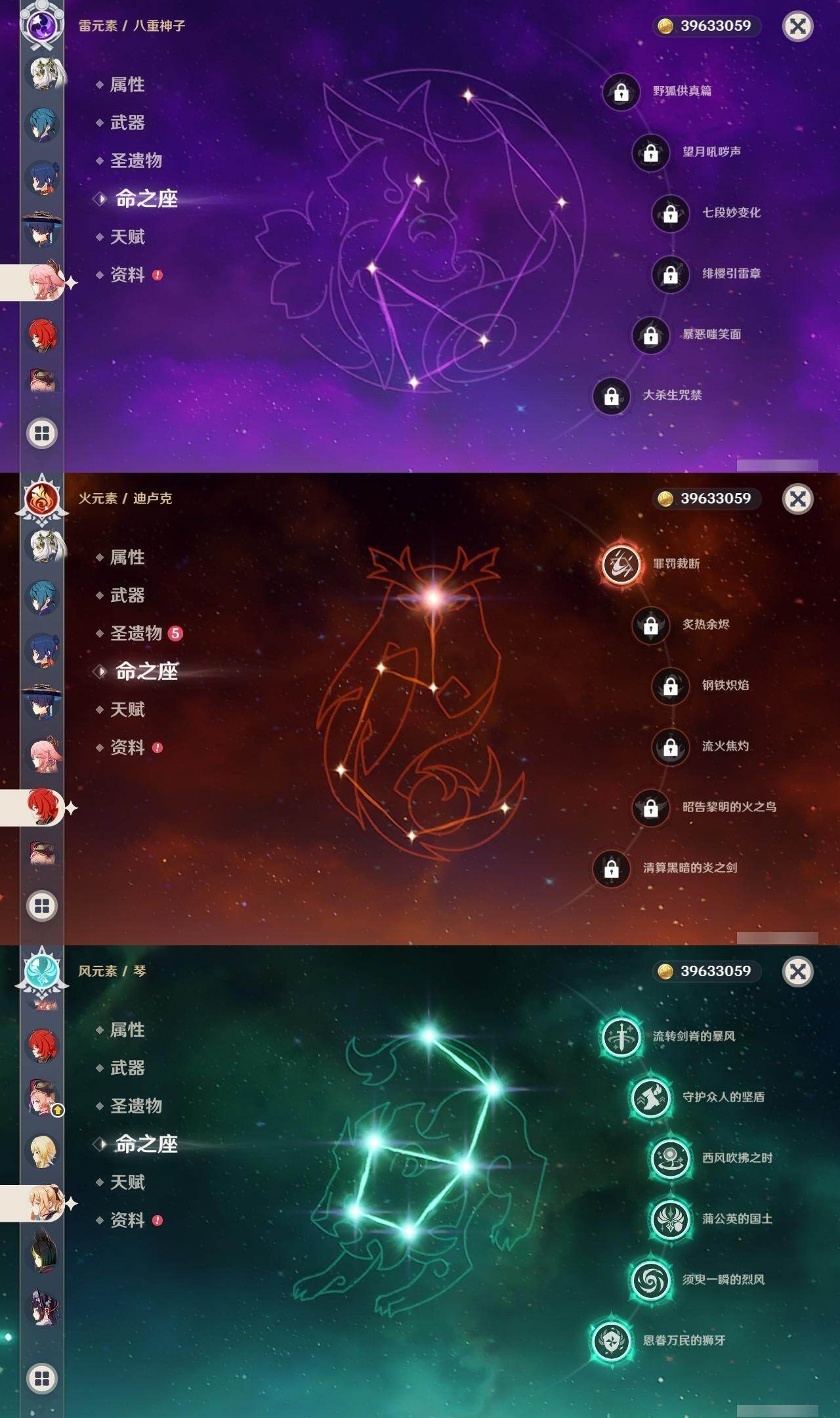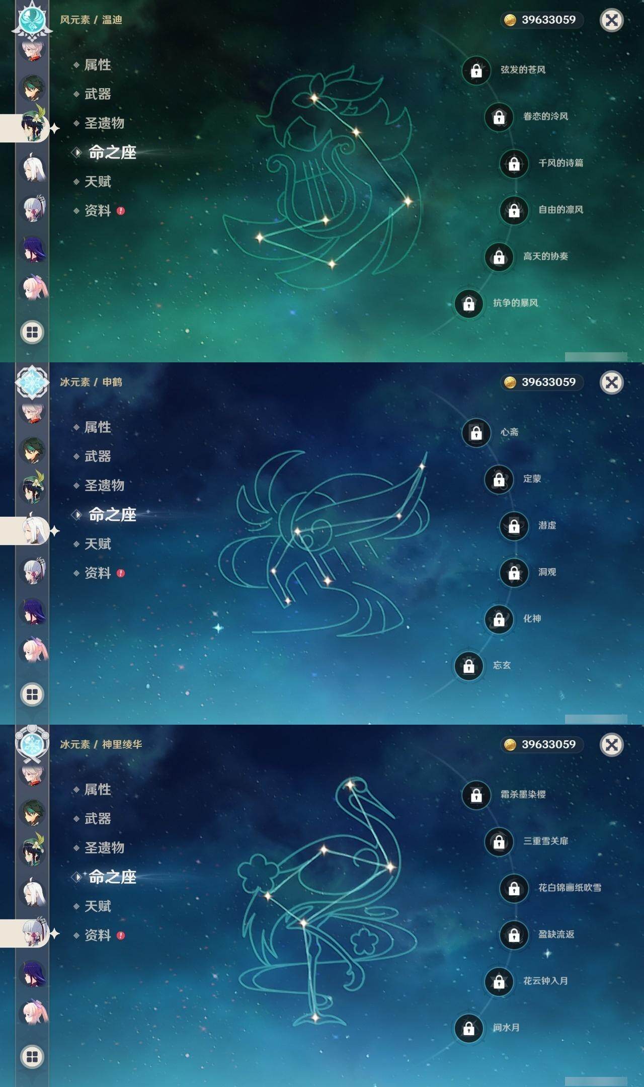 60级/50黄/女主/24个五星角色/7个五星武器 2命芙宁娜0命那维莱特0命流浪者0命纳西妲1命提纳里0命夜兰0命八重神子0命申鹤3命雷电将军0命枫原万叶0命神里绫华0命钟离1命胡桃0命魈0命宵宫0命温迪0命达达利亚0命珊瑚宫心海0命刻晴1命七七满命琴4命莫娜1命迪卢克0命基尼奇精1神乐之真意精1薙草之稻光精1护摩之杖精1风鹰剑精1狼的末路精1天空之傲