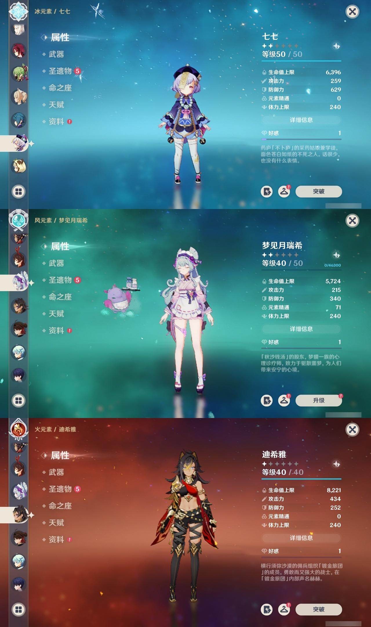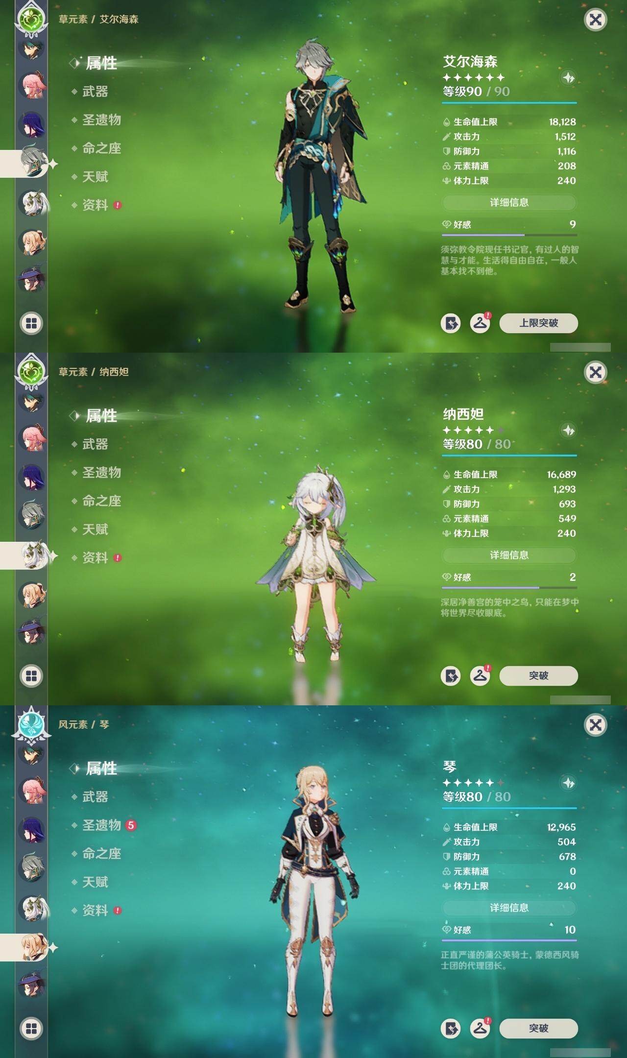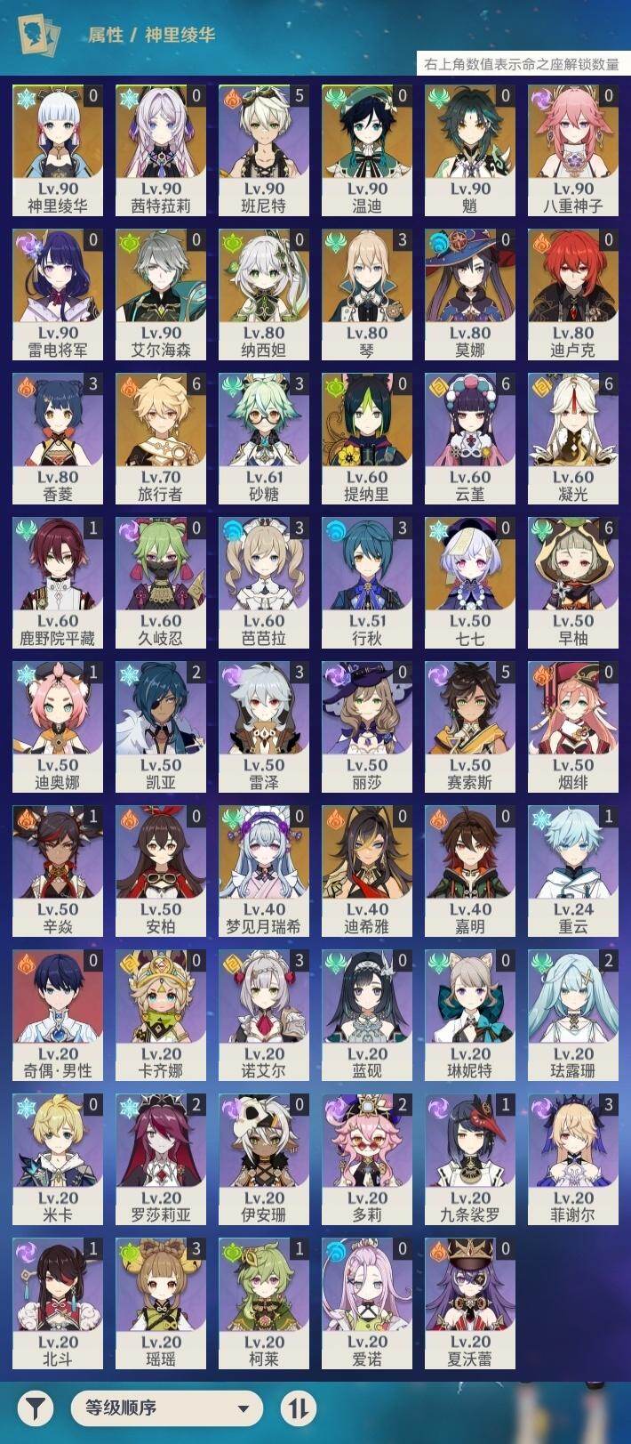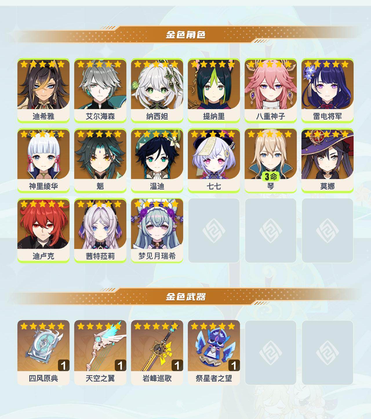 56级/22黄/男主/15个五星角色/4个五星武器 0命迪希雅0命艾尔海森0命纳西妲0命提纳里0命八重神子0命雷电将军0命神里绫华0命魈0命温迪0命七七3命琴0命莫娜0命迪卢克0命茜特菈莉0命梦见月瑞希精1四风原典精1天空之翼精1岩峰巡歌精1祭星者之望