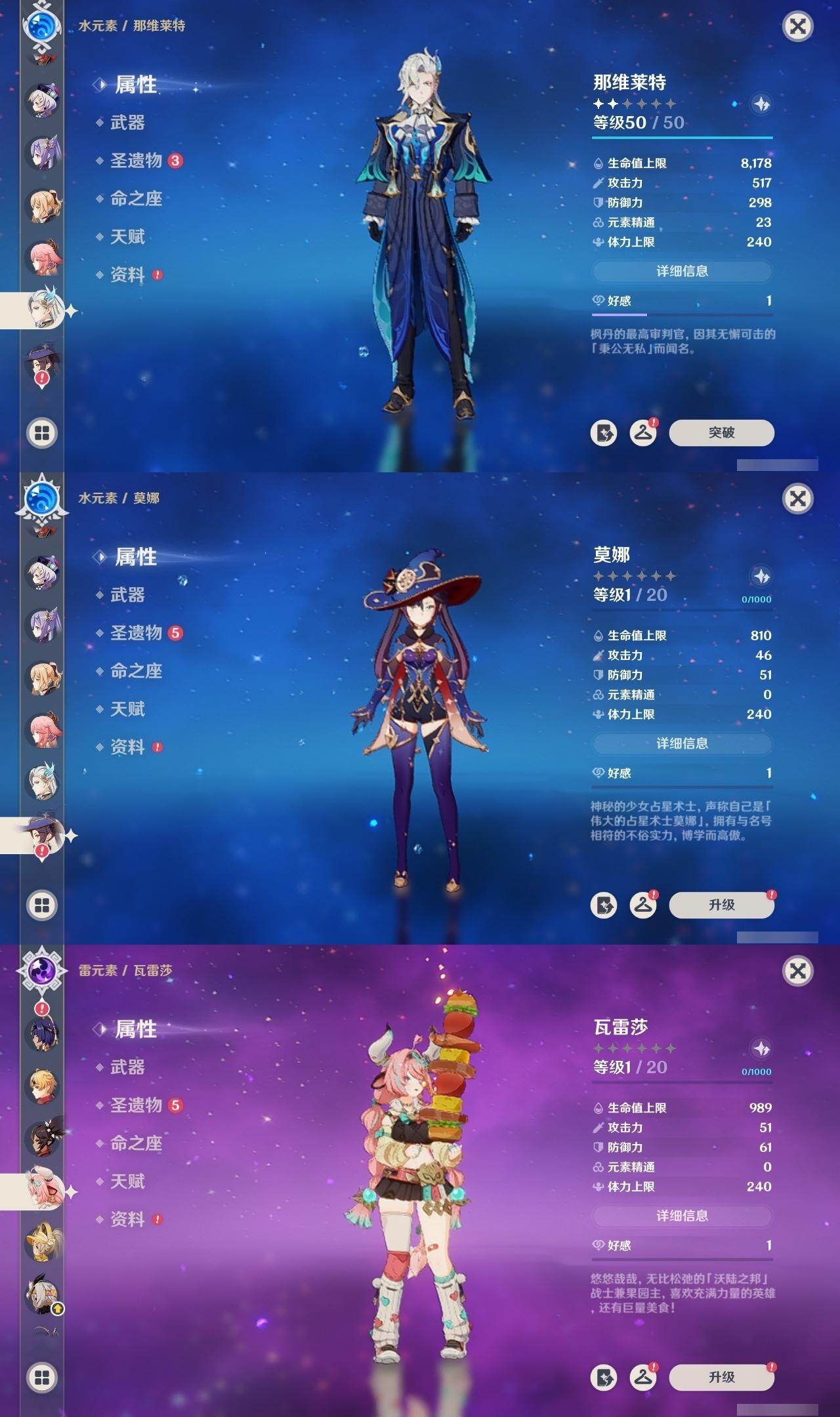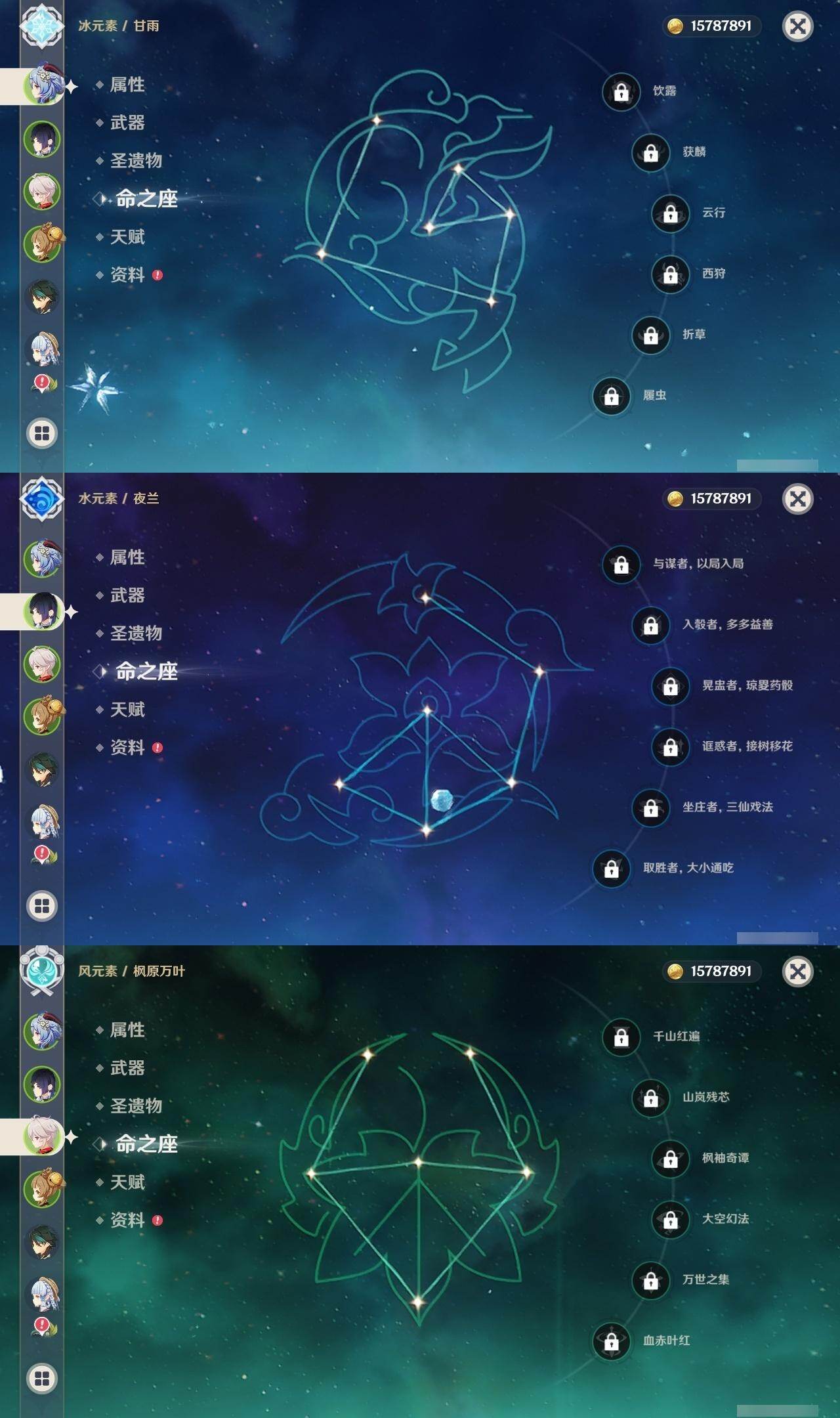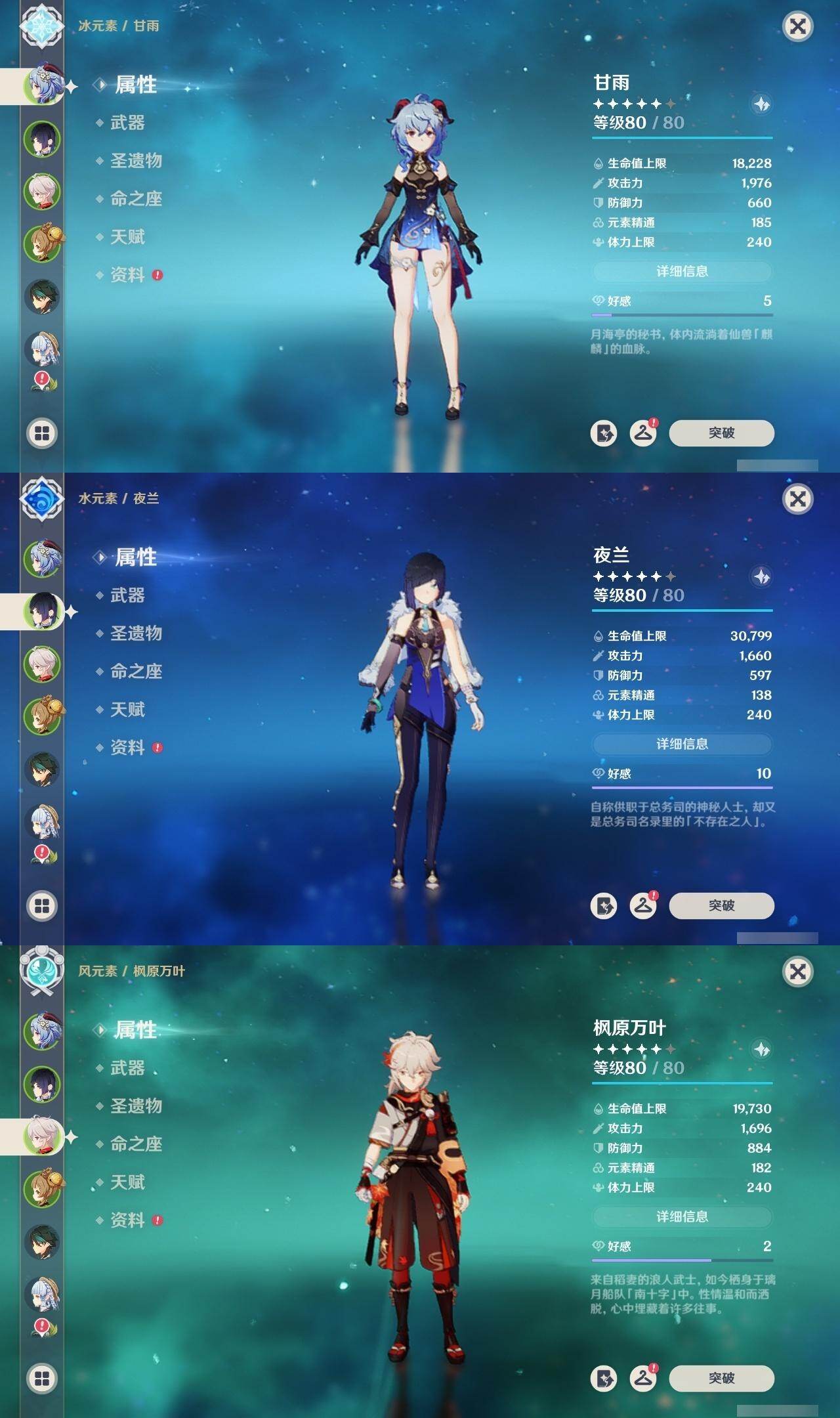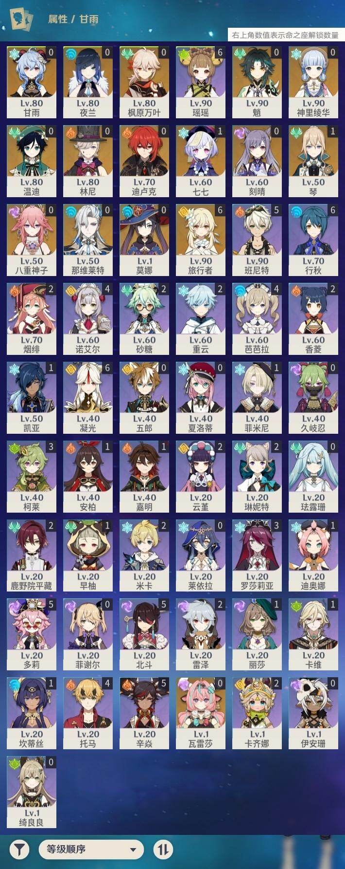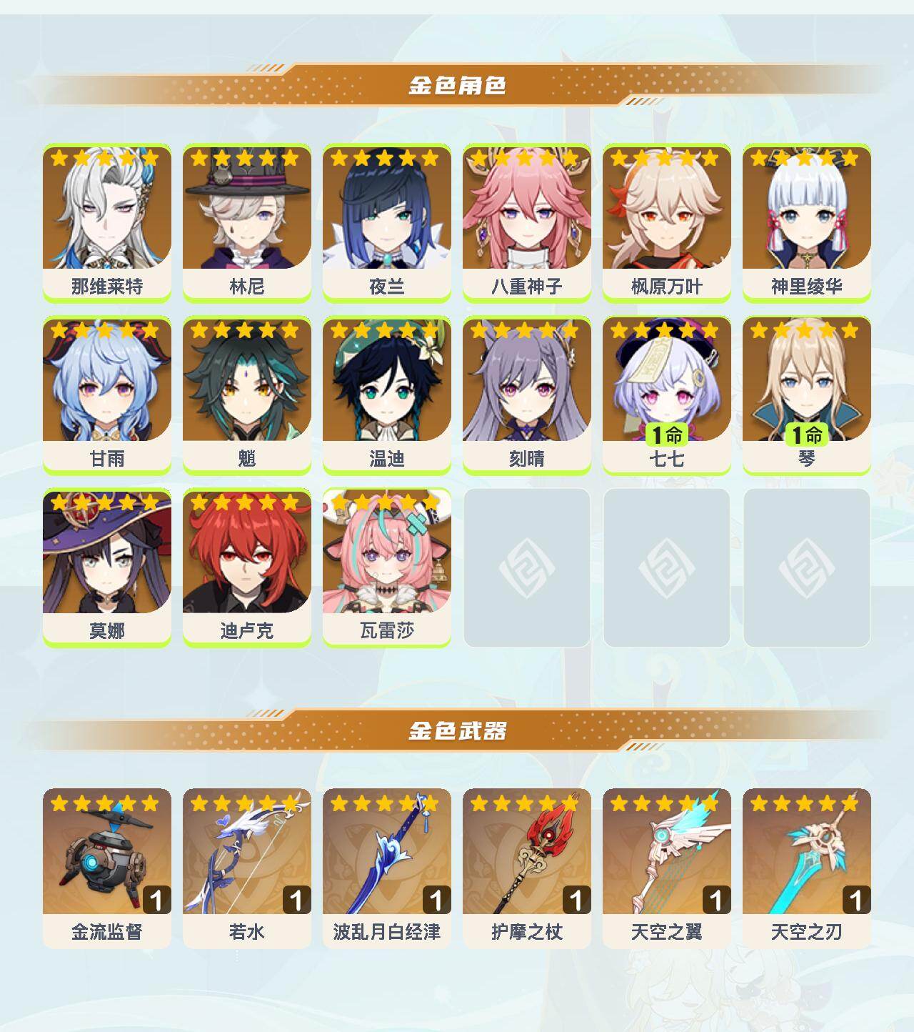 55级/23黄/女主/15个五星角色/6个五星武器 0命那维莱特0命林尼0命夜兰0命八重神子0命枫原万叶0命神里绫华0命甘雨0命魈0命温迪0命刻晴1命七七1命琴0命莫娜0命迪卢克0命瓦雷莎精1金流监督精1若水精1波乱月白经津精1护摩之杖精1天空之翼精1天空之刃