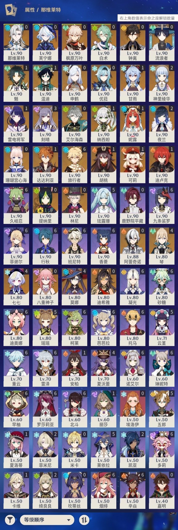 【原神】【lyys10711】冒险等级:60,五星数量:54,五星角色:莫娜 4命七七 4命琴 4命刻晴 3命神里绫华 2命夜兰 2命达达利亚 1命迪卢克 1命甘雨 1命魈 1命胡桃 1命可莉 1命雷电将军 1命温迪 1命妮露 1命纳西妲 1命珊瑚宫心海白术优菈迪希雅钟离申鹤八重神子林尼那维莱特芙宁娜提纳里阿蕾奇诺艾尔海森流浪者枫原万叶__五星武器:天空之傲 4精和璞鸢 2精护摩之杖 2精天空之脊 2精天空之卷 2精天空之翼 2精碧落之珑最初的大魔术万世流涌大典静水流涌之辉赤月之形阿莫斯之弓风鹰剑磐岩结绿四风原典松籁响起之时雾切之回光薙草之稻光终末嗟叹之诗若水圣显之钥千夜浮梦__四星角色:班尼特 6命行秋 6命九条裟罗 6命香菱 6命久岐忍 6命凝光 6命迪奥娜 6命砂糖 6命多莉 6命柯莱 6命芭芭拉 6命早柚 6命托马 6命烟绯 6命重云 6命辛焱 6命诺艾尔 6命罗莎莉亚 6命雷泽 6命菲谢尔 6命北斗 6命琳妮特 6命珐露珊 5命瑶瑶 5命莱依拉 5命云堇 5命五郎 5命夏沃蕾 4命绮良良 2命菲米尼 2命卡维 1命夏洛蒂 1命埃洛伊鹿野院平藏米卡坎蒂丝嘉明