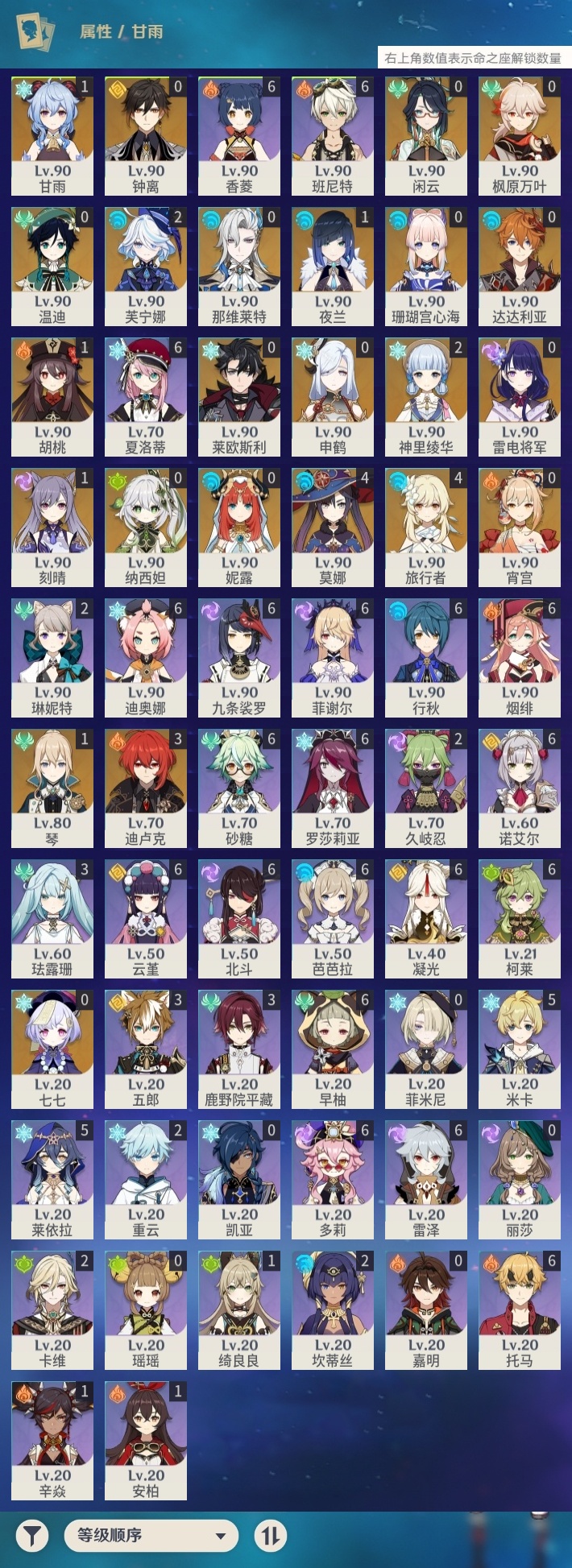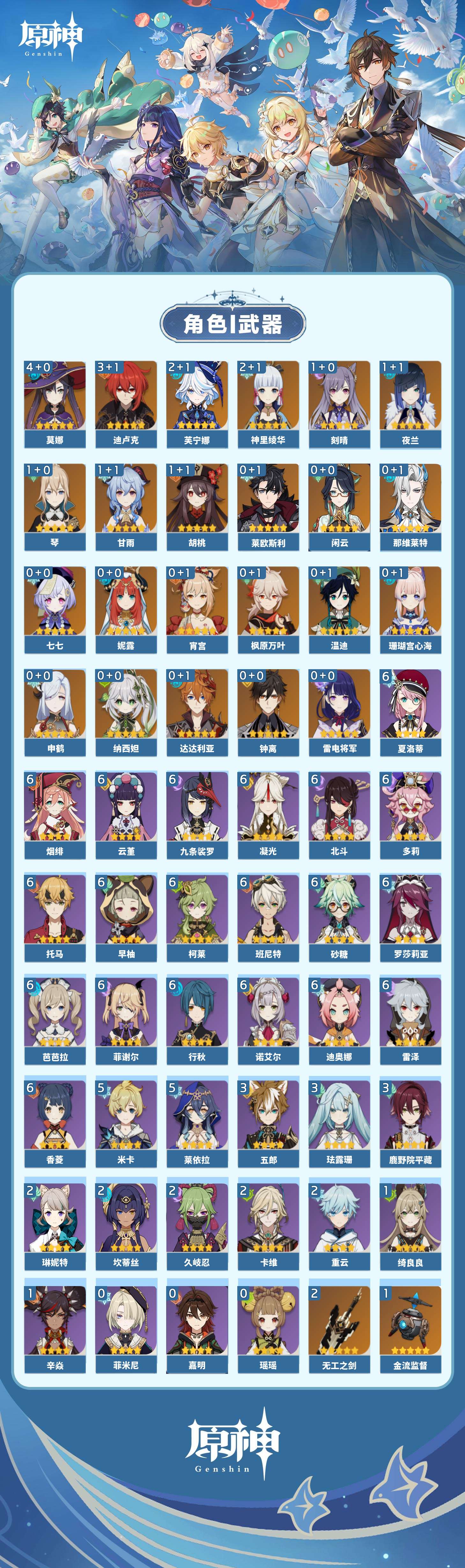 【原神】【lyys10718】冒险等级:60,五星数量:44,五星角色:莫娜 4命迪卢克 3命芙宁娜 2命神里绫华 2命甘雨 1命胡桃 1命刻晴 1命琴 1命夜兰 1命七七珊瑚宫心海温迪宵宫钟离达达利亚申鹤那维莱特莱欧斯利闲云妮露纳西妲枫原万叶雷电将军__五星武器:无工之剑 2精碧落之珑万世流涌大典金流监督静水流涌之辉阿莫斯之弓不灭月华苍古自由之誓飞雷之弦振风鹰剑护摩之杖狼的末路磐岩结绿四风原典天空之傲天空之脊天空之翼雾切之回光终末嗟叹之诗冬极白星若水__四星角色:班尼特 6命行秋 6命九条裟罗 6命香菱 6命凝光 6命迪奥娜 6命砂糖 6命多莉 6命柯莱 6命芭芭拉 6命云堇 6命早柚 6命托马 6命烟绯 6命诺艾尔 6命罗莎莉亚 6命雷泽 6命菲谢尔 6命北斗 6命夏洛蒂 6命莱依拉 5命米卡 5命鹿野院平藏 3命珐露珊 3命五郎 3命久岐忍 2命坎蒂丝 2命卡维 2命重云 2命琳妮特 2命绮良良 1命辛焱 1命瑶瑶菲米尼嘉明