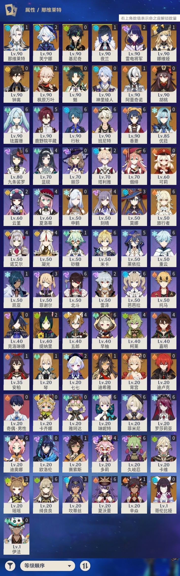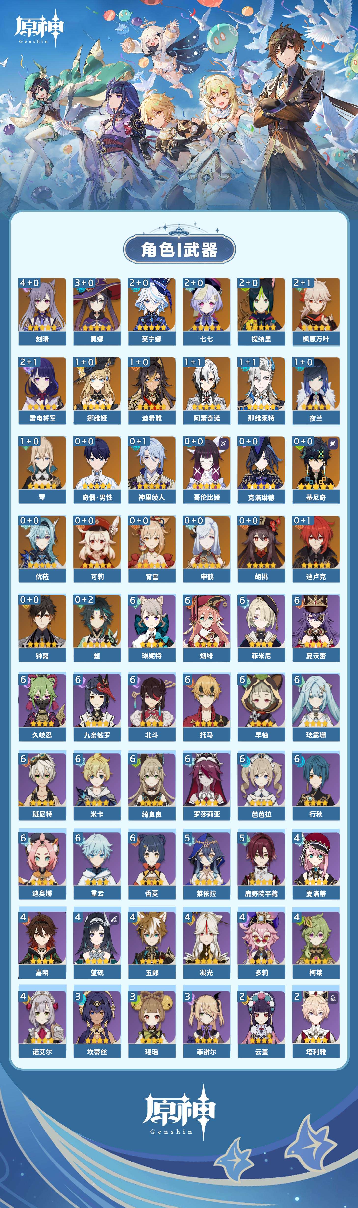 【原神】【lyys10725】冒险等级:60,五星数量:36,五星角色:刻晴 4命莫娜 3命芙宁娜 2命枫原万叶 2命雷电将军 2命七七 2命提纳里 2命迪希雅 1命那维莱特 1命娜维娅 1命阿蕾奇诺 1命琴 1命夜兰 1命基尼奇宵宫优菈钟离申鹤神里绫人迪卢克哥伦比娅魈胡桃克洛琳德可莉__五星武器:和璞鸢 2精万世流涌大典赤月之形真语秘匣裁叶萃光苍古自由之誓狼的末路天空之傲薙草之稻光波乱月白经津__四星角色:班尼特 6命行秋 6命九条裟罗 6命香菱 6命久岐忍 6命珐露珊 6命迪奥娜 6命绮良良 6命米卡 6命芭芭拉 6命早柚 6命托马 6命烟绯 6命重云 6命罗莎莉亚 6命北斗 6命菲米尼 6命琳妮特 6命夏沃蕾 6命鹿野院平藏 5命莱依拉 5命凝光 4命多莉 4命柯莱 4命蓝砚 4命五郎 4命诺艾尔 4命夏洛蒂 4命嘉明 4命瑶瑶 3命坎蒂丝 3命菲谢尔 3命云堇 2命雷泽 2命塔利雅 2命砂糖 1命辛焱 1命赛索斯 1命奇偶·男性卡齐娜卡维欧洛伦伊法