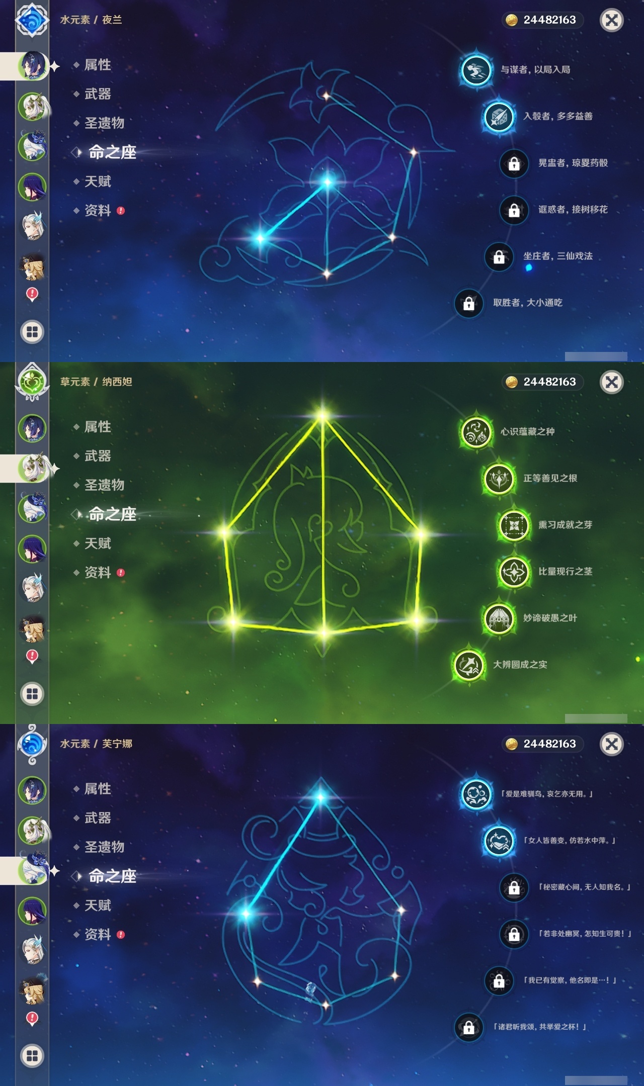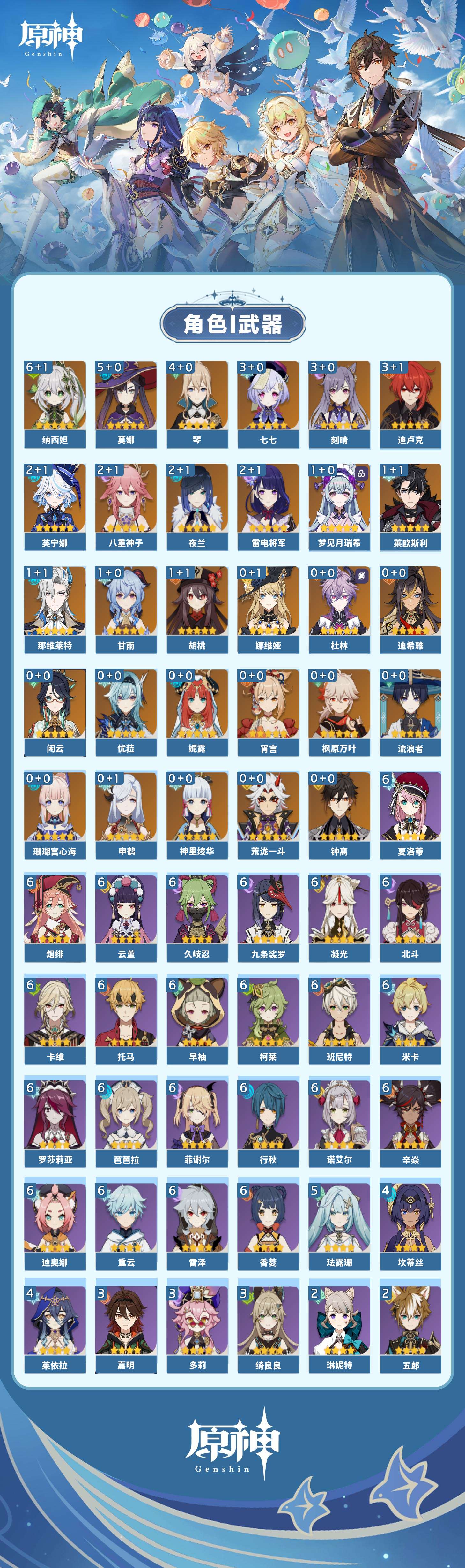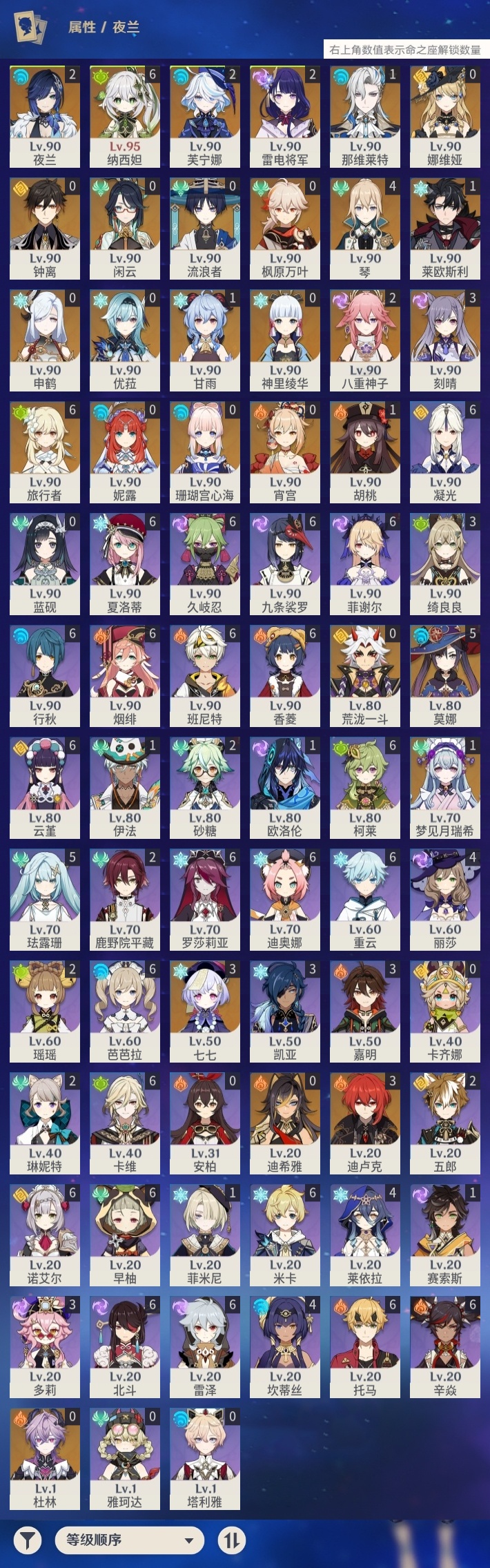 【原神】【lyys10727】冒险等级:60,五星数量:44,五星角色:纳西妲 6命莫娜 5命琴 4命迪卢克 3命刻晴 3命七七 3命芙宁娜 2命雷电将军 2命八重神子 2命夜兰 2命梦见月瑞希 1命那维莱特 1命莱欧斯利 1命甘雨 1命胡桃 1命珊瑚宫心海神里绫华宵宫优菈迪希雅钟离荒泷一斗申鹤娜维娅闲云妮露流浪者杜林枫原万叶__五星武器:万世流涌大典金流监督静水流涌之辉裁断风鹰剑护摩之杖狼的末路磐岩结绿天空之傲天空之脊薙草之稻光息灾神乐之真意若水千夜浮梦__四星角色:班尼特 6命行秋 6命九条裟罗 6命香菱 6命久岐忍 6命凝光 6命迪奥娜 6命米卡 6命柯莱 6命卡维 6命芭芭拉 6命云堇 6命早柚 6命托马 6命烟绯 6命重云 6命辛焱 6命诺艾尔 6命罗莎莉亚 6命雷泽 6命菲谢尔 6命北斗 6命夏洛蒂 6命珐露珊 5命莱依拉 4命坎蒂丝 4命绮良良 3命多莉 3命嘉明 3命鹿野院平藏 2命砂糖 2命瑶瑶 2命五郎 2命琳妮特 2命欧洛伦 1命菲米尼 1命伊法 1命赛索斯 1命卡齐娜蓝砚塔利雅