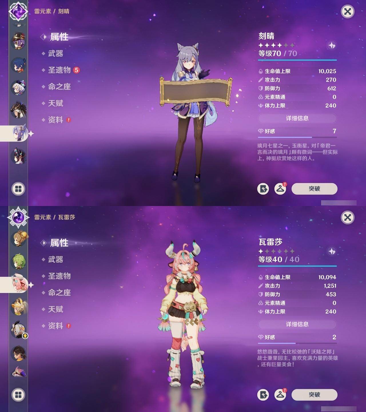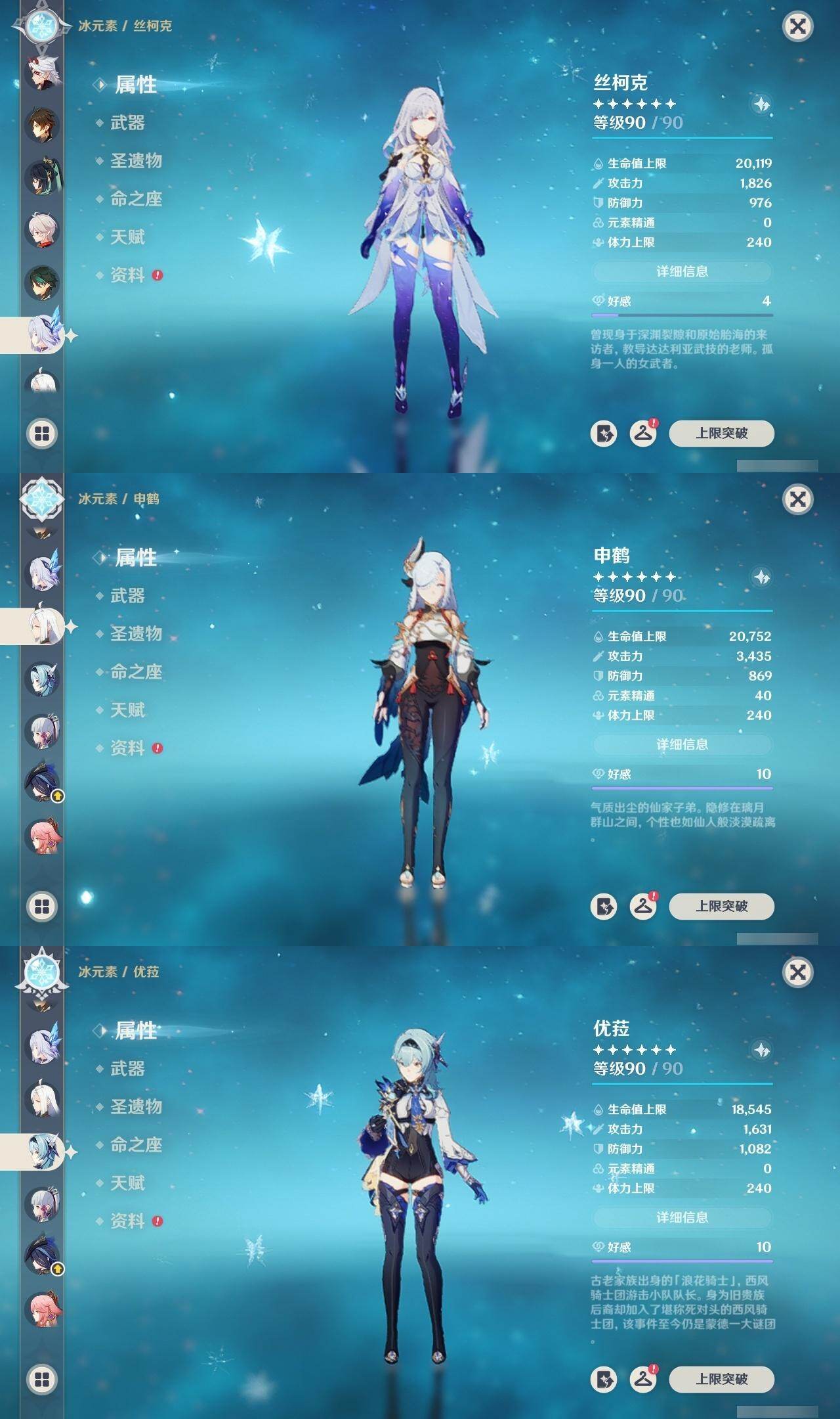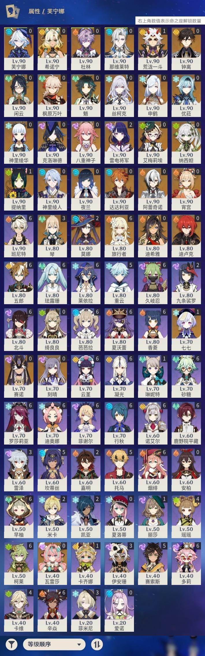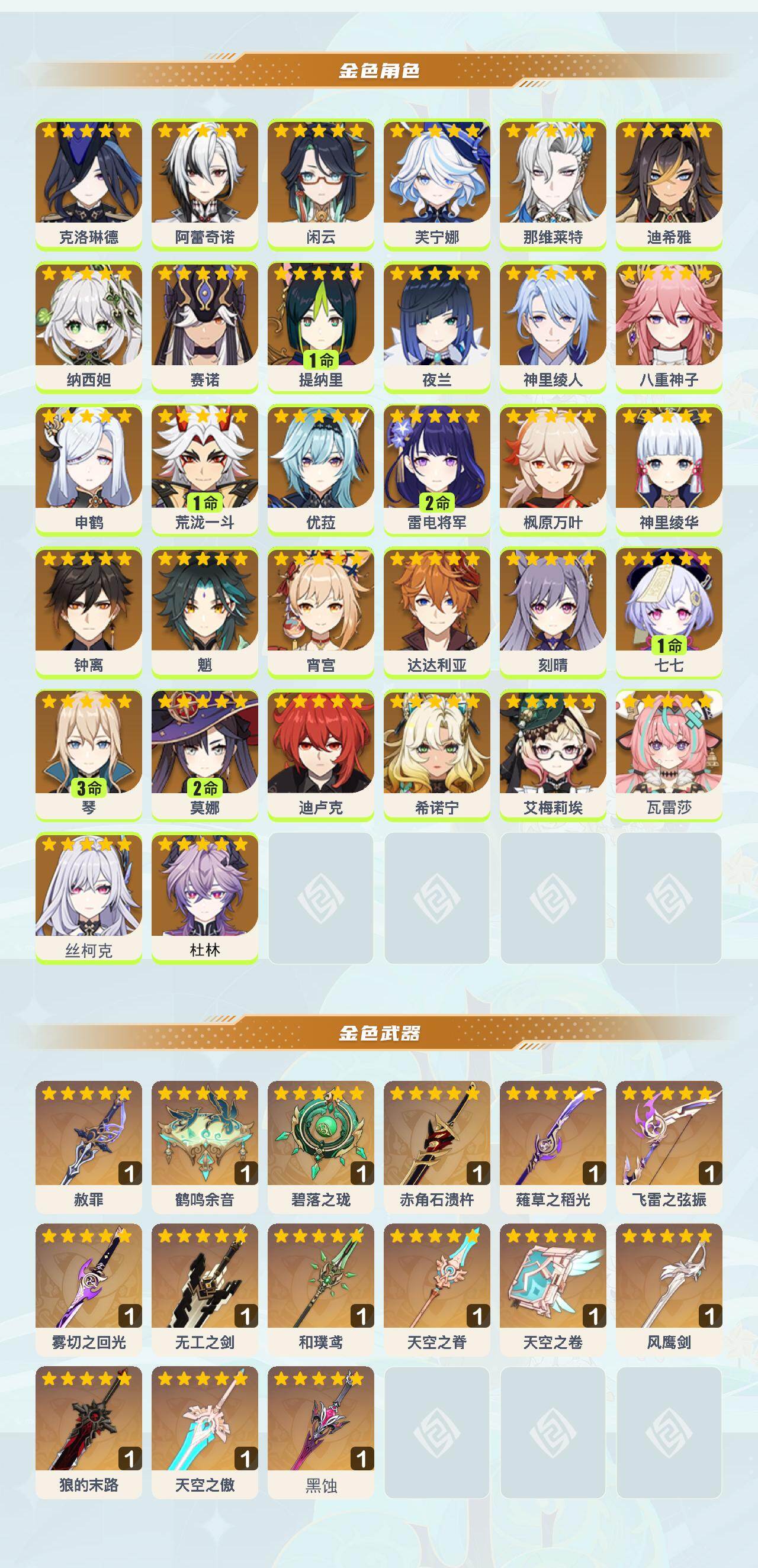 60级/61黄/女主/32个五星角色/19个五星武器 0命克洛琳德0命阿蕾奇诺0命闲云0命芙宁娜0命那维莱特0命迪希雅0命纳西妲0命赛诺1命提纳里0命夜兰0命神里绫人0命八重神子0命申鹤1命荒泷一斗0命优菈2命雷电将军0命枫原万叶0命神里绫华0命钟离0命魈0命宵宫0命达达利亚0命刻晴1命七七3命琴2命莫娜0命迪卢克0命希诺宁0命艾梅莉埃0命瓦雷莎0命丝柯克0命杜林精1赦罪精1鹤鸣余音精1碧落之珑精1赤角石溃杵精1薙草之稻光精1飞雷之弦振精1雾切之回光精1无工之剑精1和璞鸢精1天空之脊精1天空之卷精1风鹰剑精1狼的末路精1天空之傲精1黑蚀