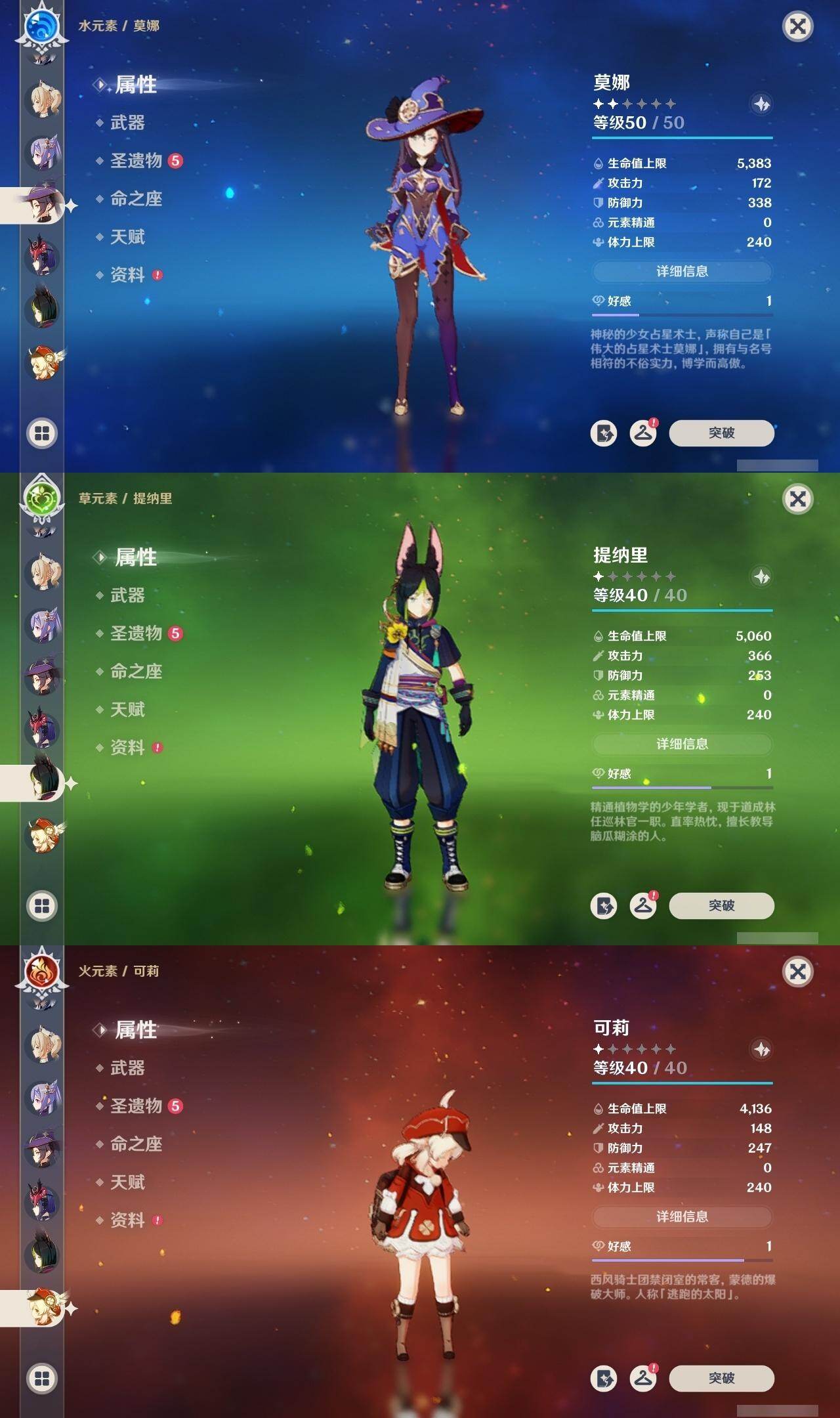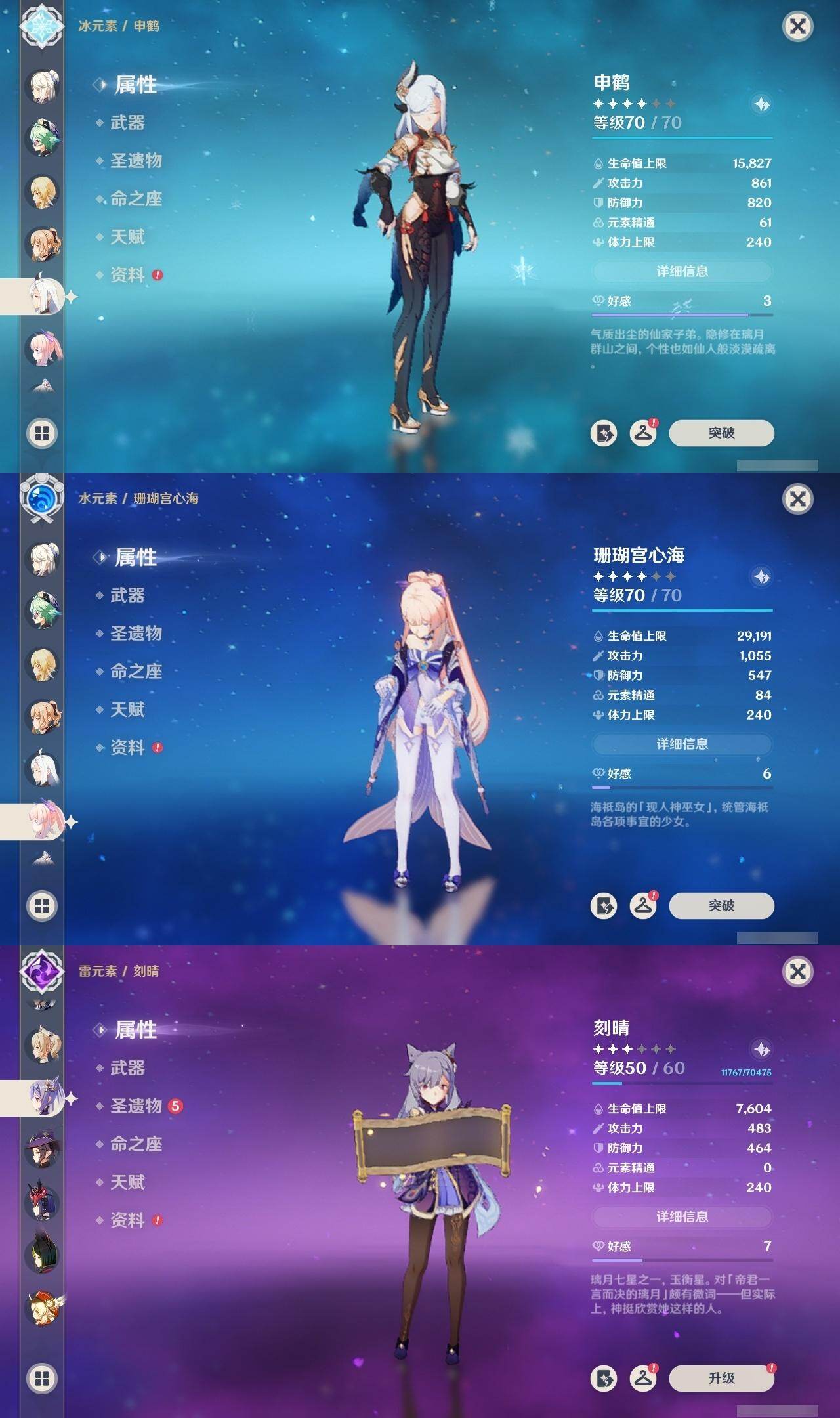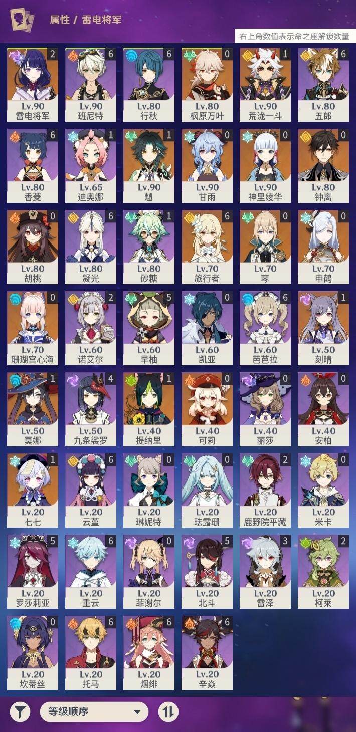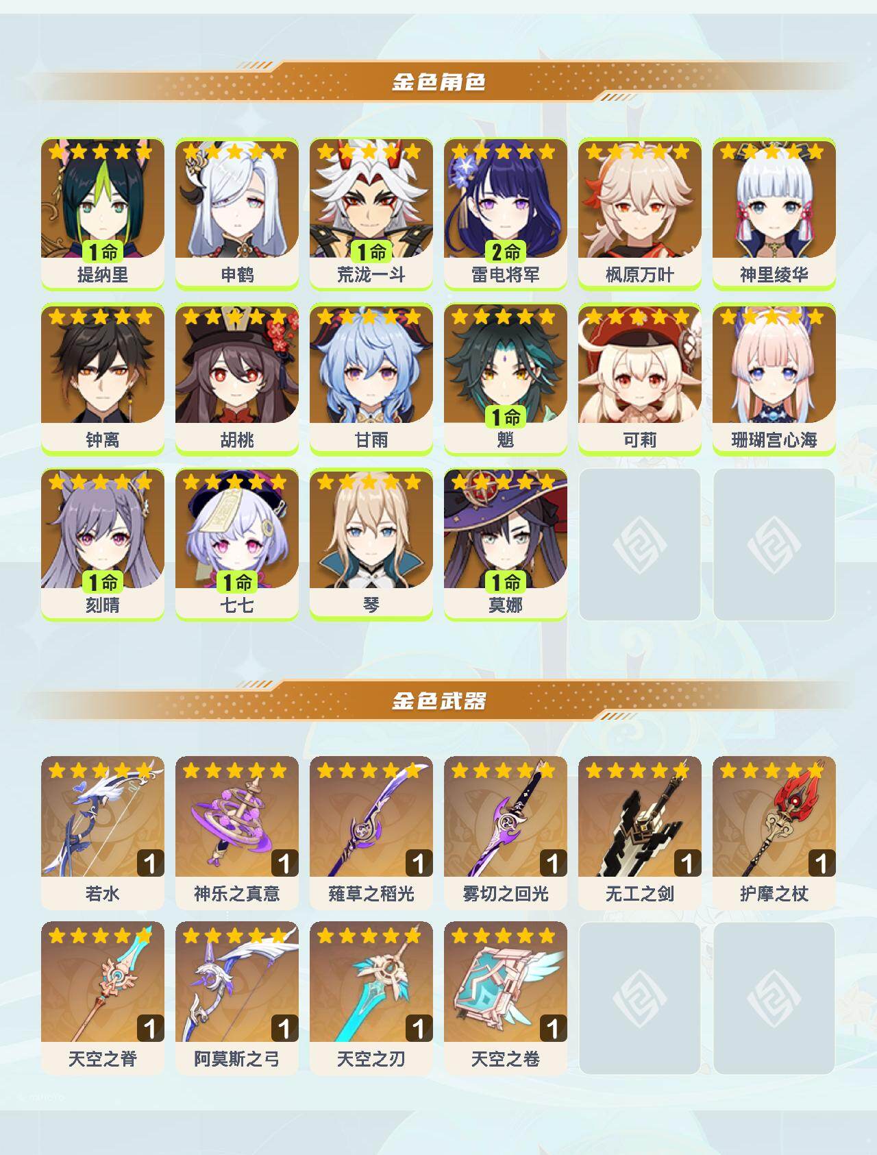 56级/34黄/女主/16个五星角色/10个五星武器 1命提纳里0命申鹤1命荒泷一斗2命雷电将军0命枫原万叶0命神里绫华0命钟离0命胡桃0命甘雨1命魈0命可莉0命珊瑚宫心海1命刻晴1命七七0命琴1命莫娜精1若水精1神乐之真意精1薙草之稻光精1雾切之回光精1无工之剑精1护摩之杖精1天空之脊精1阿莫斯之弓精1天空之刃精1天空之卷