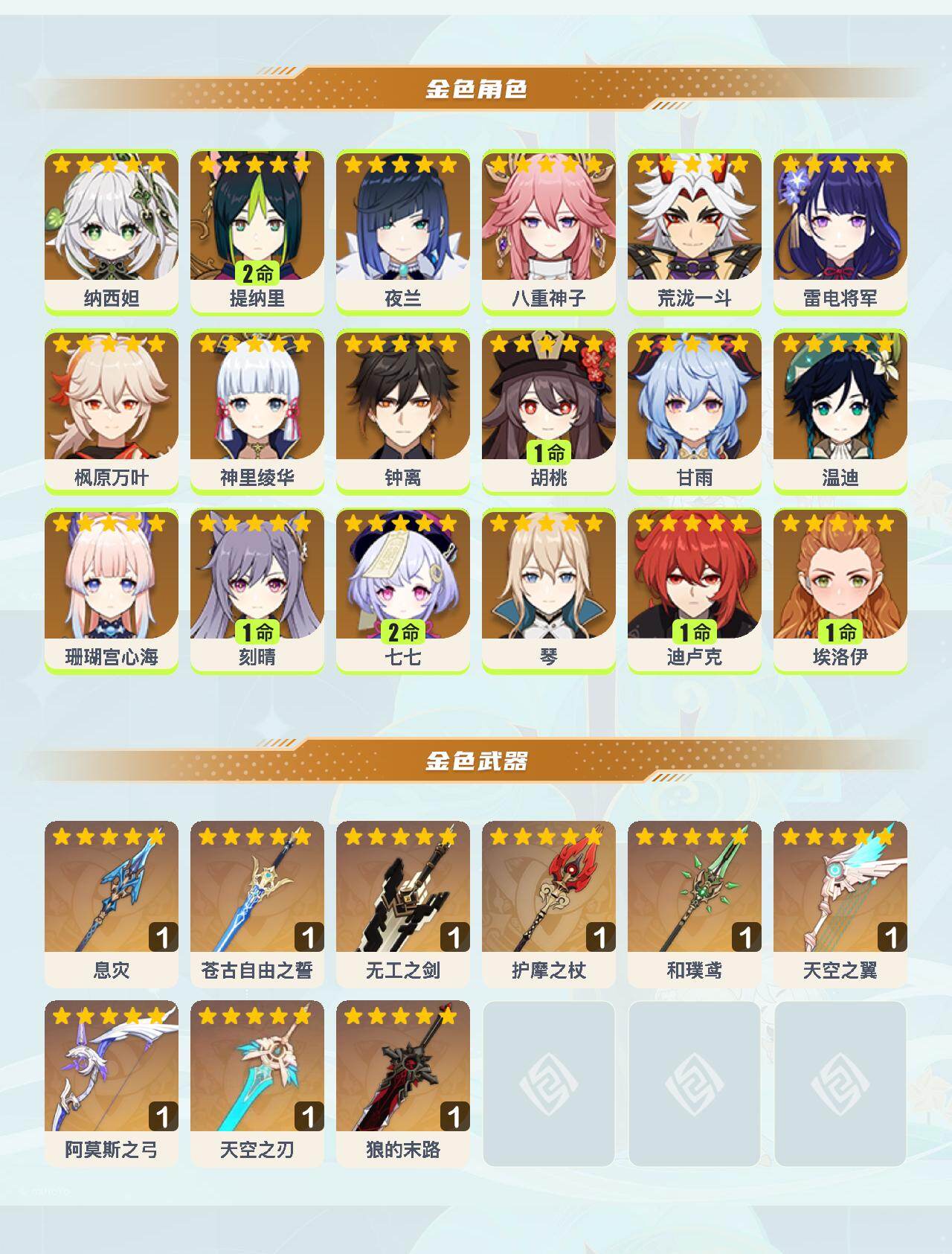 【ysyt612】59级/37黄/女主/18个五星角色/12个五星武器/0命八重神子/0命夜兰/0命纳西妲/0命钟离/0命甘雨/0命神里绫华/0命雷电将军/1命胡桃/0命枫原万叶/0命温迪/0命珊瑚宫心海/0命荒泷一斗/1命刻晴/2命七七/2命提纳里/1命迪卢克/0命琴/0命埃洛伊/精1阿莫斯之弓/精1天空之翼/精1和璞鸢/精1护摩之杖/精1苍古自由之誓/精1息灾/精1无工之剑/精1狼的末路/精1天空之刃