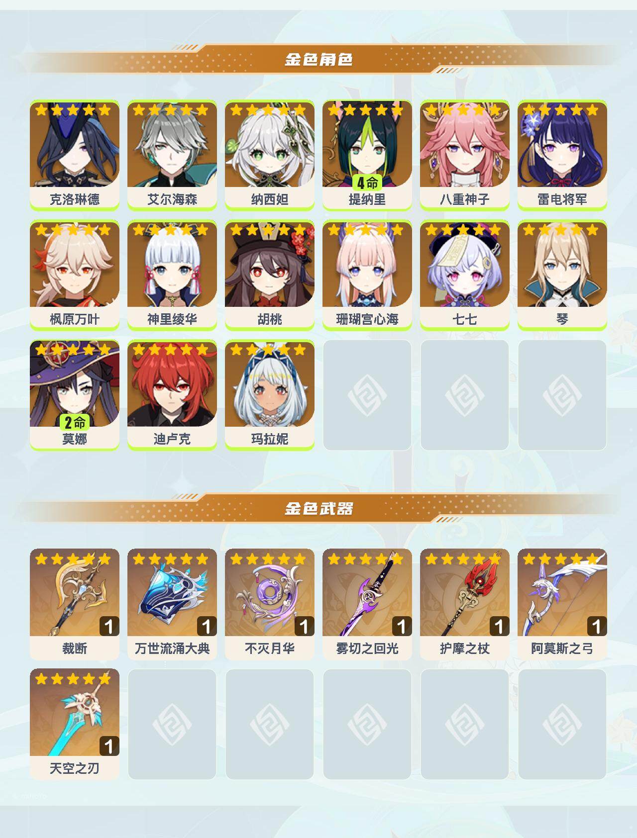 【ysyt618】59级/30黄/女主/15个五星角色/9个五星武器/0命克洛琳德/0命纳西妲/0命玛拉妮/0命枫原万叶/0命神里绫华/0命八重神子/0命雷电将军/0命艾尔海森/0命珊瑚宫心海/0命胡桃/4命提纳里/2命莫娜/0命七七/0命迪卢克/0命琴/精1不灭月华/精1护摩之杖/精1雾切之回光/精1天空之刃/精1裁断/精1万世流涌大典/精1阿莫斯之弓