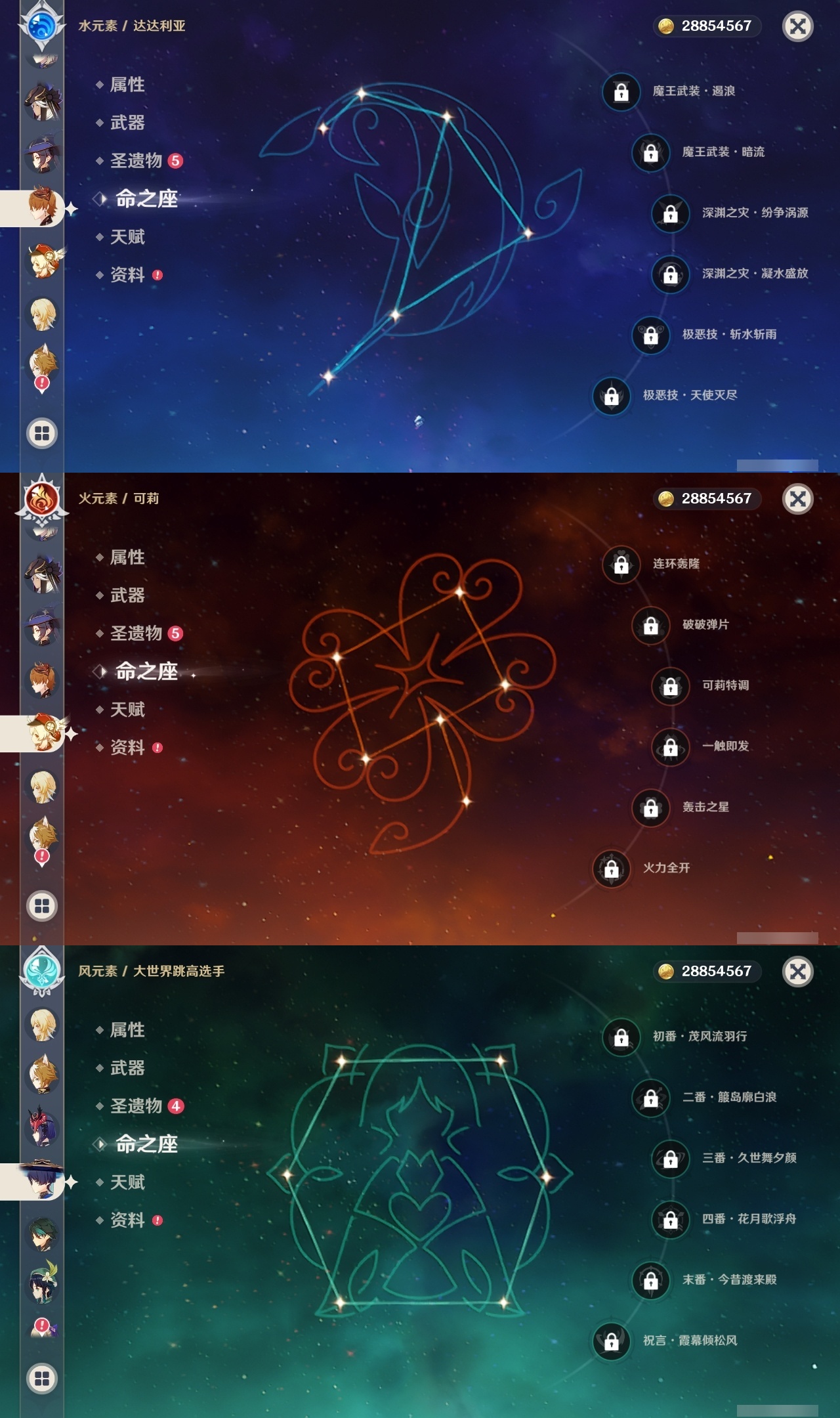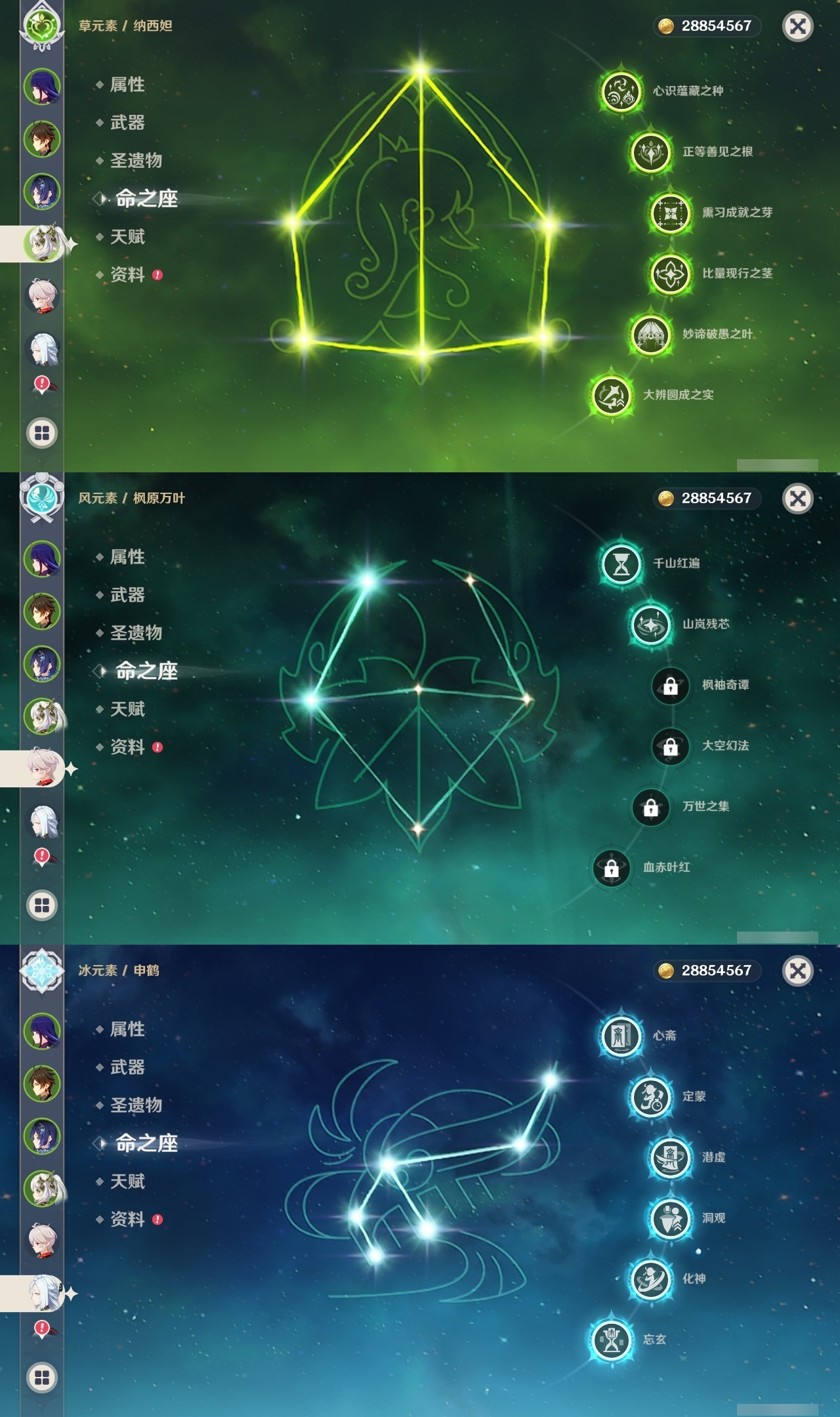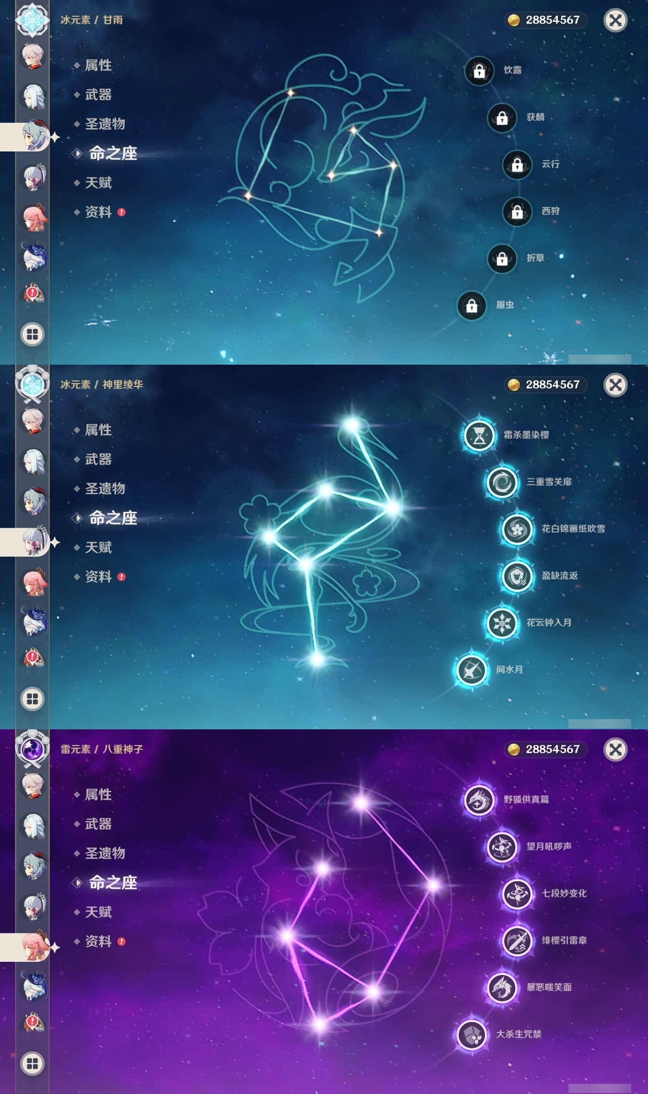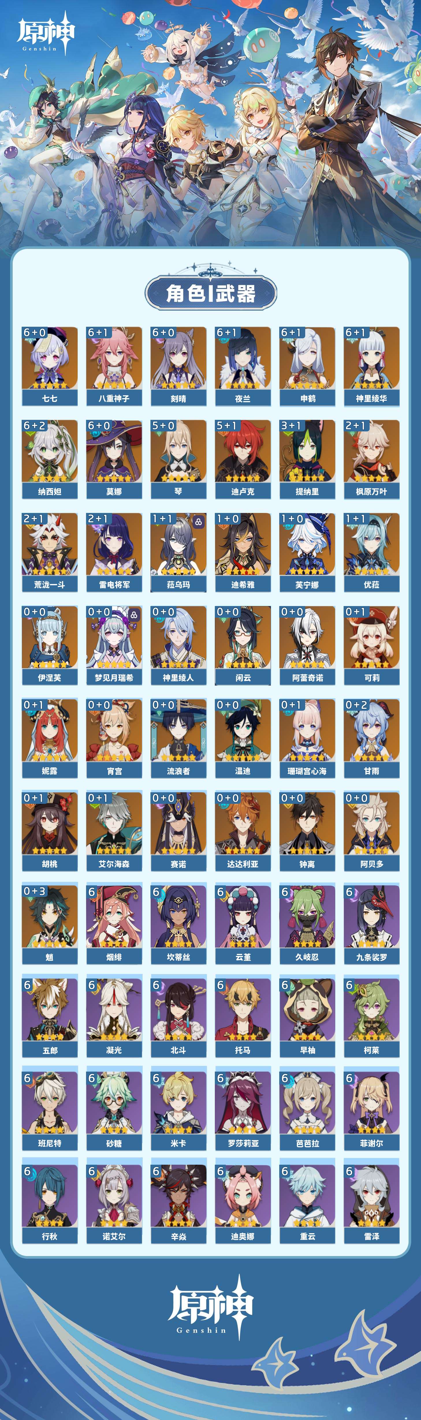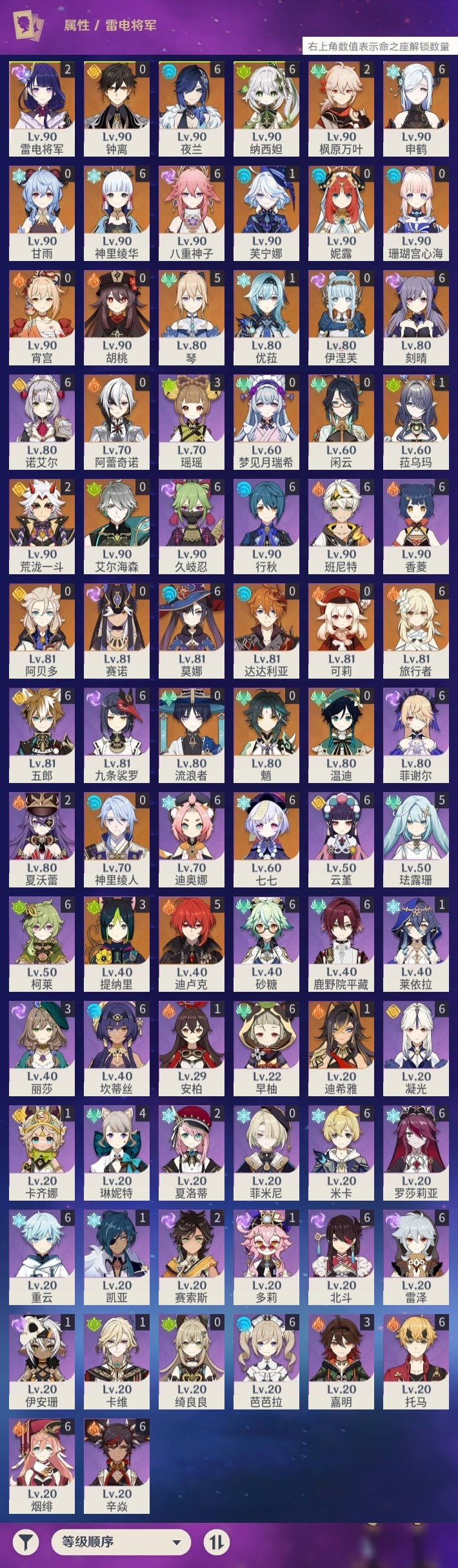 【原神】满命,冒险等级:60,五星数量:61,五星角色:刻晴 6命莫娜 6命七七 6命神里绫华 6命申鹤 6命八重神子 6命夜兰 6命纳西妲 6命迪卢克 5命琴 5命提纳里 3命枫原万叶 2命雷电将军 2命荒泷一斗 2命迪希雅 1命芙宁娜 1命菈乌玛 1命优菈 1命珊瑚宫心海温迪宵宫钟离达达利亚梦见月瑞希神里绫人阿贝多闲云赛诺阿蕾奇诺妮露伊涅芙艾尔海森流浪者甘雨魈胡桃可莉__五星武器:和璞鸢 3精阿莫斯之弓 2精天空之翼 2精千夜浮梦 2精纺夜天镜裁叶萃光不灭月华苍古自由之誓护摩之杖狼的末路四风原典松籁响起之时天空之傲天空之脊天空之卷天空之刃雾切之回光薙草之稻光赤角石溃杵息灾神乐之真意若水猎人之径圣显之钥__四星角色:班尼特 6命行秋 6命九条裟罗 6命香菱 6命久岐忍 6命鹿野院平藏 6命凝光 6命迪奥娜 6命砂糖 6命米卡 6命坎蒂丝 6命柯莱 6命芭芭拉 6命云堇 6命早柚 6命托马 6命五郎 6命烟绯 6命重云 6命辛焱 6命诺艾尔 6命罗莎莉亚 6命雷泽 6命菲谢尔 6命北斗 6命珐露珊 5命琳妮特 4命瑶瑶 3命嘉明 3命夏洛蒂 2命夏沃蕾 2命赛索斯 2命卡齐娜 1命莱依拉 1命多莉 1命卡维 1命伊安珊 1命绮良良菲米尼