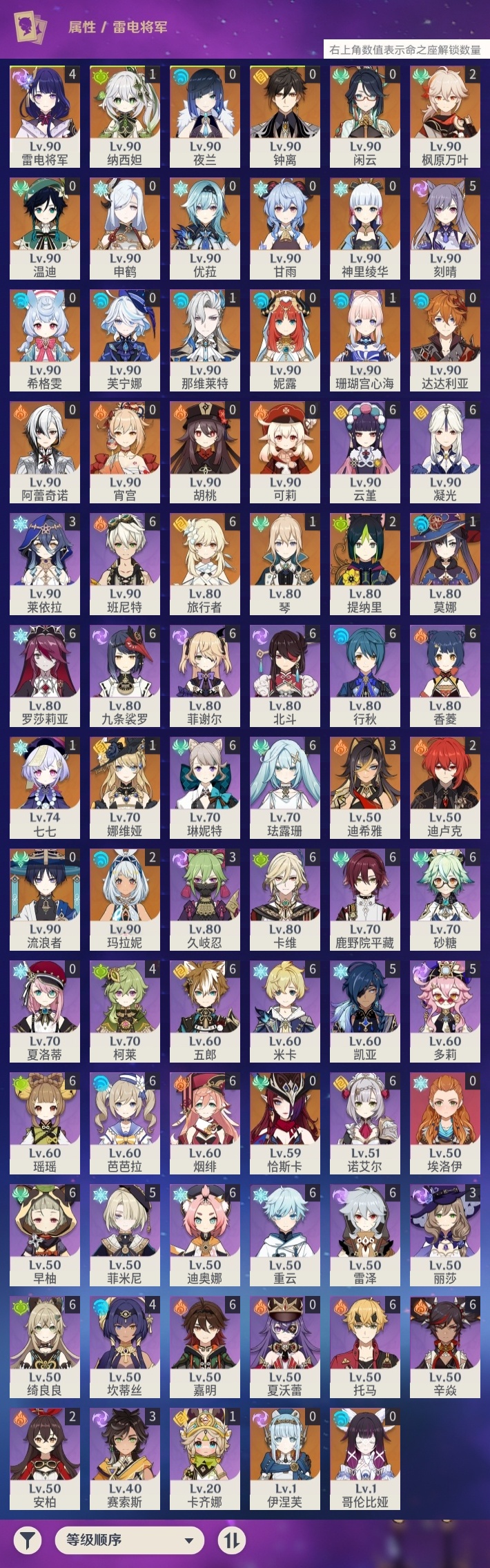 【原神】【lyys10803】冒险等级:60,五星数量:49,五星角色:刻晴 5命雷电将军 4命迪希雅 3命玛拉妮 2命迪卢克 2命枫原万叶 2命提纳里 2命那维莱特 1命娜维娅 1命莫娜 1命七七 1命琴 1命珊瑚宫心海 1命纳西妲 1命神里绫华温迪恰斯卡宵宫优菈钟离达达利亚申鹤夜兰芙宁娜闲云阿蕾奇诺妮露伊涅芙流浪者哥伦比娅甘雨胡桃希格雯可莉__五星武器:和璞鸢 2精赤月之形不灭月华风鹰剑护摩之杖狼的末路四风原典天空之刃天空之翼薙草之稻光冬极白星息灾若水圣显之钥__四星角色:班尼特 6命行秋 6命九条裟罗 6命香菱 6命鹿野院平藏 6命珐露珊 6命凝光 6命迪奥娜 6命砂糖 6命绮良良 6命瑶瑶 6命米卡 6命卡维 6命芭芭拉 6命云堇 6命早柚 6命托马 6命五郎 6命烟绯 6命重云 6命辛焱 6命诺艾尔 6命罗莎莉亚 6命雷泽 6命菲谢尔 6命北斗 6命琳妮特 6命嘉明 6命多莉 5命菲米尼 5命坎蒂丝 4命柯莱 4命久岐忍 3命莱依拉 3命赛索斯 3命卡齐娜 1命埃洛伊夏洛蒂夏沃蕾