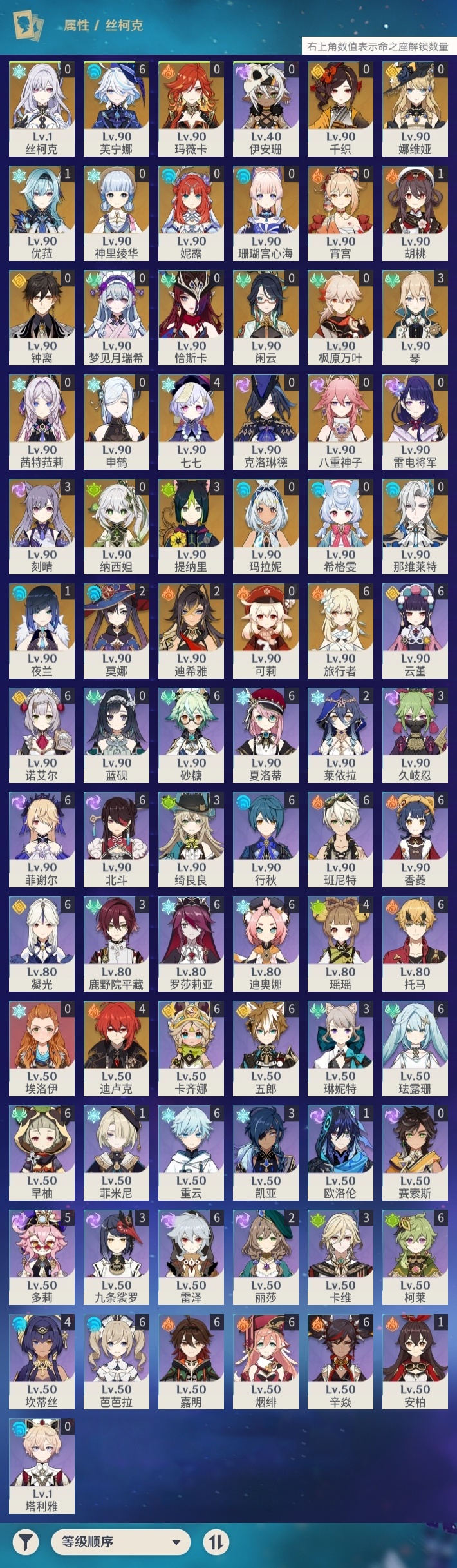 【原神】【lyys10809】冒险等级:60,五星数量:57,五星角色:芙宁娜 6命迪卢克 4命七七 4命刻晴 3命琴 3命提纳里 3命迪希雅 2命莫娜 2命胡桃 1命优菈 1命夜兰 1命玛拉妮珊瑚宫心海神里绫华恰斯卡玛薇卡茜特菈莉宵宫钟离梦见月瑞希申鹤八重神子那维莱特娜维娅闲云千织丝柯克妮露纳西妲枫原万叶克洛琳德希格雯可莉雷电将军__五星武器:碧落之珑祭星者之望焚曜千阳寝正月初晴万世流涌大典静水流涌之辉苍耀飞雷之弦振风鹰剑和璞鸢护摩之杖狼的末路磐岩结绿天空之卷天空之刃天空之翼无工之剑雾切之回光薙草之稻光若水圣显之钥千夜浮梦__四星角色:卡齐娜 6命班尼特 6命行秋 6命香菱 6命珐露珊 6命凝光 6命迪奥娜 6命砂糖 6命柯莱 6命芭芭拉 6命云堇 6命早柚 6命托马 6命五郎 6命烟绯 6命重云 6命辛焱 6命诺艾尔 6命罗莎莉亚 6命雷泽 6命菲谢尔 6命北斗 6命夏洛蒂 6命嘉明 6命多莉 5命瑶瑶 4命坎蒂丝 4命九条裟罗 3命久岐忍 3命鹿野院平藏 3命绮良良 3命卡维 3命琳妮特 3命莱依拉 2命欧洛伦 1命菲米尼 1命埃洛伊蓝砚伊安珊塔利雅赛索斯