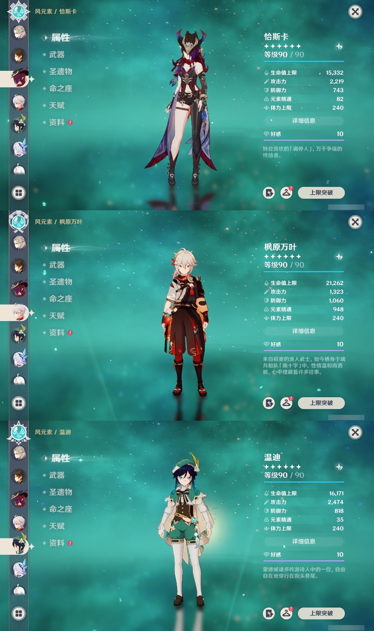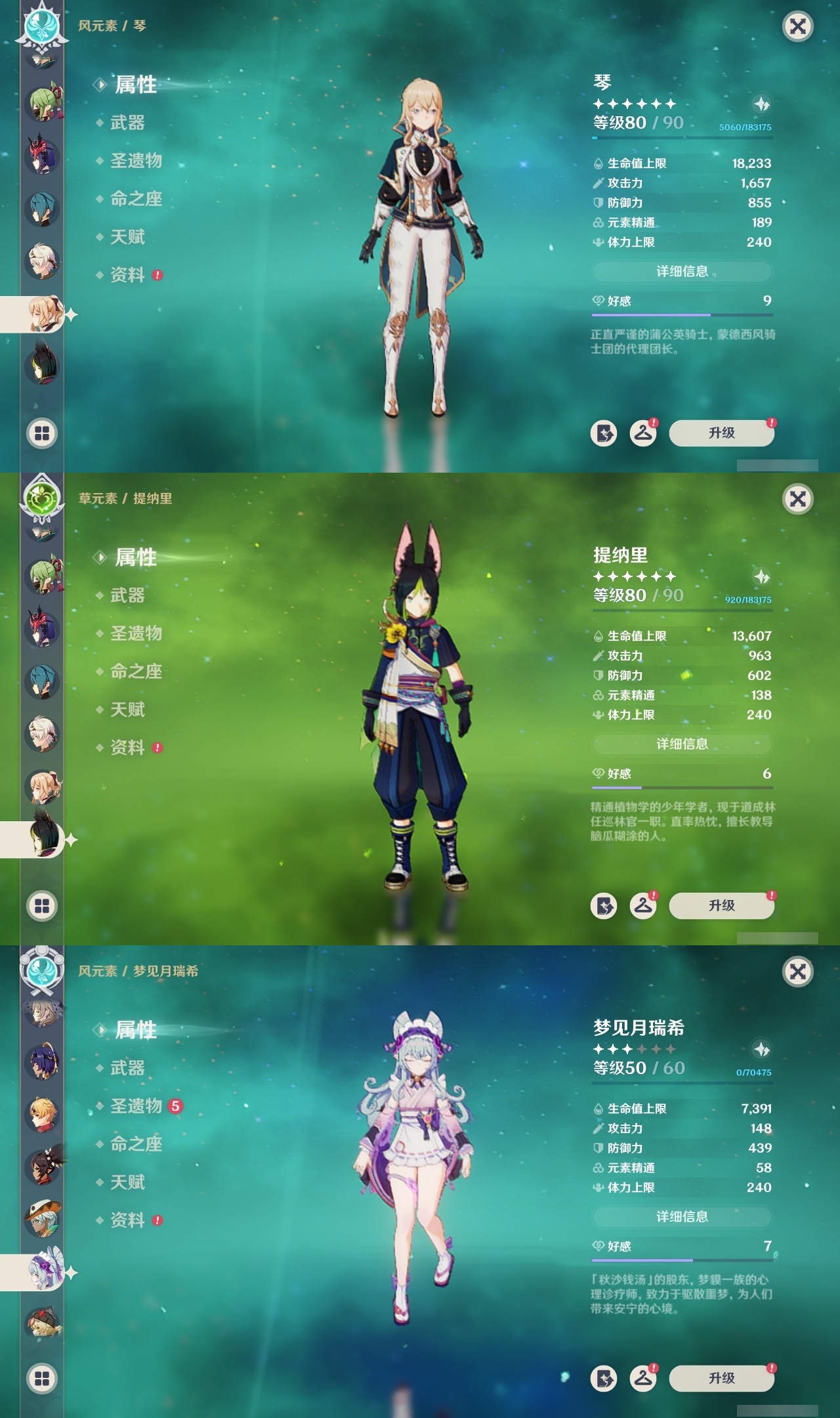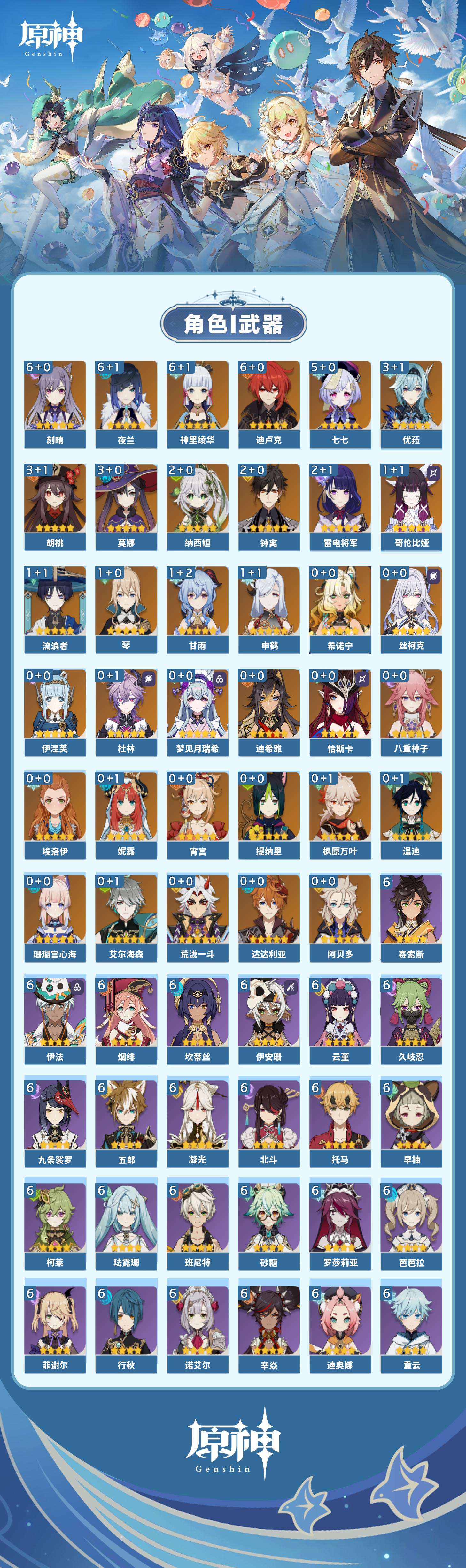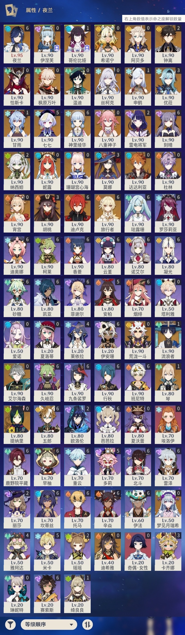 【原神】满命,冒险等级:60,五星数量:58,五星角色:迪卢克 6命刻晴 6命神里绫华 6命夜兰 6命七七 5命胡桃 3命莫娜 3命优菈 3命雷电将军 2命钟离 2命纳西妲 2命哥伦比娅 1命甘雨 1命琴 1命申鹤 1命流浪者 1命珊瑚宫心海希诺宁温迪恰斯卡宵宫迪希雅荒泷一斗达达利亚梦见月瑞希八重神子阿贝多提纳里丝柯克妮露伊涅芙艾尔海森杜林枫原万叶__五星武器:风鹰剑 3精阿莫斯之弓 2精黑蚀裁叶萃光图莱杜拉的回忆帷间夜曲苍古自由之誓和璞鸢护摩之杖四风原典松籁响起之时天空之傲天空之脊天空之卷天空之刃天空之翼雾切之回光薙草之稻光终末嗟叹之诗息灾若水圣显之钥__四星角色:班尼特 6命行秋 6命九条裟罗 6命香菱 6命久岐忍 6命鹿野院平藏 6命珐露珊 6命凝光 6命迪奥娜 6命砂糖 6命坎蒂丝 6命柯莱 6命芭芭拉 6命云堇 6命早柚 6命托马 6命五郎 6命烟绯 6命重云 6命辛焱 6命诺艾尔 6命罗莎莉亚 6命雷泽 6命菲谢尔 6命北斗 6命伊法 6命伊安珊 6命赛索斯 6命米卡 5命多莉 5命莱依拉 4命卡齐娜 3命瑶瑶 2命欧洛伦 2命绮良良 1命埃洛伊奇偶·女性琳妮特夏洛蒂夏沃蕾塔利雅爱诺