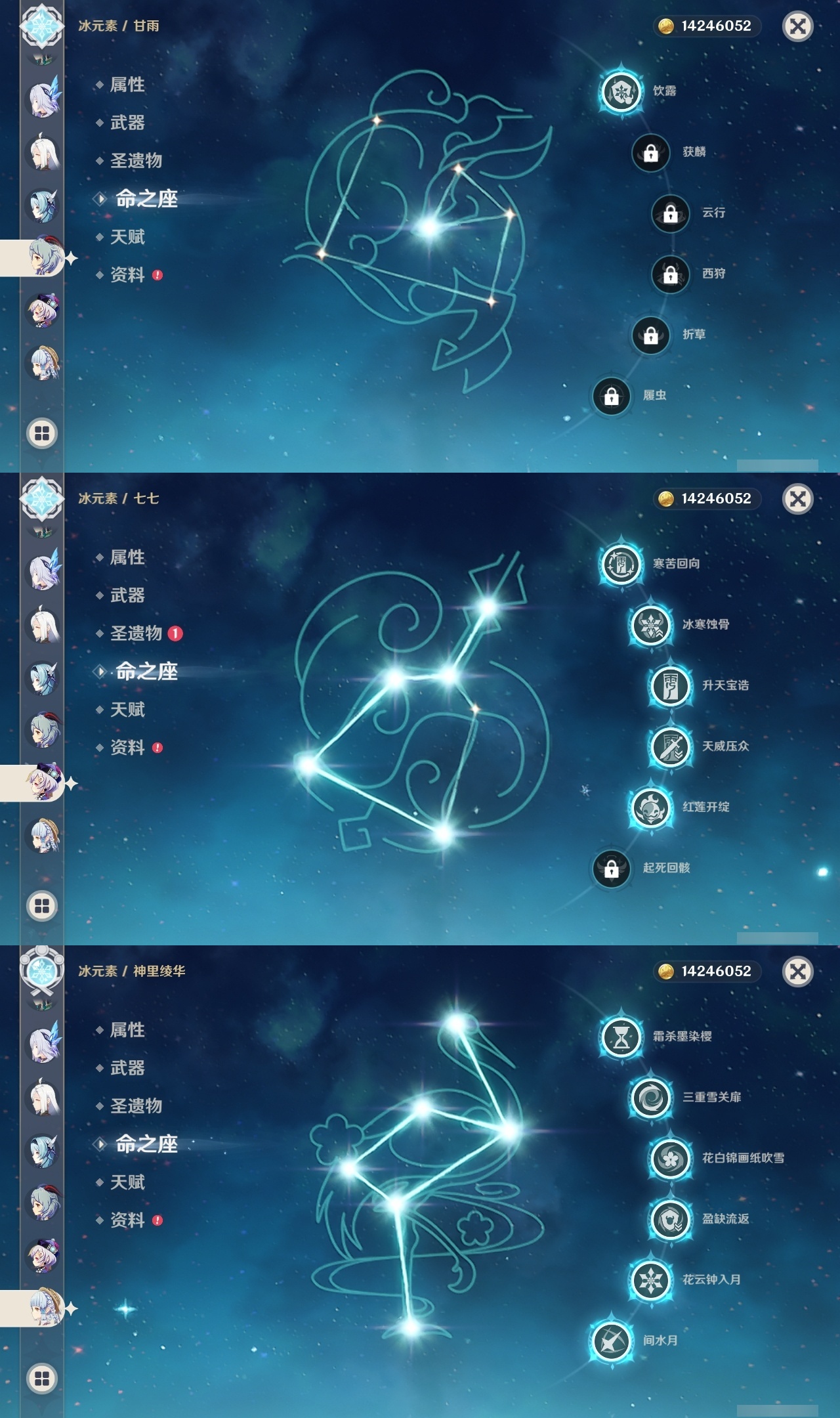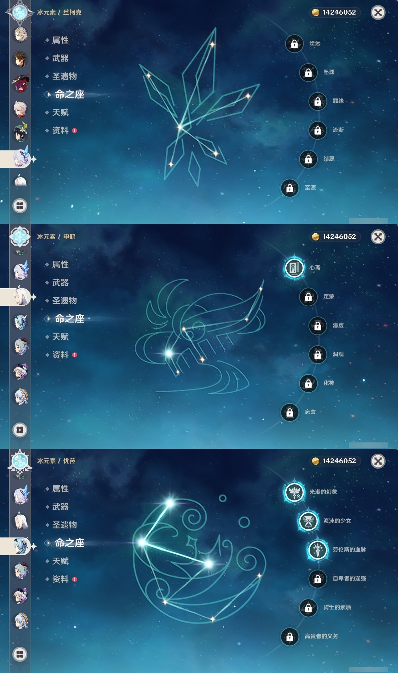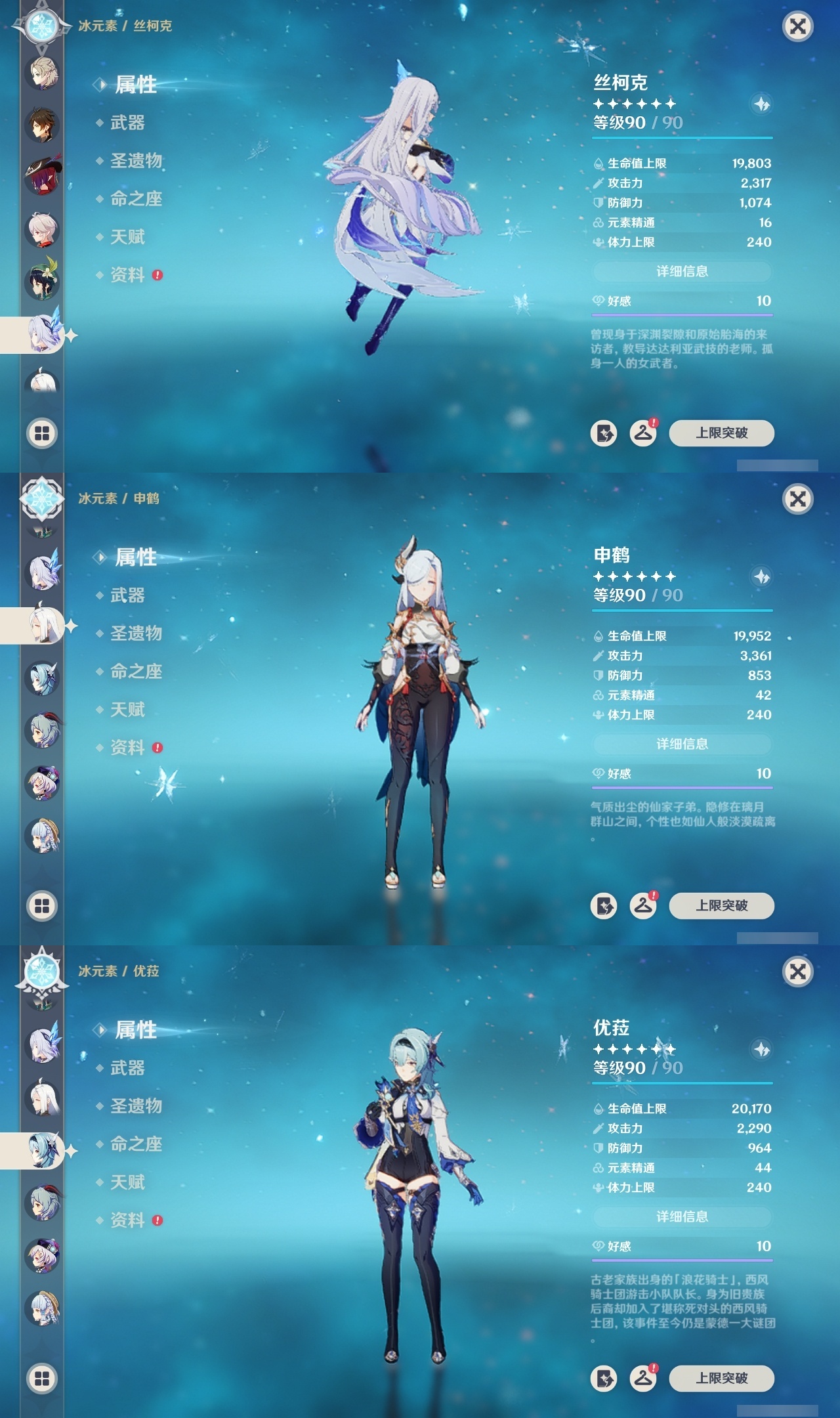 【原神】满命,冒险等级:60,五星数量:58,五星角色:迪卢克 6命刻晴 6命神里绫华 6命夜兰 6命七七 5命胡桃 3命莫娜 3命优菈 3命雷电将军 2命钟离 2命纳西妲 2命哥伦比娅 1命甘雨 1命琴 1命申鹤 1命流浪者 1命珊瑚宫心海希诺宁温迪恰斯卡宵宫迪希雅荒泷一斗达达利亚梦见月瑞希八重神子阿贝多提纳里丝柯克妮露伊涅芙艾尔海森杜林枫原万叶__五星武器:风鹰剑 3精阿莫斯之弓 2精黑蚀裁叶萃光图莱杜拉的回忆帷间夜曲苍古自由之誓和璞鸢护摩之杖四风原典松籁响起之时天空之傲天空之脊天空之卷天空之刃天空之翼雾切之回光薙草之稻光终末嗟叹之诗息灾若水圣显之钥__四星角色:班尼特 6命行秋 6命九条裟罗 6命香菱 6命久岐忍 6命鹿野院平藏 6命珐露珊 6命凝光 6命迪奥娜 6命砂糖 6命坎蒂丝 6命柯莱 6命芭芭拉 6命云堇 6命早柚 6命托马 6命五郎 6命烟绯 6命重云 6命辛焱 6命诺艾尔 6命罗莎莉亚 6命雷泽 6命菲谢尔 6命北斗 6命伊法 6命伊安珊 6命赛索斯 6命米卡 5命多莉 5命莱依拉 4命卡齐娜 3命瑶瑶 2命欧洛伦 2命绮良良 1命埃洛伊奇偶·女性琳妮特夏洛蒂夏沃蕾塔利雅爱诺