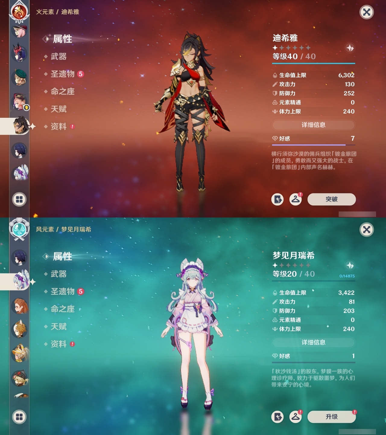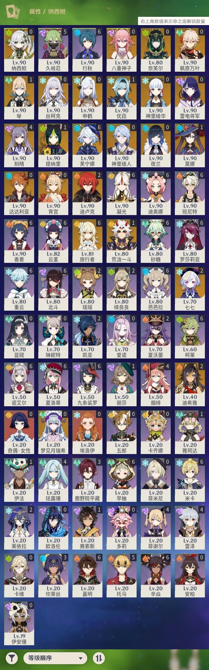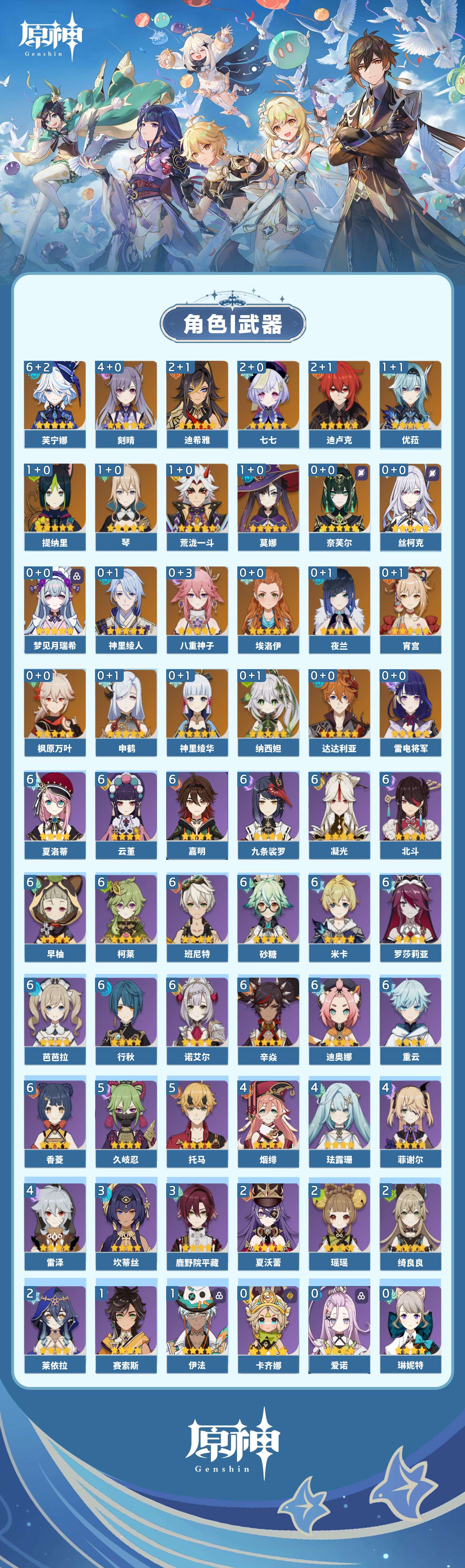 【原神】【lyys10830】冒险等级:60,五星数量:44,五星角色:芙宁娜 6命刻晴 4命迪希雅 2命迪卢克 2命七七 2命莫娜 1命琴 1命优菈 1命荒泷一斗 1命提纳里 1命神里绫华宵宫达达利亚梦见月瑞希申鹤八重神子神里绫人夜兰丝柯克纳西妲奈芙尔枫原万叶雷电将军__五星武器:神乐之真意 3精静水流涌之辉 2精苇海信标最初的大魔术阿莫斯之弓不灭月华尘世之锁飞雷之弦振风鹰剑狼的末路松籁响起之时天空之脊无工之剑雾切之回光终末嗟叹之诗息灾波乱月白经津若水千夜浮梦__四星角色:班尼特 6命行秋 6命九条裟罗 6命香菱 6命凝光 6命迪奥娜 6命砂糖 6命米卡 6命柯莱 6命芭芭拉 6命云堇 6命早柚 6命重云 6命辛焱 6命诺艾尔 6命罗莎莉亚 6命北斗 6命夏洛蒂 6命嘉明 6命久岐忍 5命托马 5命珐露珊 4命烟绯 4命雷泽 4命菲谢尔 4命鹿野院平藏 3命坎蒂丝 3命绮良良 2命瑶瑶 2命莱依拉 2命夏沃蕾 2命伊法 1命赛索斯 1命埃洛伊奇偶·女性卡齐娜多莉卡维欧洛伦蓝砚五郎菲米尼琳妮特伊安珊爱诺
