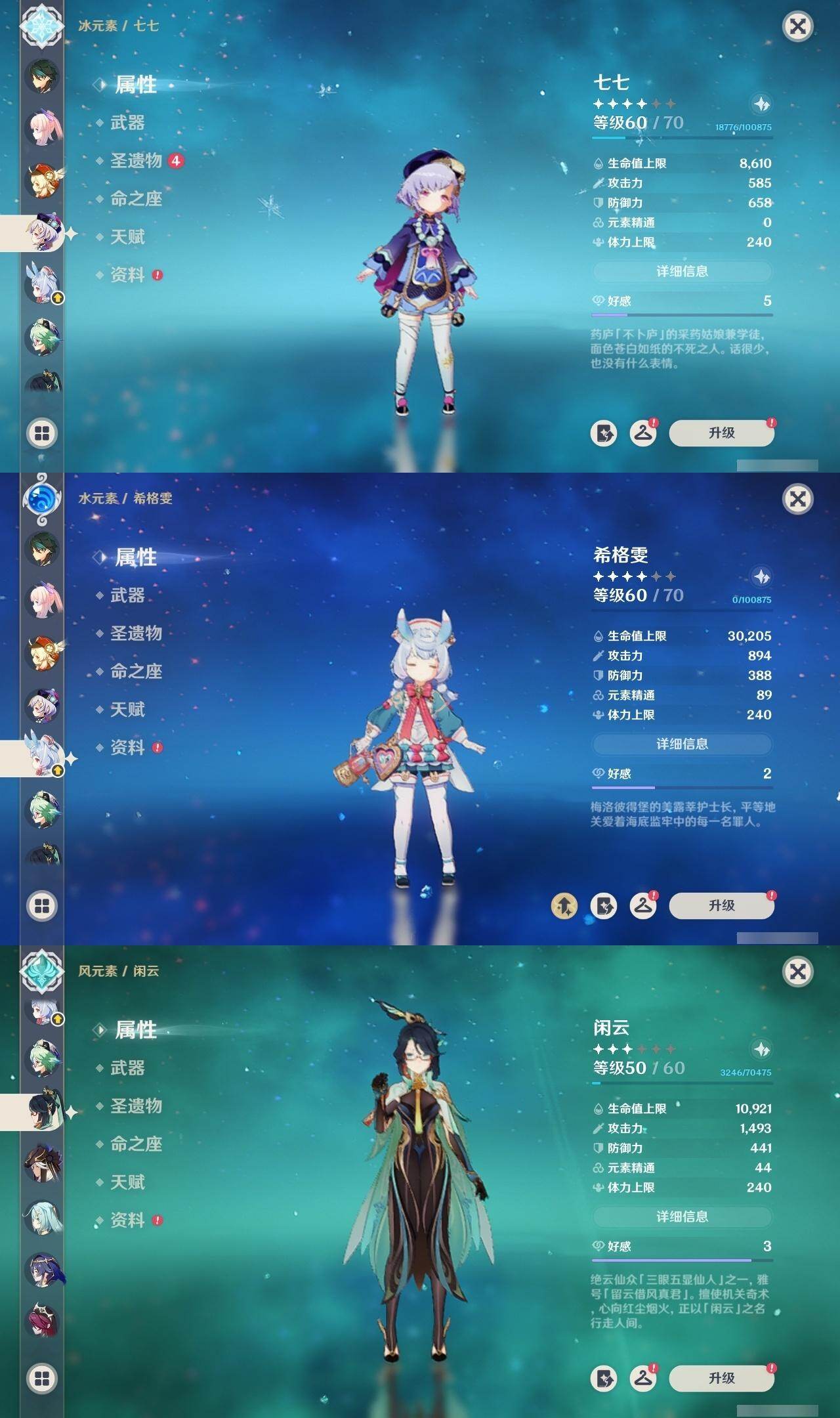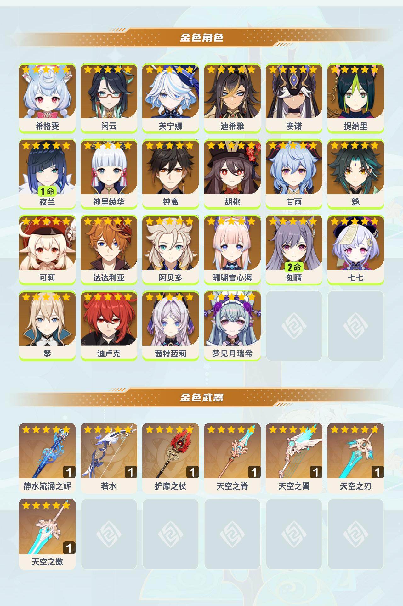 56级/32黄/女主/22个五星角色/7个五星武器 0命希格雯0命闲云0命芙宁娜0命迪希雅0命赛诺0命提纳里1命夜兰0命神里绫华0命钟离0命胡桃0命甘雨0命魈0命可莉0命达达利亚0命阿贝多0命珊瑚宫心海2命刻晴0命七七0命琴0命迪卢克0命茜特菈莉0命梦见月瑞希精1静水流涌之辉精1若水精1护摩之杖精1天空之脊精1天空之翼精1天空之刃精1天空之傲