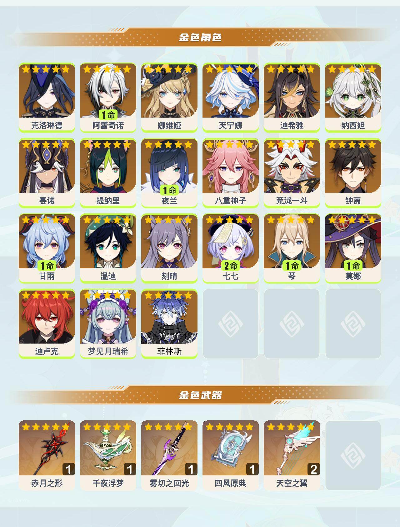 【ysx1542】58级/34黄/女主/21个五星角色/5个五星武器/0命菲林斯/0命八重神子/0命钟离/0命娜维娅/0命荒泷一斗/1命甘雨/0命克洛琳德/0命赛诺/0命纳西妲/0命芙宁娜/1命夜兰/1命阿蕾奇诺/0命迪卢克/0命温迪/1命莫娜/0命梦见月瑞希/0命刻晴/0命迪希雅/1命琴/2命七七/0命提纳里/精2天空之翼/精1千夜浮梦/精1四风原典/精1赤月之形/精1雾切之回光