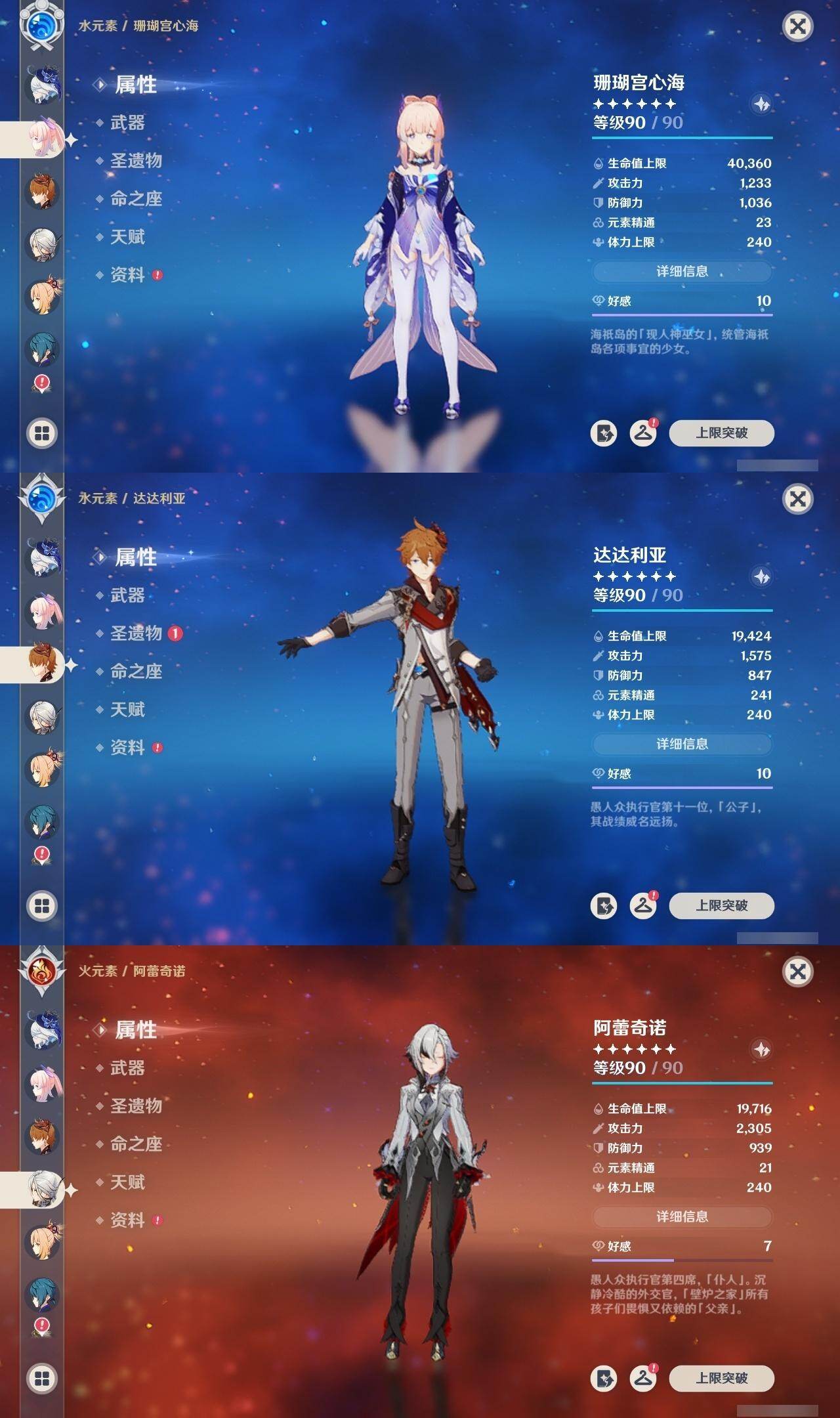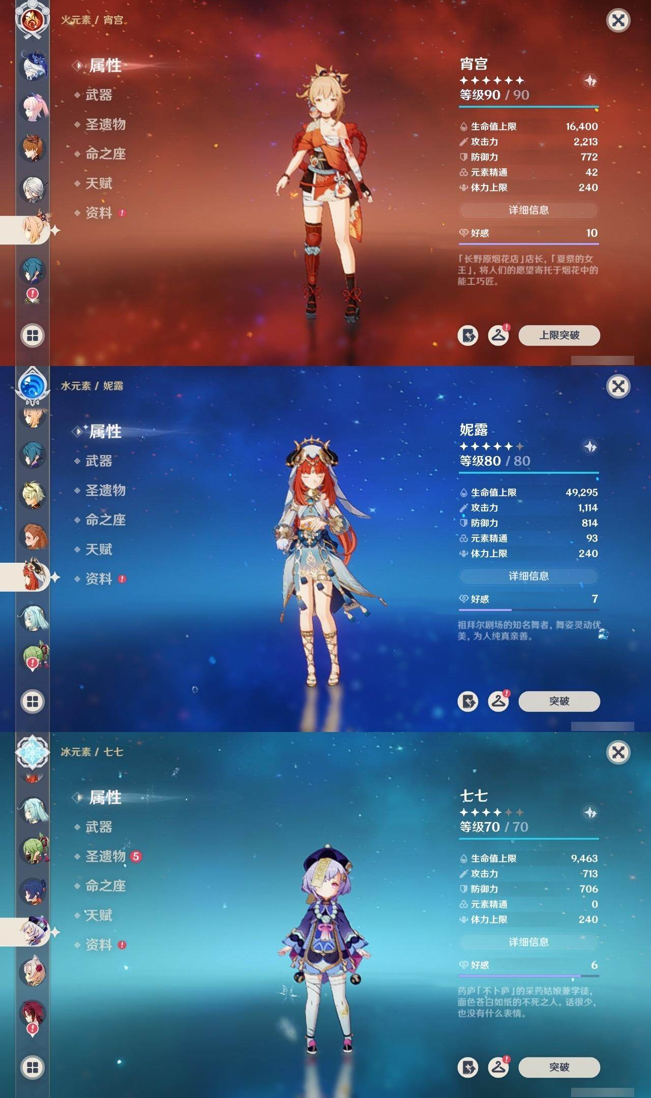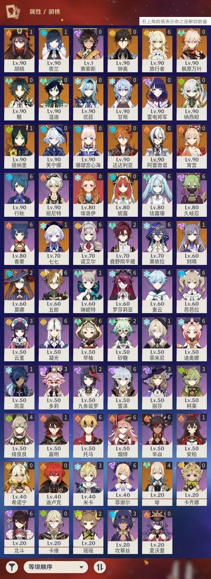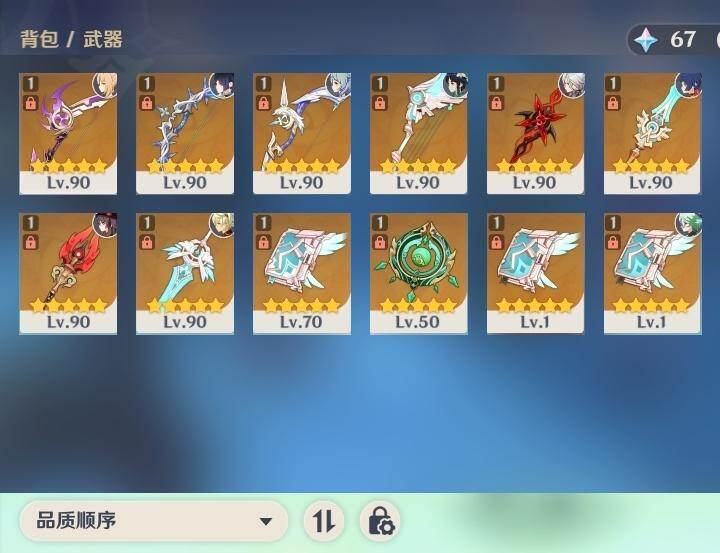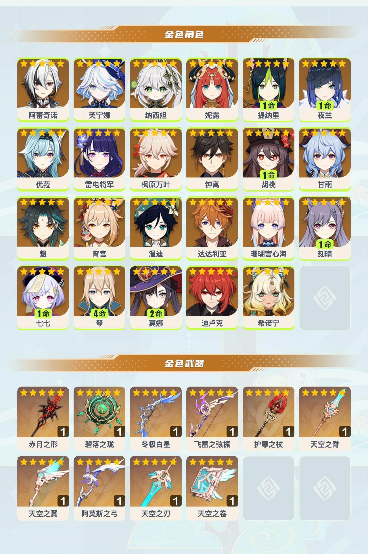 60级/46黄/女主/23个五星角色/12个五星武器 0命阿蕾奇诺0命芙宁娜0命纳西妲0命妮露1命提纳里1命夜兰0命优菈0命雷电将军0命枫原万叶0命钟离1命胡桃0命甘雨0命魈0命宵宫0命温迪0命达达利亚0命珊瑚宫心海1命刻晴1命七七4命琴2命莫娜0命迪卢克0命希诺宁精1赤月之形精1碧落之珑精1冬极白星精1飞雷之弦振精1护摩之杖精1天空之脊精1天空之翼精1阿莫斯之弓精1天空之刃精1天空之卷