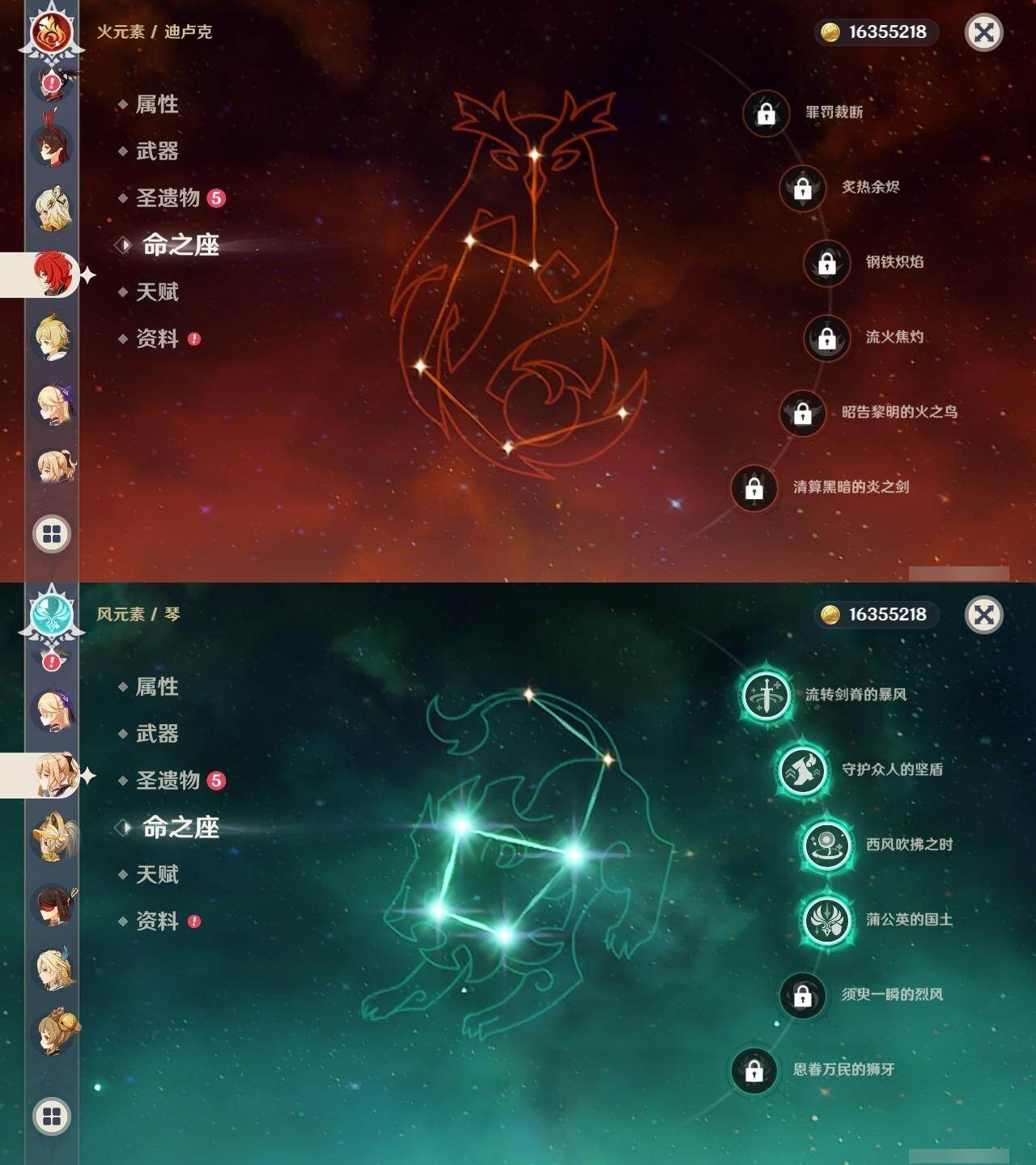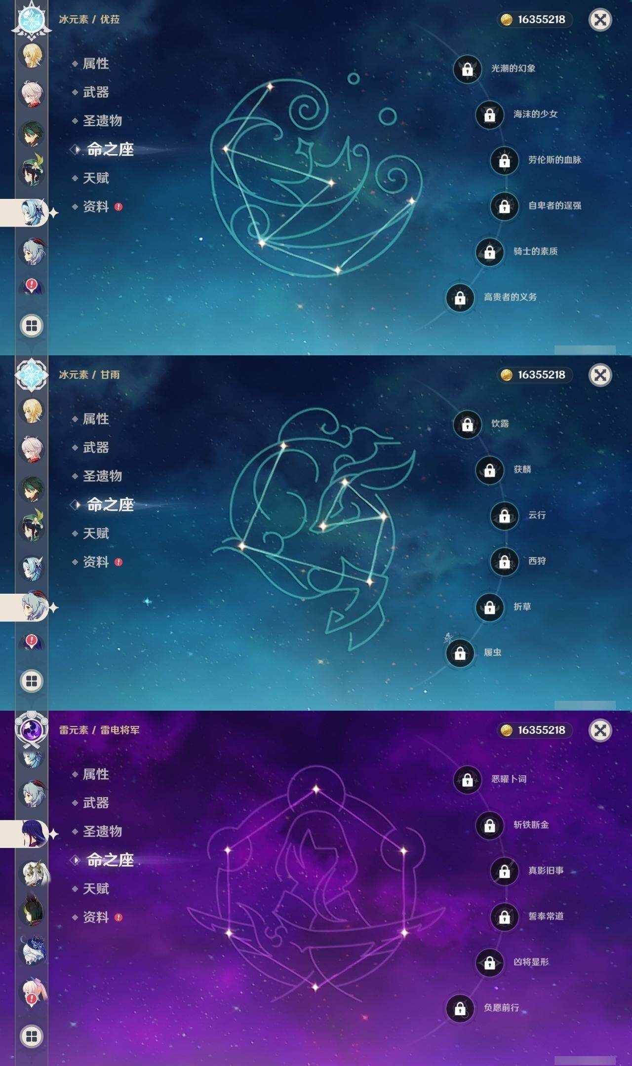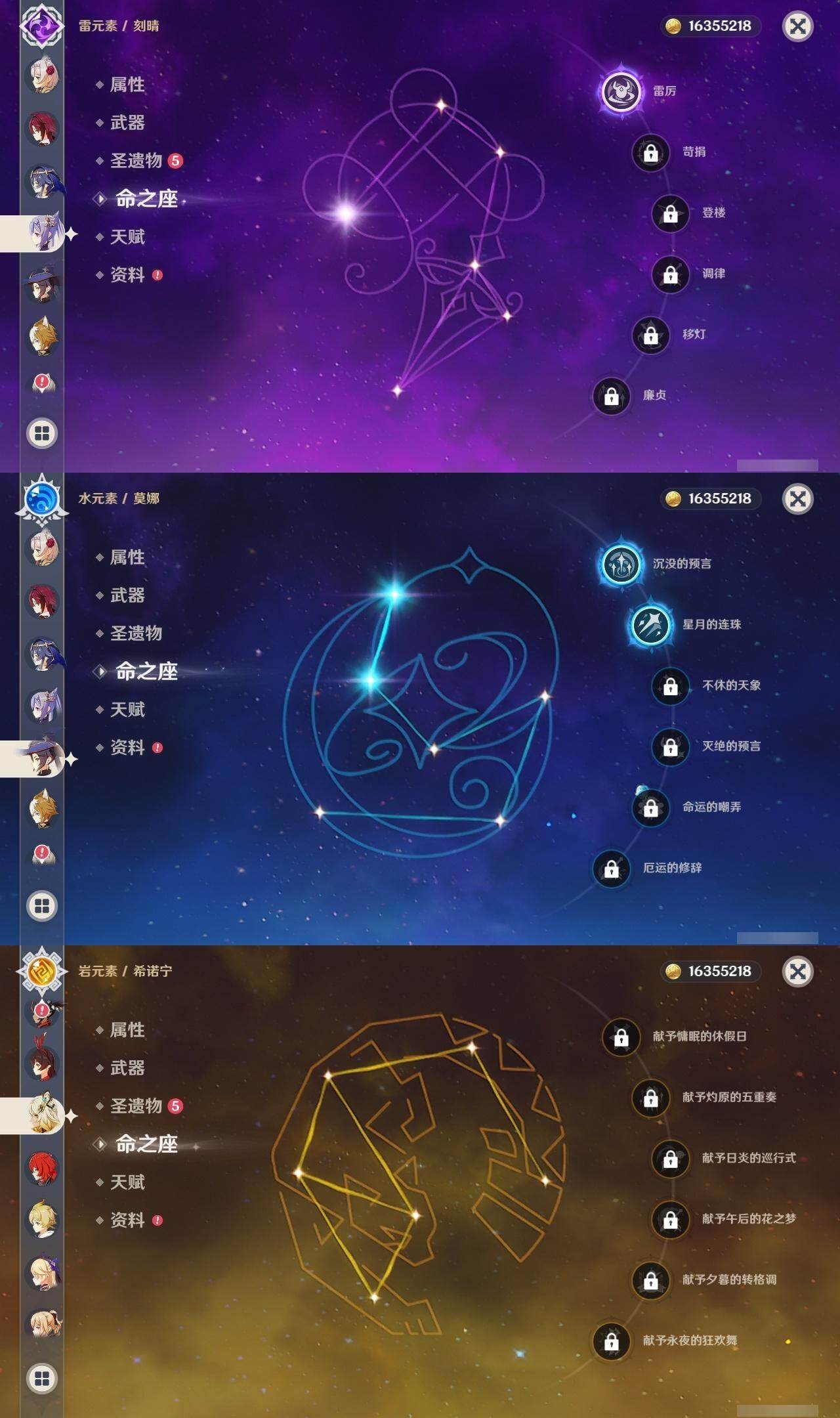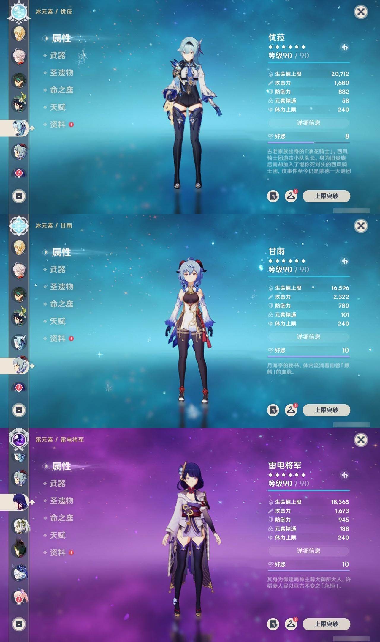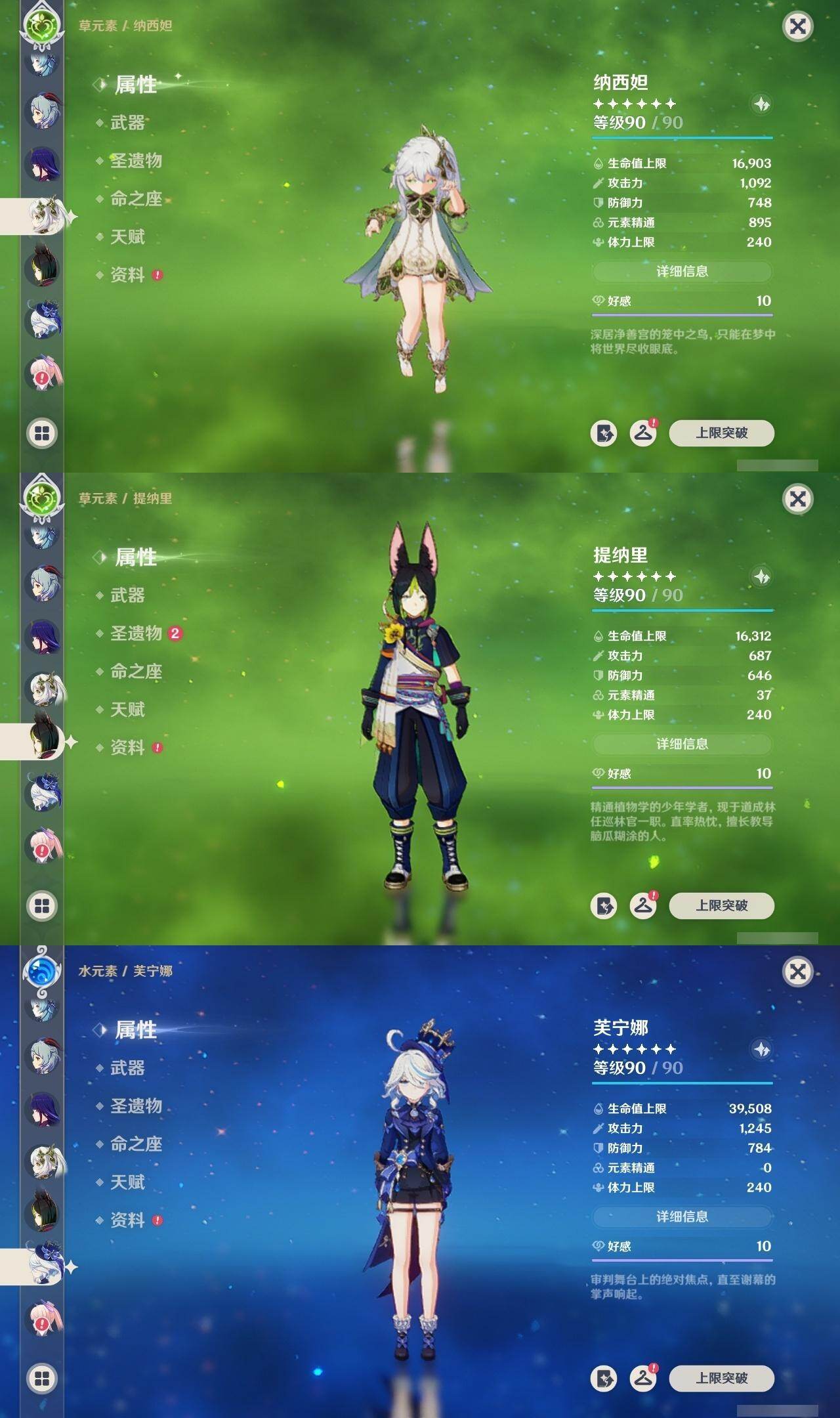 60级/46黄/女主/23个五星角色/12个五星武器 0命阿蕾奇诺0命芙宁娜0命纳西妲0命妮露1命提纳里1命夜兰0命优菈0命雷电将军0命枫原万叶0命钟离1命胡桃0命甘雨0命魈0命宵宫0命温迪0命达达利亚0命珊瑚宫心海1命刻晴1命七七4命琴2命莫娜0命迪卢克0命希诺宁精1赤月之形精1碧落之珑精1冬极白星精1飞雷之弦振精1护摩之杖精1天空之脊精1天空之翼精1阿莫斯之弓精1天空之刃精1天空之卷