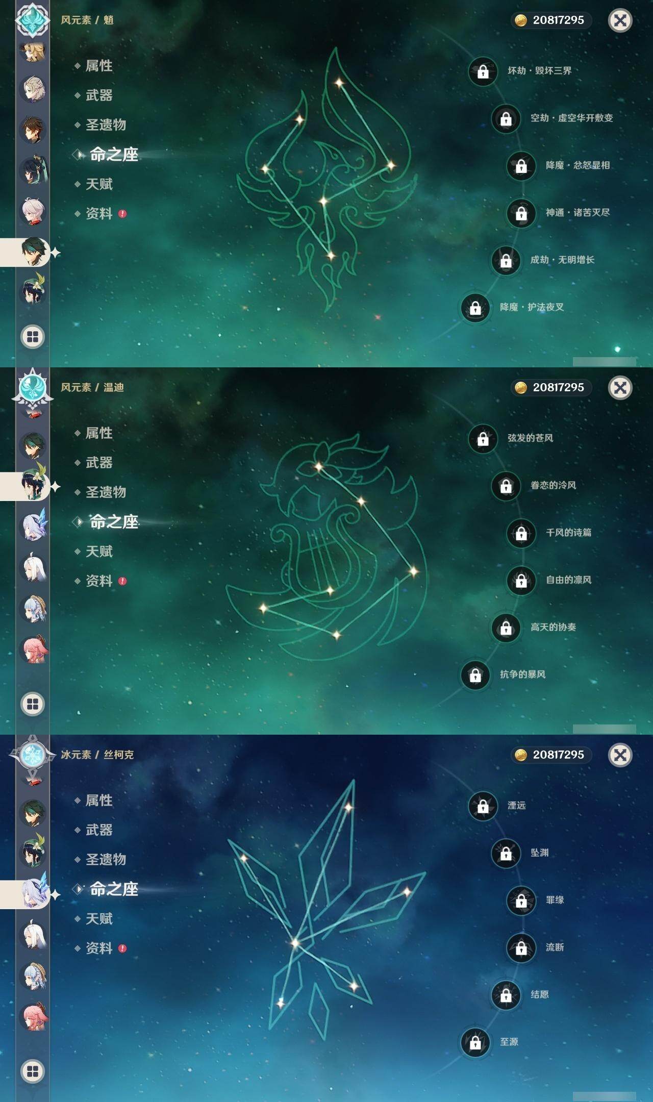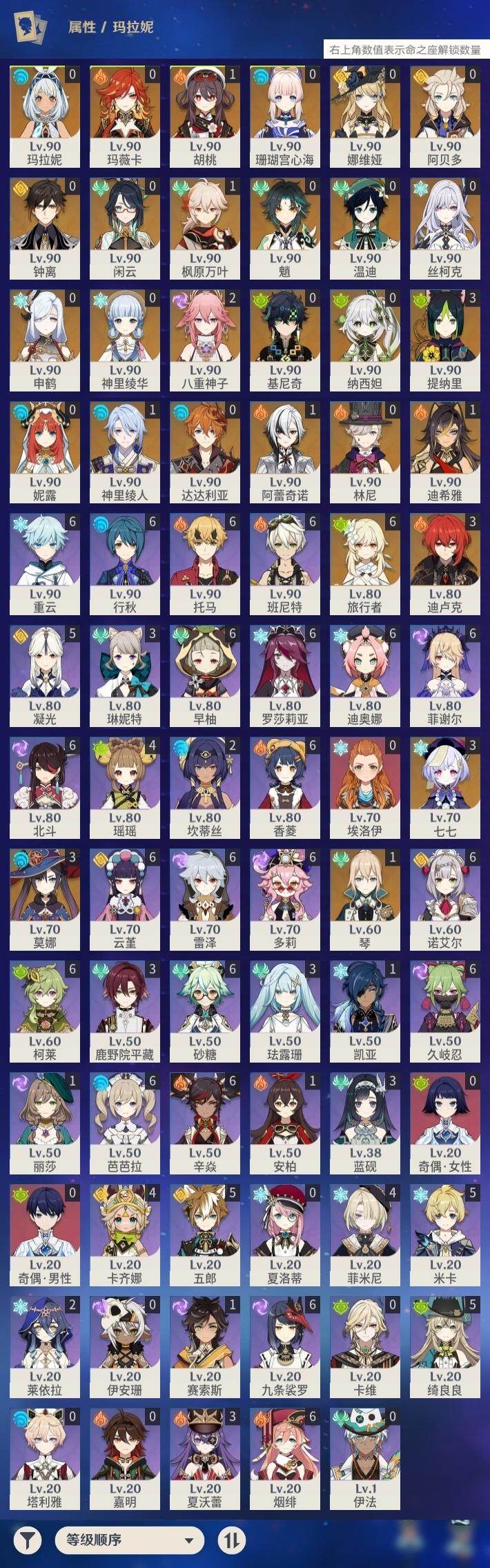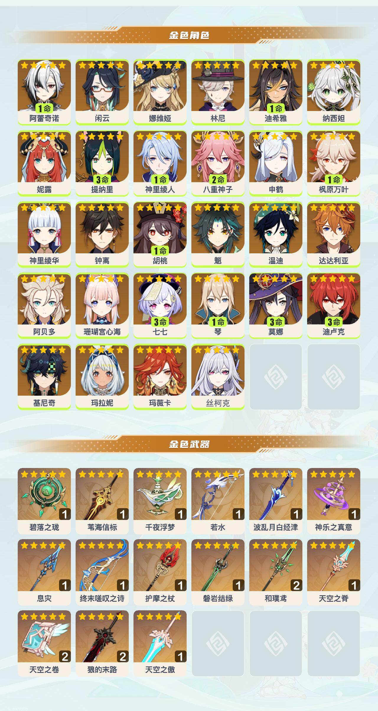 60级/69黄/女主/28个五星角色/18个五星武器 1命阿蕾奇诺0命闲云0命娜维娅0命林尼1命迪希雅0命纳西妲0命妮露3命提纳里1命神里绫人2命八重神子0命申鹤1命枫原万叶0命神里绫华0命钟离1命胡桃0命魈0命温迪0命达达利亚0命阿贝多0命珊瑚宫心海3命七七1命琴3命莫娜3命迪卢克0命基尼奇0命玛拉妮0命玛薇卡0命丝柯克精1碧落之珑精1苇海信标精1千夜浮梦精1若水精1波乱月白经津精1神乐之真意精1息灾精1终末嗟叹之诗精1护摩之杖精1磐岩结绿精2和璞鸢精1天空之脊精2天空之卷精2狼的末路精1天空之傲