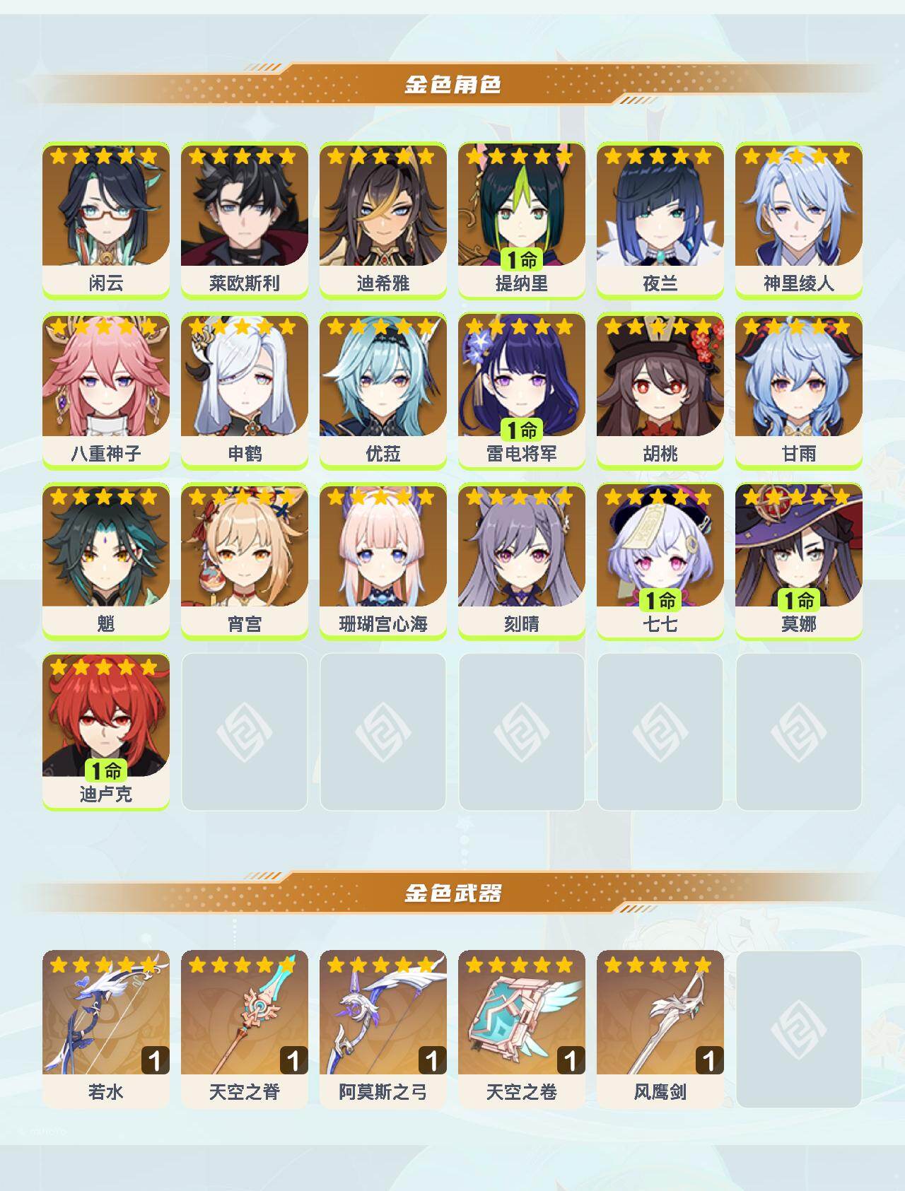 59级/29黄/女主/19个五星角色/5个五星武器 0命闲云0命莱欧斯利0命迪希雅1命提纳里0命夜兰0命神里绫人0命八重神子0命申鹤0命优菈1命雷电将军0命胡桃0命甘雨0命魈0命宵宫0命珊瑚宫心海0命刻晴1命七七1命莫娜1命迪卢克精1若水精1天空之脊精1阿莫斯之弓精1天空之卷精1风鹰剑