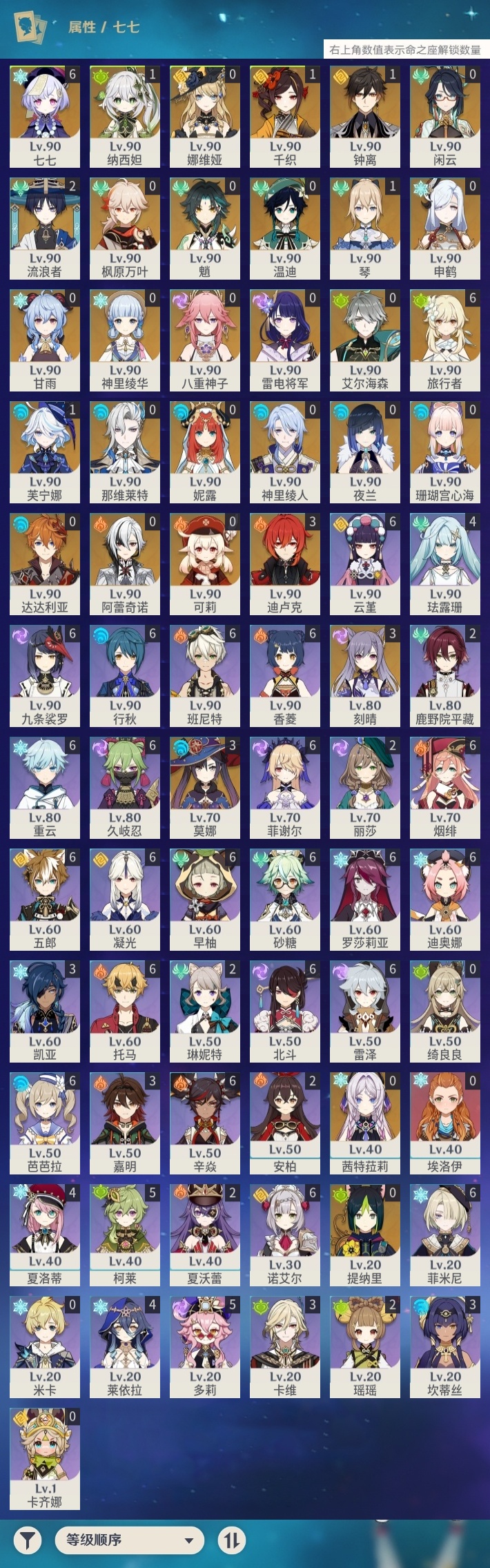 【原神】【lyys10872】冒险等级:60,五星数量:49,五星角色:七七 6命迪卢克 3命刻晴 3命莫娜 3命流浪者 2命芙宁娜 1命千织 1命琴 1命钟离 1命纳西妲 1命珊瑚宫心海神里绫华温迪茜特菈莉达达利亚申鹤八重神子神里绫人那维莱特夜兰娜维娅提纳里闲云阿蕾奇诺妮露艾尔海森枫原万叶甘雨魈可莉雷电将军__五星武器:裁断 2精千夜浮梦 2精裁叶萃光 2精阿莫斯之弓不灭月华和璞鸢狼的末路磐岩结绿四风原典天空之傲天空之卷天空之翼雾切之回光薙草之稻光终末嗟叹之诗神乐之真意若水__四星角色:班尼特 6命行秋 6命九条裟罗 6命香菱 6命久岐忍 6命凝光 6命迪奥娜 6命砂糖 6命芭芭拉 6命云堇 6命早柚 6命托马 6命五郎 6命烟绯 6命重云 6命辛焱 6命诺艾尔 6命罗莎莉亚 6命雷泽 6命菲谢尔 6命北斗 6命菲米尼 6命多莉 5命柯莱 5命珐露珊 4命莱依拉 4命夏洛蒂 4命坎蒂丝 3命卡维 3命嘉明 3命鹿野院平藏 2命瑶瑶 2命琳妮特 2命夏沃蕾 2命埃洛伊卡齐娜绮良良米卡