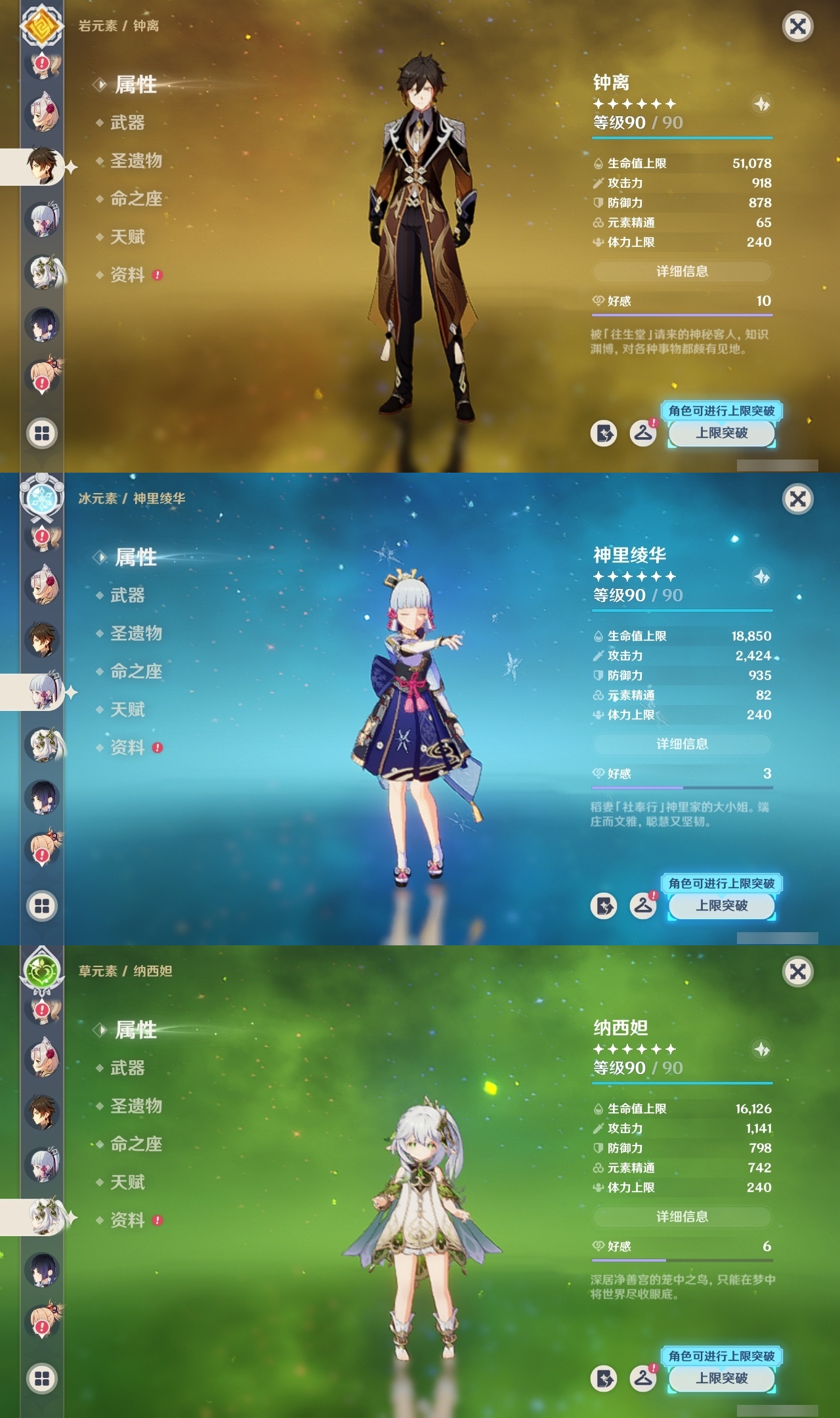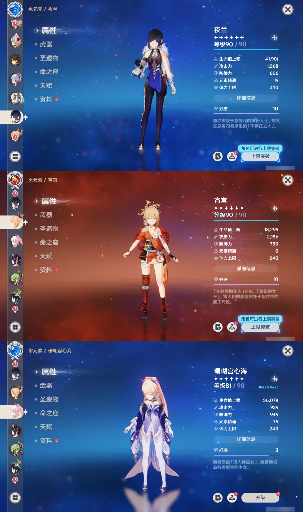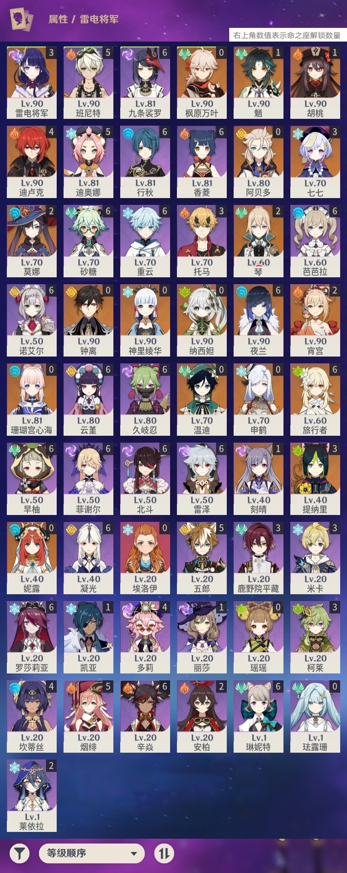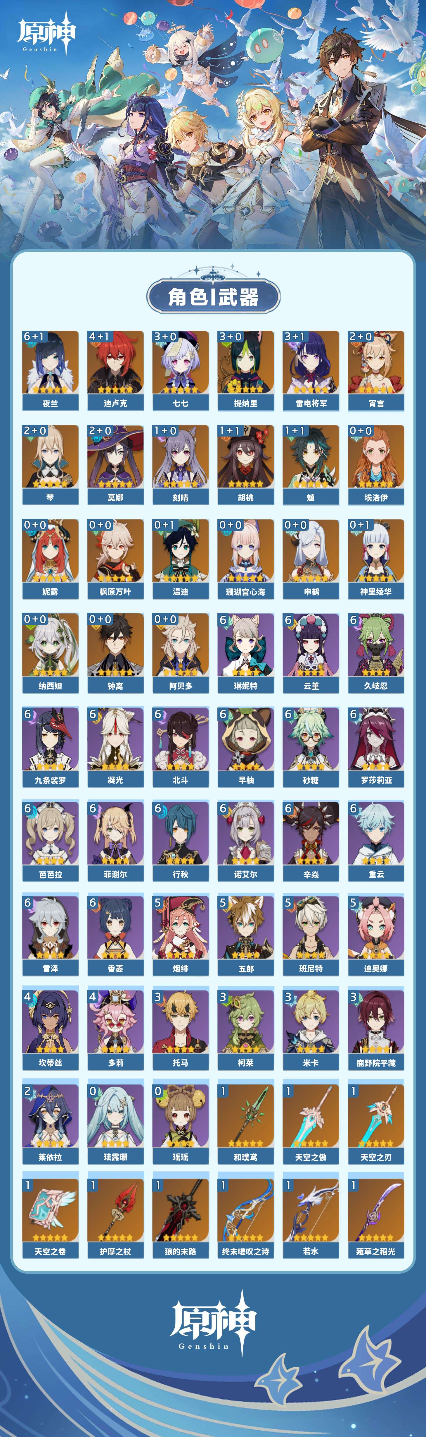 【原神】【lyys10869】冒险等级:58,五星数量:31,五星角色:夜兰 6命迪卢克 4命雷电将军 3命七七 3命提纳里 3命莫娜 2命琴 2命宵宫 2命魈 1命胡桃 1命刻晴 1命珊瑚宫心海神里绫华温迪钟离申鹤阿贝多妮露纳西妲枫原万叶__五星武器:和璞鸢护摩之杖狼的末路天空之傲天空之卷天空之刃雾切之回光薙草之稻光终末嗟叹之诗若水__四星角色:行秋 6命九条裟罗 6命香菱 6命久岐忍 6命凝光 6命砂糖 6命芭芭拉 6命云堇 6命早柚 6命重云 6命辛焱 6命诺艾尔 6命罗莎莉亚 6命雷泽 6命菲谢尔 6命北斗 6命琳妮特 6命班尼特 5命迪奥娜 5命五郎 5命烟绯 5命坎蒂丝 4命多莉 4命鹿野院平藏 3命米卡 3命柯莱 3命托马 3命莱依拉 2命埃洛伊珐露珊瑶瑶