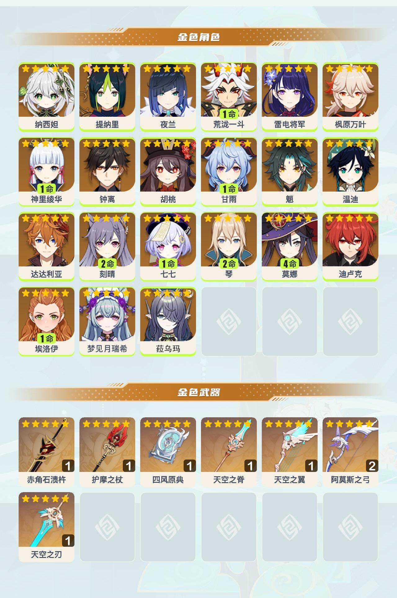 【ysyt630】59级/41黄/女主/21个五星角色/7个五星武器/0命钟离/0命枫原万叶/0命达达利亚/1命荒泷一斗/0命魈/1命甘雨/1命神里绫华/0命雷电将军/0命纳西妲/0命胡桃/0命温迪/1命七七/0命提纳里/4命莫娜/0命梦见月瑞希/0命夜兰/2命琴/2命刻晴/0命菈乌玛/0命埃洛伊/0命迪卢克/精2阿莫斯之弓/精1天空之翼/精1四风原典/精1天空之脊/精1护摩之杖/精1赤角石溃杵/精1天空之刃