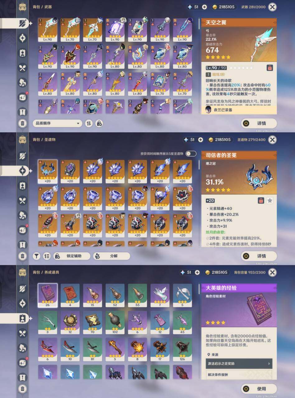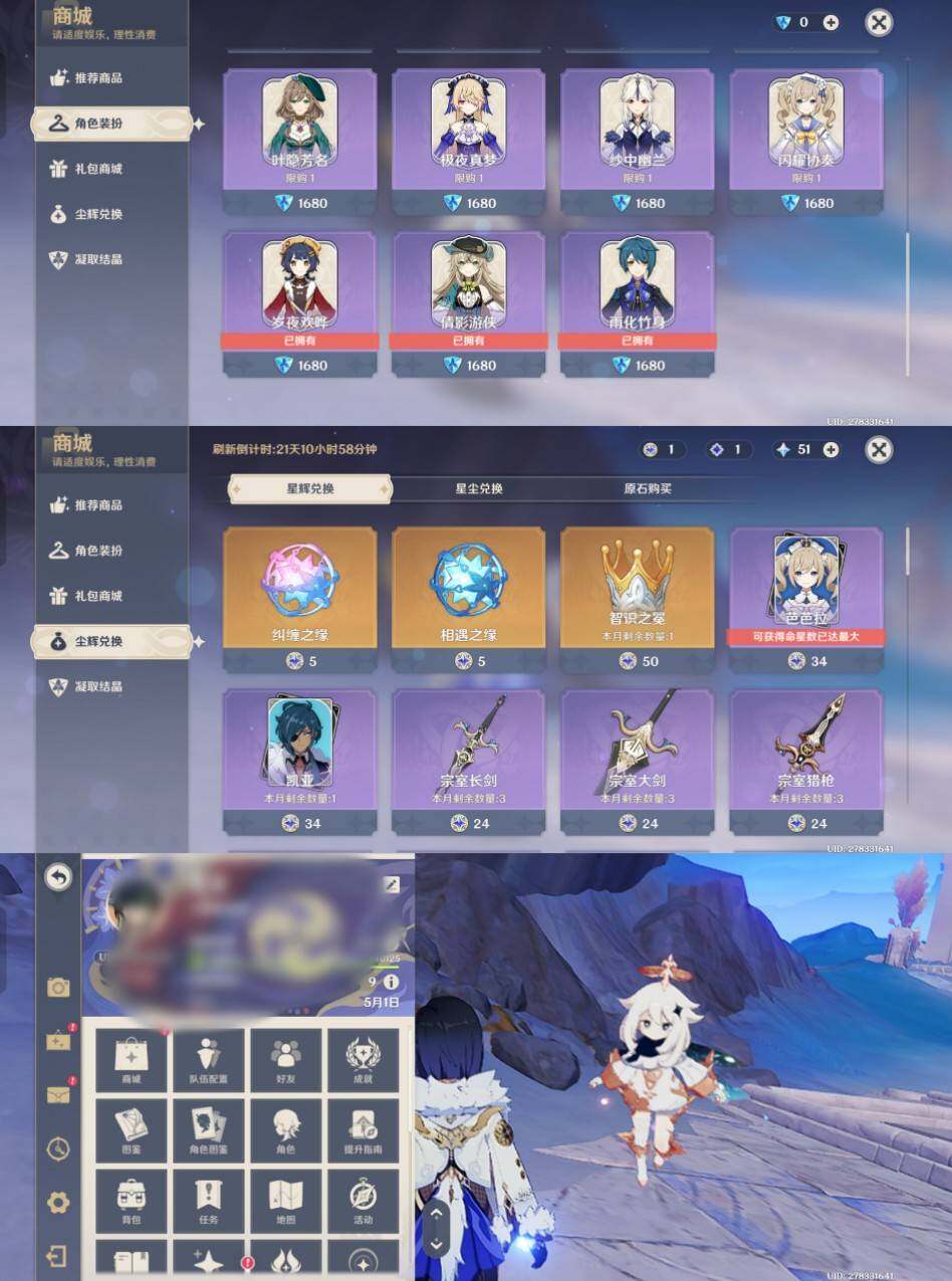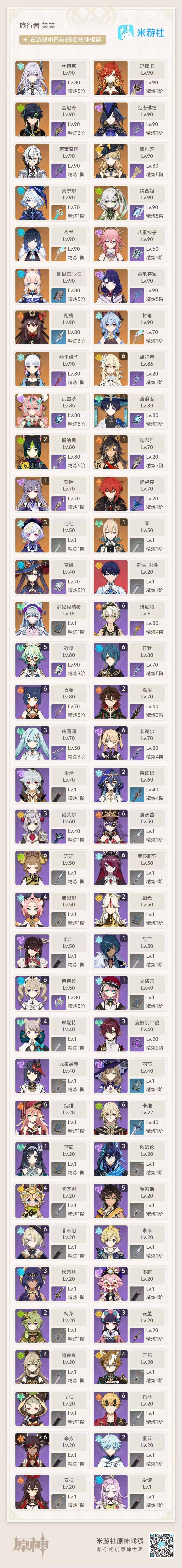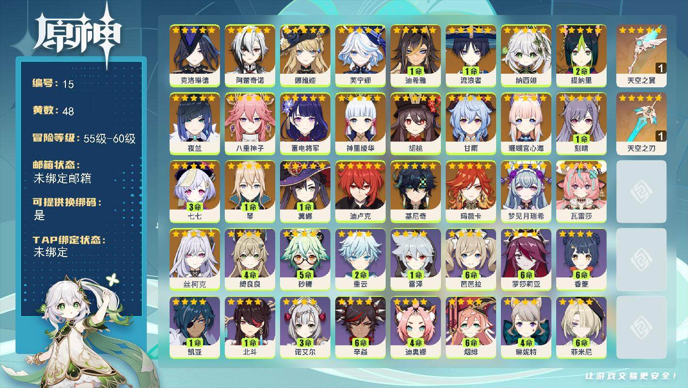 总48黄【金色角色】:丝柯克0命,瓦雷莎0命,梦见月瑞希0命,玛薇卡0命,基尼奇0命,克洛琳德0命,阿蕾奇诺0命,娜维娅0命,芙宁娜0命,迪希雅1命,流浪者1命,纳西妲0命,提纳里2命,夜兰0命,八重神子0命,珊瑚宫心海0命,雷电将军0命,神里绫华0命,胡桃0命,甘雨0命,琴1命,刻晴1命,迪卢克0命,莫娜1命,七七3命【拥有武器】:天空之刃精1,天空之翼精1,天空之翼精1【紫色角色】:爱诺0命,蓝砚1命,欧洛伦3命,卡齐娜4命,赛索斯5命,嘉明2命,夏沃蕾满命,夏洛蒂1命,菲米尼满命,琳妮特4命,绮良良4命,卡维满命,米卡0命,瑶瑶满命,珐露珊3命,莱依拉2命,坎蒂丝3命,多莉5命,柯莱2命,鹿野院平藏3命,云堇3命,五郎4命,托马满命,九条裟罗0命,早柚1命,烟绯满命,罗莎莉亚满命,辛焱满命,迪奥娜4命,砂糖5命,雷泽0命,菲谢尔满命,丽莎1命,北斗0命,香菱满命,安柏0命,班尼特满命,行秋满命,芭芭拉满命,凝光2命,诺艾尔3命,凯亚1命,重云2命【角色皮肤】:倩影游侠,雨化竹身,岁夜欢哗【风之翼】:初始之翼,守候之翼