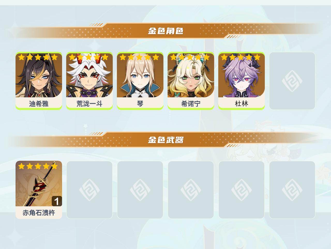 【ysx1559】48级/6黄/女主/5个五星角色/1个五星武器/0命荒泷一斗/0命杜林/0命希诺宁/0命琴/0命迪希雅/精1赤角石溃杵