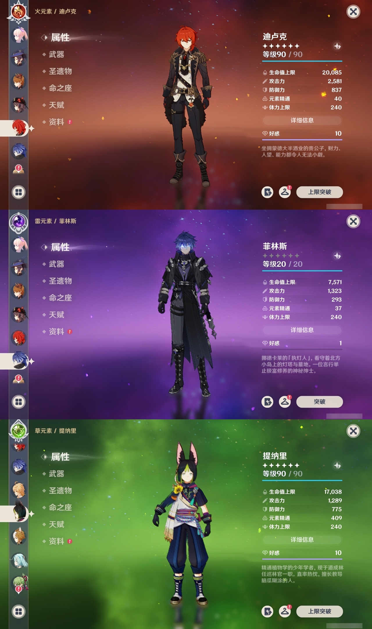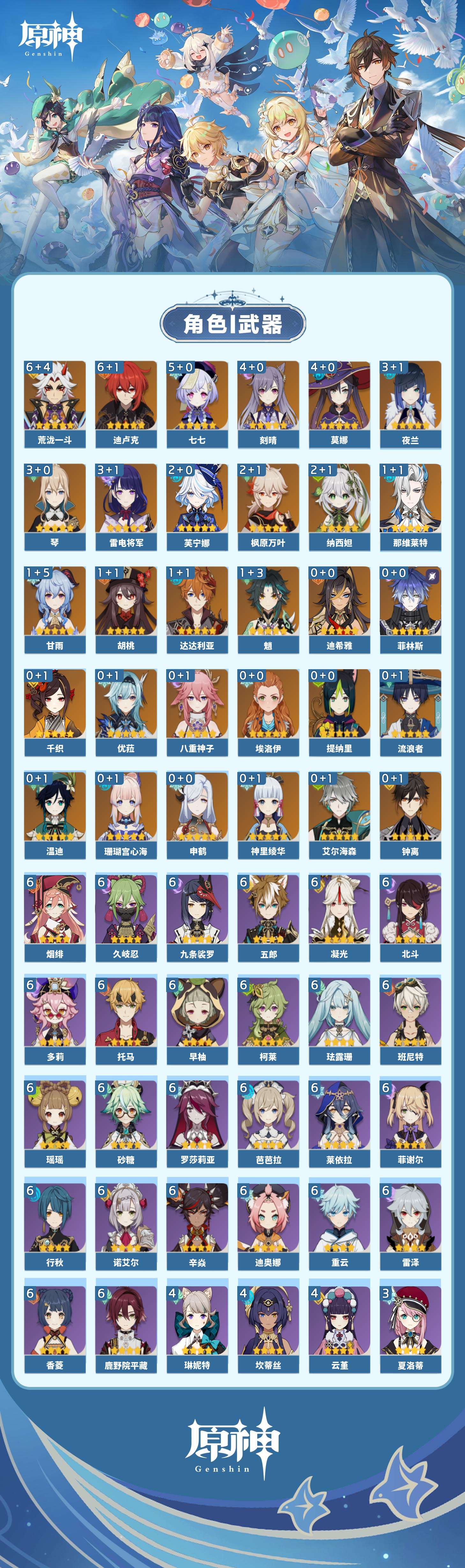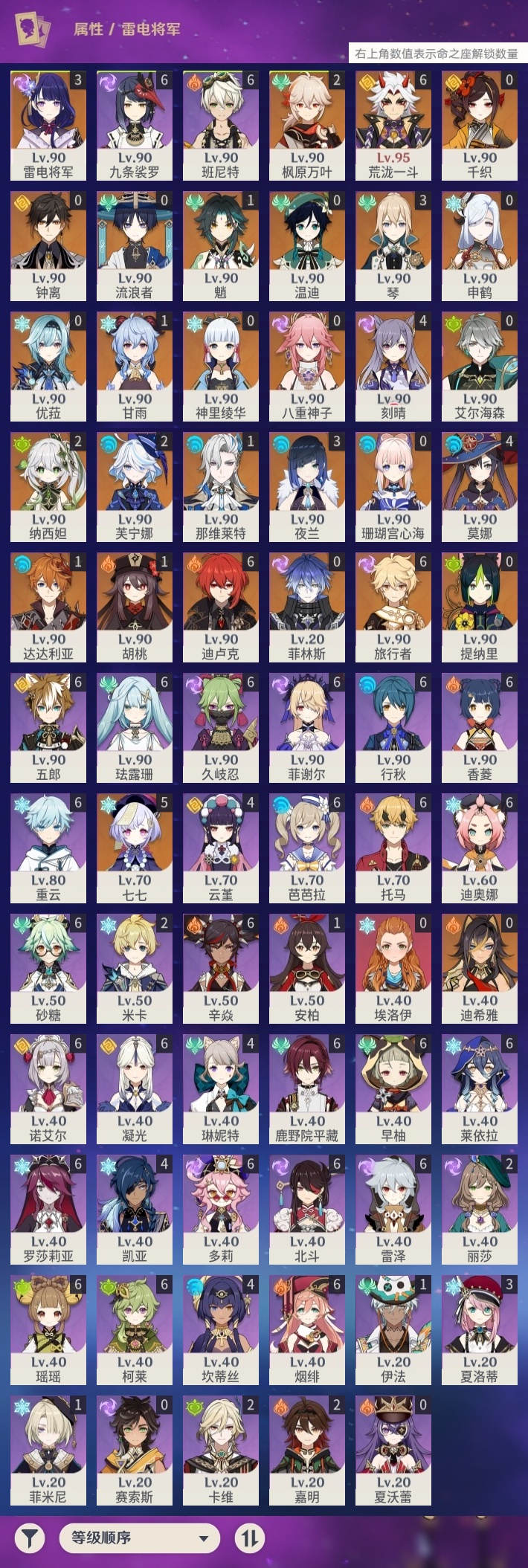 【原神】【lyys10925】冒险等级:60,五星数量:56,五星角色:迪卢克 6命荒泷一斗 6命七七 5命刻晴 4命莫娜 4命雷电将军 3命琴 3命夜兰 3命芙宁娜 2命枫原万叶 2命纳西妲 2命那维莱特 1命达达利亚 1命甘雨 1命魈 1命胡桃 1命珊瑚宫心海神里绫华温迪优菈迪希雅钟离申鹤八重神子提纳里千织菲林斯艾尔海森流浪者__五星武器:阿莫斯之弓 5精赤角石溃杵 4精和璞鸢 3精最初的大魔术万世流涌大典有乐御簾切裁叶萃光图莱杜拉的回忆不灭月华苍古自由之誓飞雷之弦振护摩之杖狼的末路松籁响起之时天空之脊天空之刃天空之翼雾切之回光薙草之稻光终末嗟叹之诗冬极白星神乐之真意贯虹之槊若水千夜浮梦白雨心弦__四星角色:班尼特 6命行秋 6命九条裟罗 6命香菱 6命久岐忍 6命鹿野院平藏 6命珐露珊 6命凝光 6命迪奥娜 6命砂糖 6命瑶瑶 6命莱依拉 6命多莉 6命柯莱 6命芭芭拉 6命早柚 6命托马 6命五郎 6命烟绯 6命重云 6命辛焱 6命诺艾尔 6命罗莎莉亚 6命雷泽 6命菲谢尔 6命北斗 6命坎蒂丝 4命云堇 4命琳妮特 4命夏洛蒂 3命米卡 2命卡维 2命嘉明 2命菲米尼 1命伊法 1命埃洛伊夏沃蕾赛索斯