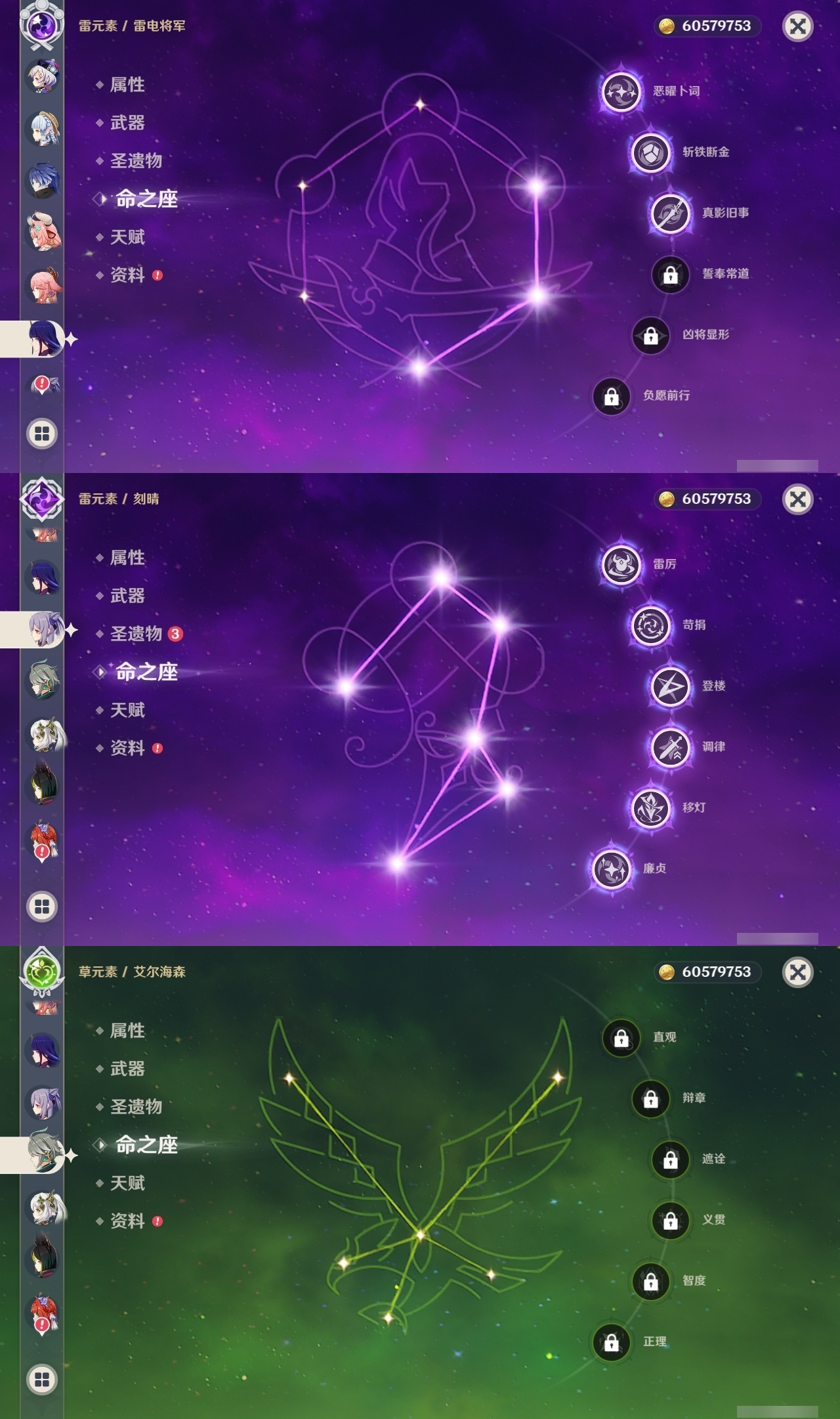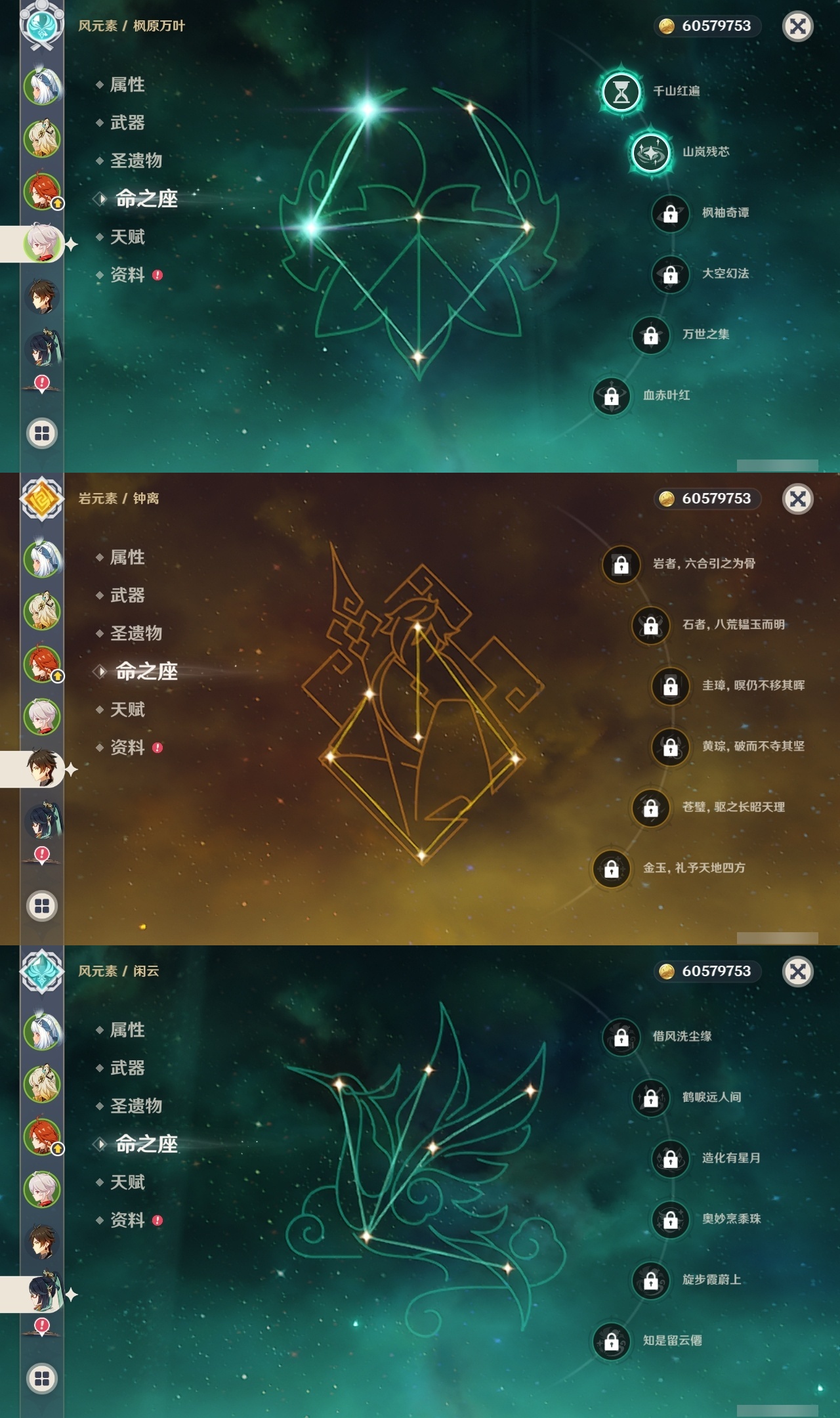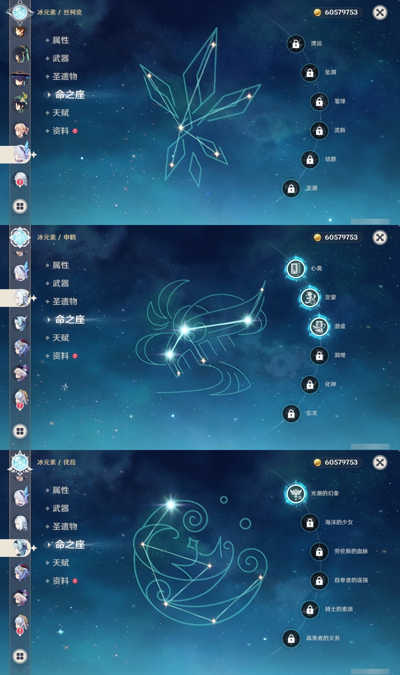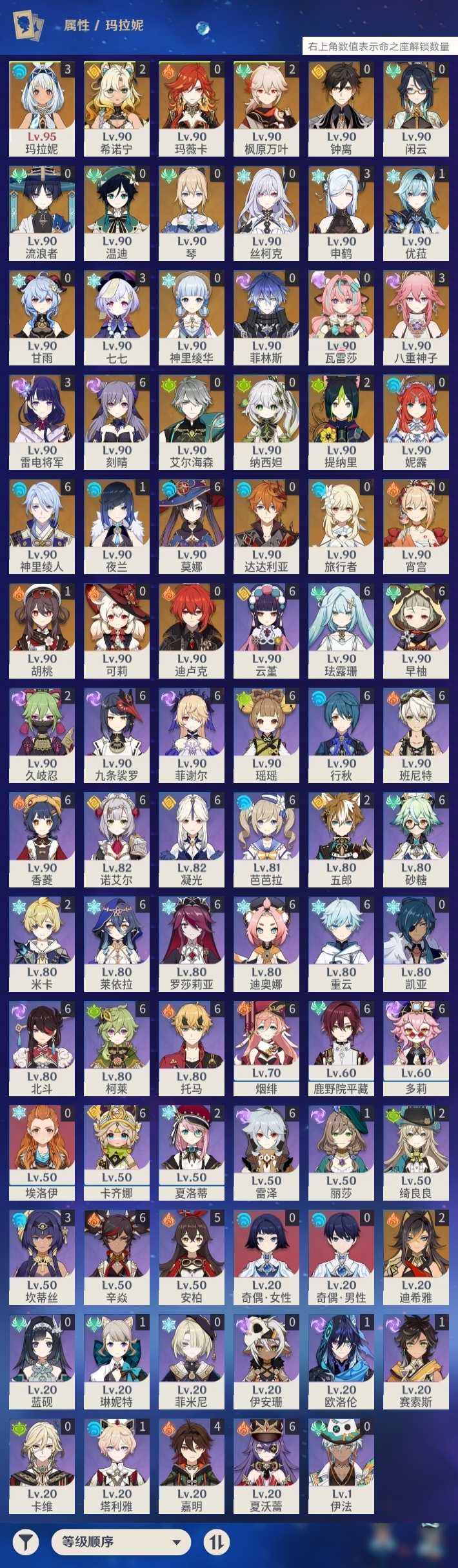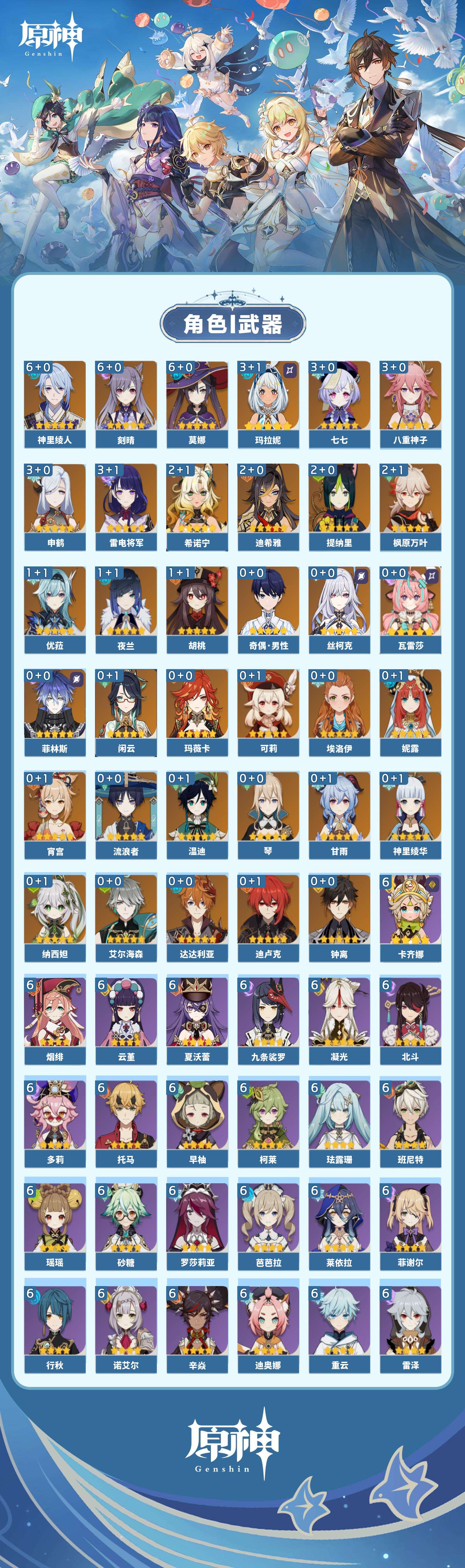 【原神】满命,冒险等级:60,五星数量:59,五星角色:刻晴 6命莫娜 6命神里绫人 6命玛拉妮 3命雷电将军 3命七七 3命申鹤 3命八重神子 3命希诺宁 2命迪希雅 2命枫原万叶 2命提纳里 2命胡桃 1命优菈 1命夜兰 1命琴神里绫华温迪玛薇卡宵宫钟离达达利亚瓦雷莎闲云丝柯克妮露纳西妲菲林斯艾尔海森流浪者迪卢克甘雨可莉__五星武器:无工之剑 5精冲浪时光岩峰巡歌鹤鸣余音阿莫斯之弓苍古自由之誓飞雷之弦振风鹰剑和璞鸢护摩之杖狼的末路磐岩结绿四风原典松籁响起之时天空之脊天空之刃天空之翼雾切之回光薙草之稻光终末嗟叹之诗若水圣显之钥千夜浮梦__四星角色:卡齐娜 6命班尼特 6命行秋 6命九条裟罗 6命香菱 6命鹿野院平藏 6命珐露珊 6命凝光 6命迪奥娜 6命砂糖 6命瑶瑶 6命莱依拉 6命多莉 6命柯莱 6命芭芭拉 6命云堇 6命早柚 6命托马 6命烟绯 6命重云 6命辛焱 6命诺艾尔 6命罗莎莉亚 6命雷泽 6命菲谢尔 6命北斗 6命夏沃蕾 6命嘉明 4命坎蒂丝 3命久岐忍 2命绮良良 2命米卡 2命五郎 2命夏洛蒂 2命欧洛伦 1命琳妮特 1命塔利雅 1命赛索斯 1命埃洛伊奇偶·女性奇偶·男性卡维蓝砚菲米尼伊法伊安珊